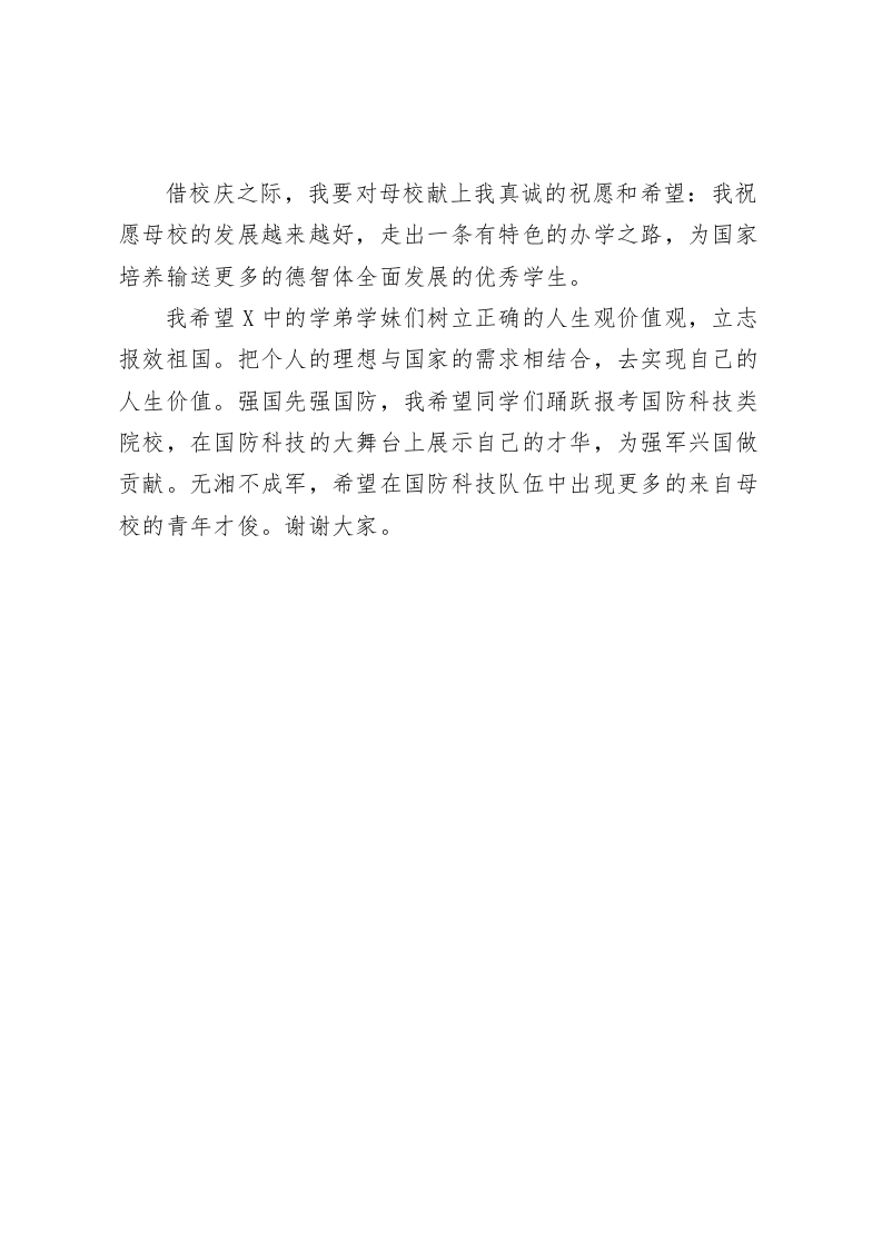 校友在XX市第X中学建校七十周年庆祝大会上的发言:七秩薪火传使命一生科研强国防此内容为付费资源,请付费后查看