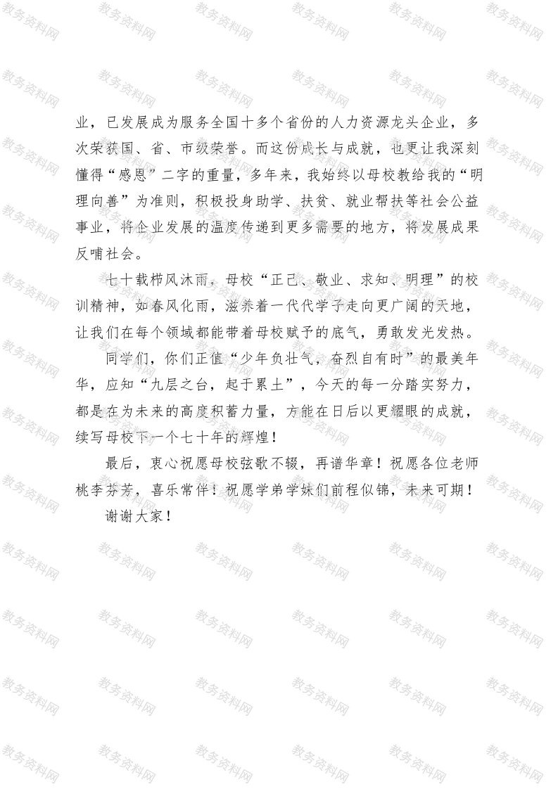 校友在XX市第X中学建校七十周年庆祝大会上的发言一七秩教诲铭心万里征途感恩尊敬的周炜书记、云河校长,各位领导、各位老师、校友们、同学们:大家上午好!我是XX人力资源服务管理股份有限公司的杨晓青,非常荣幸在母校七十华诞之际,作为校友代表站在这里,与大家共同见证这份喜悦与荣光。首先,请允许我代表全体校友,向母校致以最诚挚的祝贺!向辛勤耕耘、立德树人的各位师长致以最崇高的敬意!站在这里,往昔岁月历历在目。于我而言,三中不仅是一个传授知识的殿堂,更是品格的塑造场、人生的起锚地。在这里,我遇到了指引人生的师长,结识了并肩奋斗的伙伴,在懵懂岁月里建立起面向未来的自信,看见了人生更多的可能与光亮。我愈发体会到,教育的伟大从不在知识的单向传递,而在以微光点燃梦想、以品格塑造人格、以智慧启迪心灵。正如《道德经》所言“天下难事,必作于易;天下大事,必作于细”,母校当年教给我的,正是这份从细微处积累、于平凡中坚守的定力,让我在潜移默化中认识自我、发现价值,获得了终身受益的精神底色与人生视野。如今回望,我既深感庆幸,也始终心怀感激。带着这份积淀,我走过了毕业后的四十余年,从基层踏实积累,到主动跳出舒适圈、创办湖南华顺,如今我所创立的企