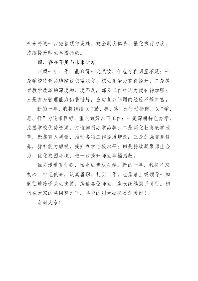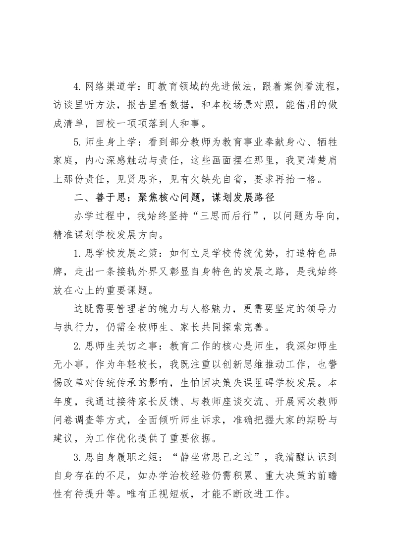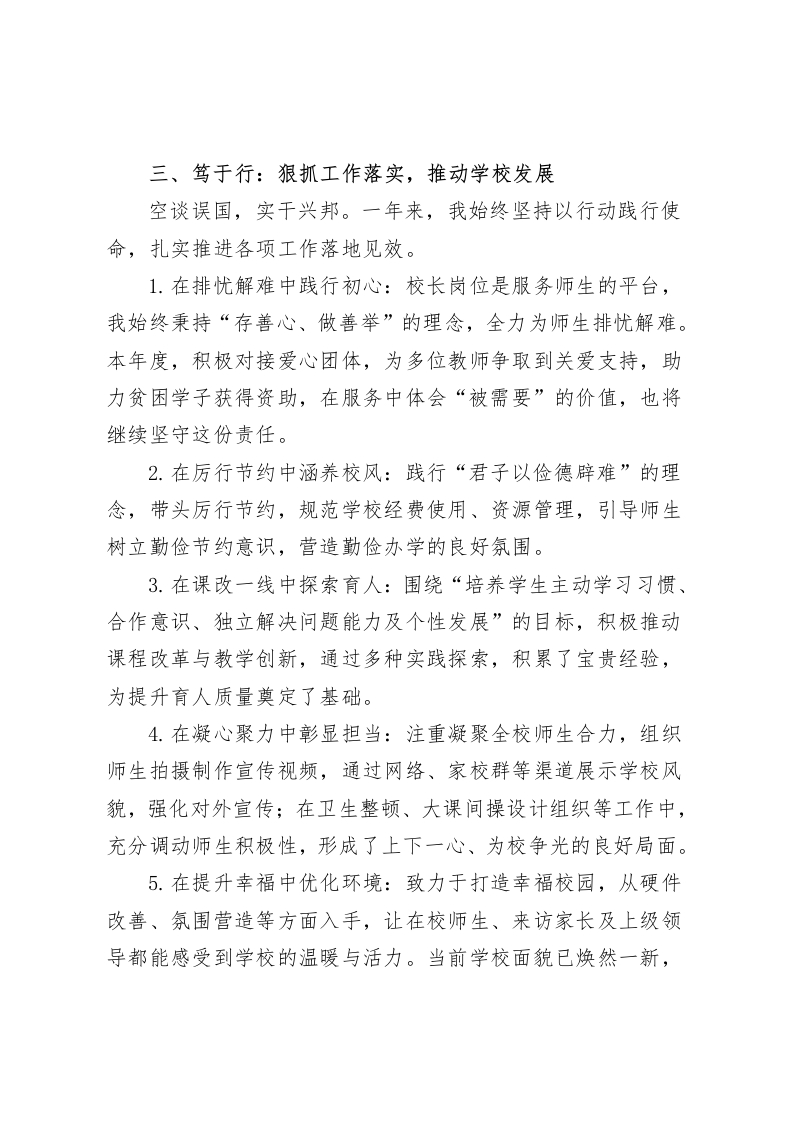 校长年度述职报告:以“勤”治学、以“思”谋路、以“行”办事各位领导、老师们:大家好!过去一年,我始终以“勤于学、善于思、笃于行”为行动准则,立足校长岗位,扎实推进学校各项工作。现将本年度履职情况向各位作详细汇报,请予评议。一、勤于学:筑牢履职根基,提升办学素养作为学校发展的“领头雁”,我深知学习是履职尽责的前提,始终坚持多维度、全方位学习提升。1.岗位实践学:在校长岗位上,盯住学校关键环节,钻研办学治校的规律,管理里跑流程,统筹里找细节,师生的支持配合看在眼里,现场处理问题,经验往上攒,人在实践里往前走。2.书本理论学:把薄弱的地方补起来,安下心读教育政策,读办学管理,读教学改革,条文对照场景,概念拉回一线,能用的先试,读得多了视野开了,做事更有方向,效率抬上来。3.教学一线学:走进课堂,坐后排看节奏,参与备课磨教案,进实验室看操作,同事的素材都翻过,在教学实践中我收获了充实与成长,也更精准把握了学校教学现状。