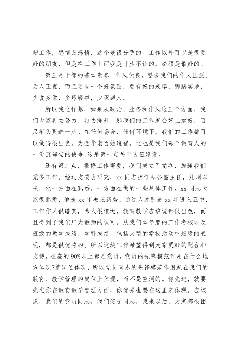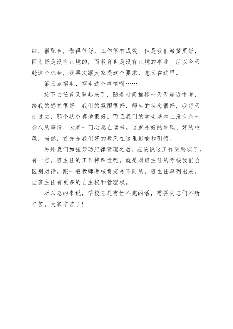 校长在行政班子会议上讲话,主要讲了3点内容同志们:我们一起合作共事进入了第三个年头,大家一起应该说很愉快,工作卓有成效。但是为了适应学校的发展要求和新形势的要求,我们需要不断的学习、不断的努力和不断的提升。所以今天我讲第一点,加强自身队伍的建设,就是我们班子的建设。第一是政治上更坚定。具体地讲,就是与党中央大方向保持一致,这是个大前提;小的与学校的大局利益保持一致。政治上就是“两个一致”来体现:与党中央的大方向走,与我们学校的大局利益保持一致,团结、协作。我来的时候记得第一次讲话的时候就很明确,我们要求班子团结第一、工作第二。因为团结是为了更好地工作,更好地工作必须以团结为基础,所以这个“一”和“二”是不矛盾的。然后主动、肯干,还要实干,还要高效,还要加强学习,不断提升自我修养,这是对班子同志政治上的要求。其次是业务上更精湛,它的要求很高,因为用精湛这个词。具体地讲啊,我们不同的岗位、不同的行业,应该讲有不同的要求。我们教育人我这样想,教学是能手,班主任是好手,我们的事务管理或者我们的行政管理是高手,整个要求就一句话:教育教学管理工作是一把手,应该给我们全体教师起一个示范作用。我这个人为人处事,打交道也好,交朋友也好,我工作