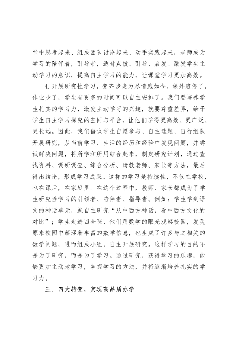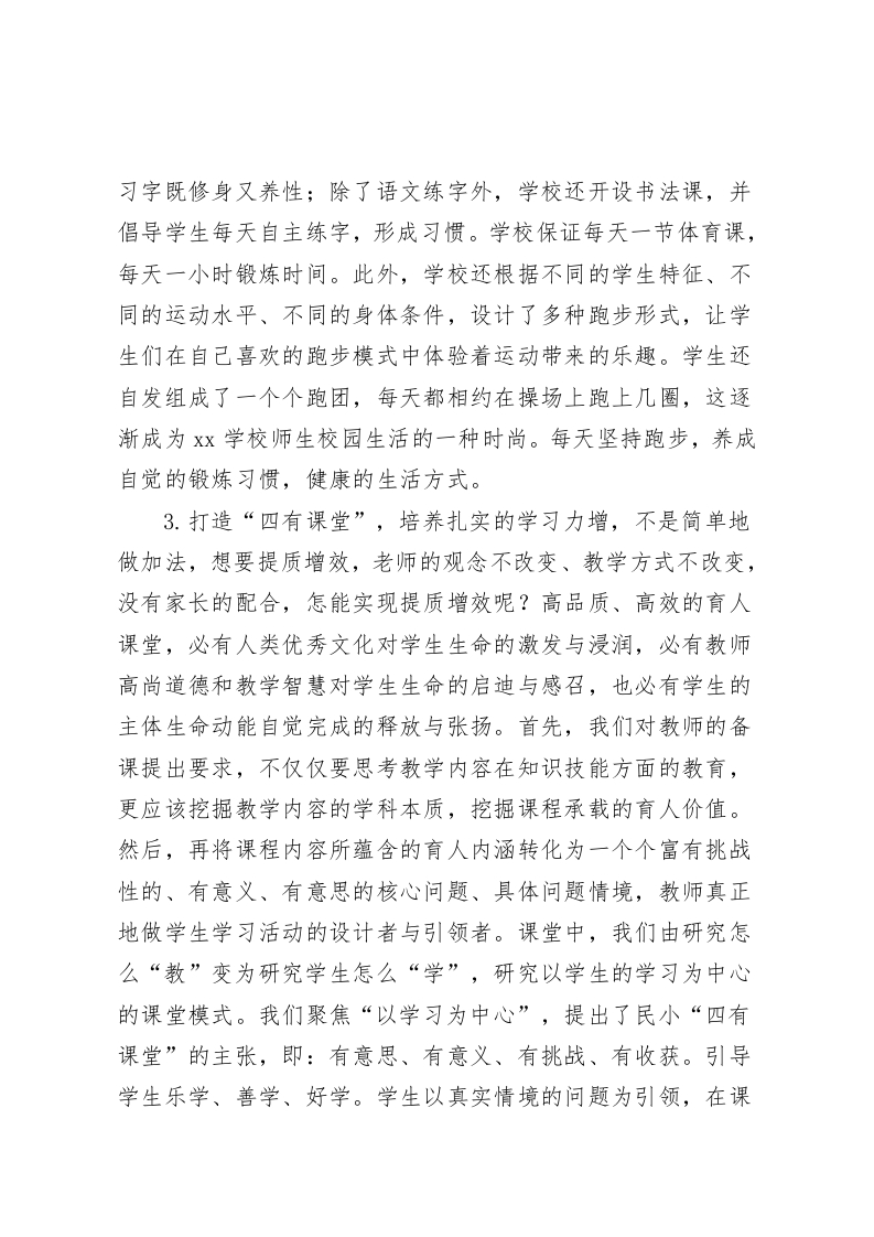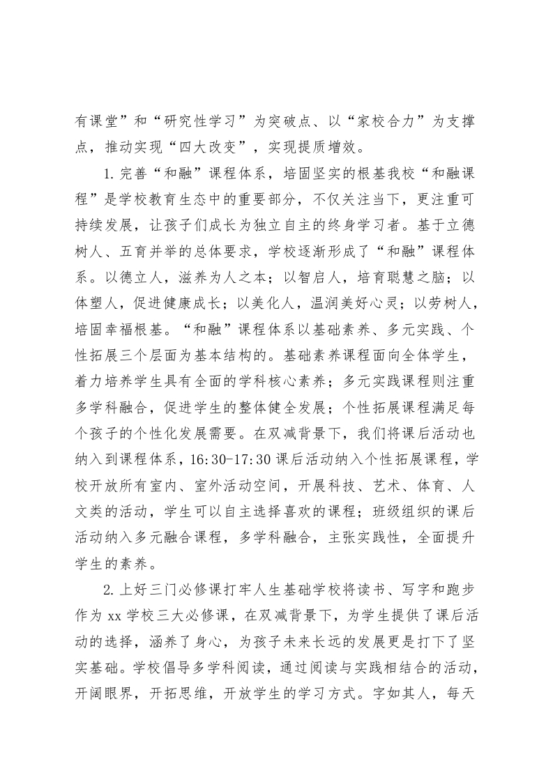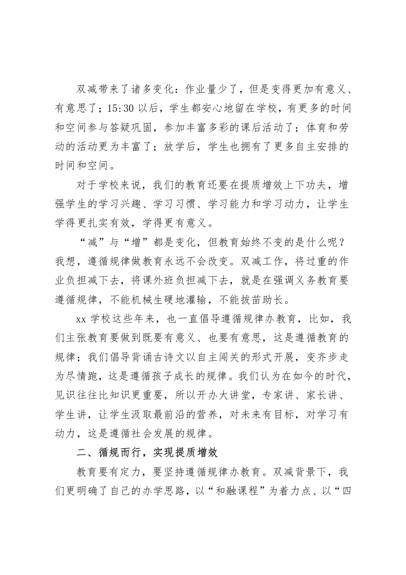 学校落实双减特色亮点总结,校长汇报循规而行,提质增效各位领导、专家、同仁:双减之下,我们高度重视、了解需求、回应关切、认真落实。同时我们认为,学校不能仅仅满足于完成上级政策、指标要求,这只是底线。作为教育者,我们更应该将双减工作与办学理念、发展路径相结合,坚持遵循教育规律,努力营造良好的育人生态,优化学生学习成长的环境,促进学生全面发展,更好地应对未来社会的变化。一、双减引发对教育的再思考我们的教育就是为孩子未来无限的可能播下希望的种子。因此,一直以来学校都坚持为学生提供适合的教育,提供更多可能的平台,鼓励变“齐步走”为“尽情跑”,给每个孩子自我发展的空间,让每个孩子都在自己最好的方面,争做最好的我。双减落地,让我们加深了对教育的理解,更坚定了办学的方向。有舍才能有得,先舍才能后得。面对双减,我们要思考并处理好“减与增”的关系。对于学生来说,减的是过重的作业负担,减的是课外培训的负担,学生不再把大量的时间浪费在课外班超前的知识学习中,不浪费在刷题的困境中。