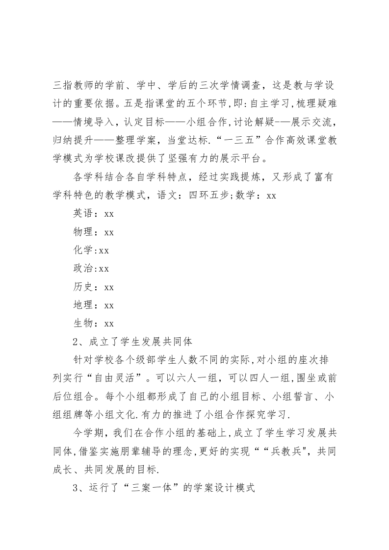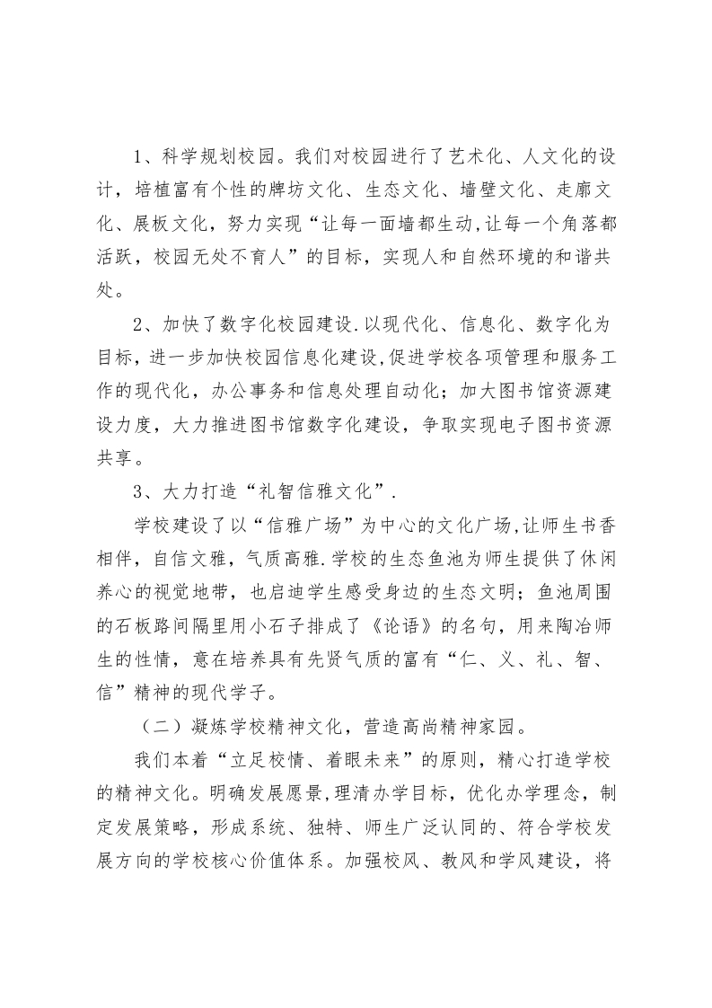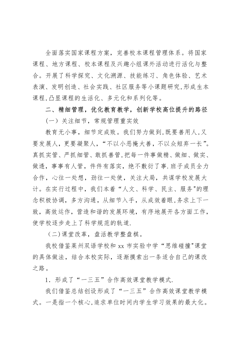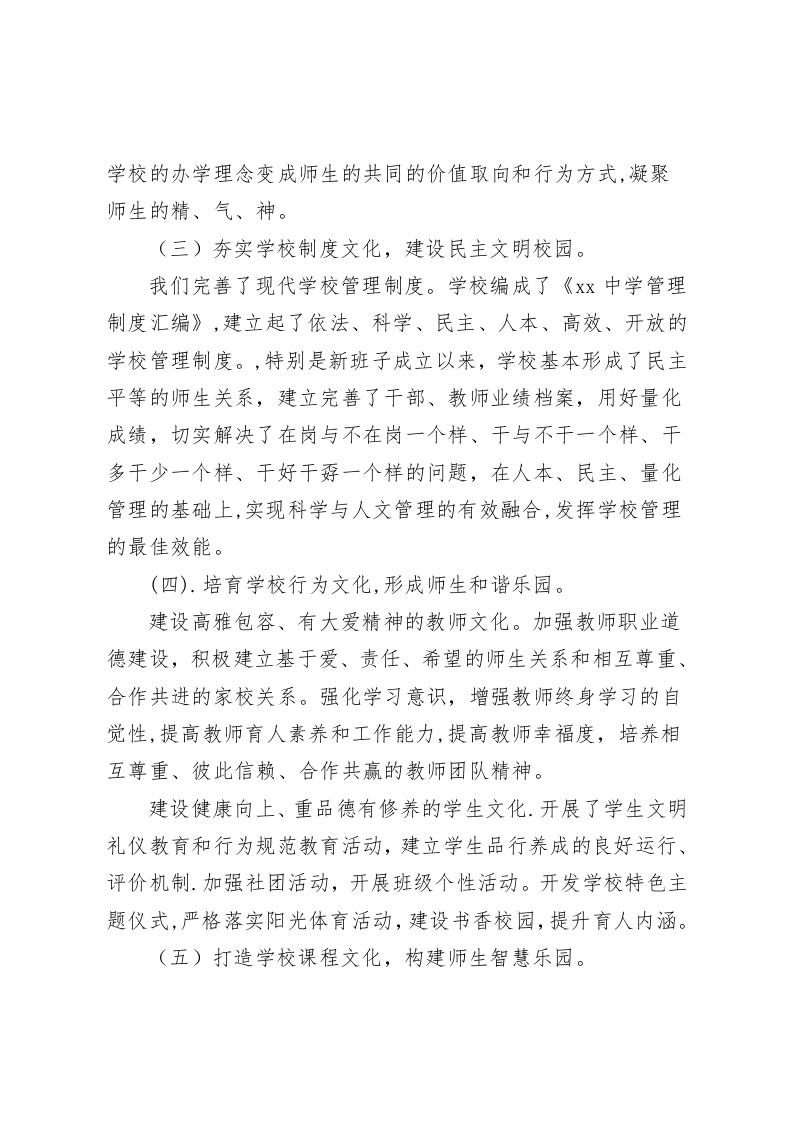 学校三年课改工作汇报,校长发言持续增力,打造幸福教育,规范创优,学校高位提升尊敬的各位领导,大家好!首先,我代表xx中学全体师生对各位领导来指导表示热烈的欢迎!三年来,Xx中学在市教育局的关心下,紧跟全市教改的步伐,极力推行素质教育,坚持“为每一位学生终生幸福奠基”的办学理念和“以人为本、科研兴校、求实创新、和谐发展”办学思想,以“让每一个孩子成人成才,打造和谐幸福学校”的为目标,以不断提高教育质量和教育幸福指数,以“和谐课堂、幸福校园”建设为重点,咬定质量,持续增力,努力打造幸福教育,全力促进学校高位提升,实现学校的科学快速发展。一、高端定位,优化发展环境,夯实学校高位发展的根基1、科学规划,持续投入,提升学校发展硬实力。在前期综合楼、宿舍楼建设的基础上,今年以来,我们以学生的发展为本,从有利于学生的成长出发,粉刷改造了高标准的校门、设置了迎门电子牌、建成了陶冶师生性情的生态鱼池,制作了灵活方便的宣传栏,建造了肥城xx教育文化牌坊等,这些为师生的工作学习生活既创设了舒适的环境,又搭建了良好的展示平台。2、凝聚文化,丰富内涵,提升学校发展软实力(一)提升学校环境文化,建设师生美好家园。
