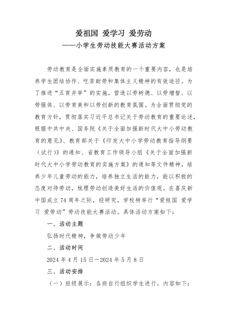 爱祖国爱学习爱劳动小学生劳动技能大赛活动方案劳动教育是全面实施素质教育的一个重要内容,也是培养学生团结协作、吃苦耐劳和集体主义精神的有效途径。为了推进“五育并举”的实施,营造以劳树德、以劳增智、以劳强体、以劳育美和以劳创新的教育氛围。为全面贯彻党的教育方针,贯彻落实习近平总书记关于劳动教育的重要论述,根据中共中央、国务院《关于全面加强新时代大中小劳动教育的意见》、教育部关于《印发大中小学劳动教育指导纲要(试行)》的通知、省教育工作领导小组《关于全面加强新时代大中小学劳动教育的实施方案》的通知等文件精神,培养少年儿童劳动的能力,培养独立生活的能力,能以积极的态度对待劳动,梳理劳动创造美好生活的价值观。在喜庆新中国成立74周年之际,经研究,学校特举行“爱祖国爱学习爱劳动”劳动技能大赛活动。具体活动方案如下:一、活动主题弘扬时代精神,争做劳动少年二、活动时间2024年4月15日-2024年5月8日三、活动安排(一)班级展示:各班自行组织学生进行,内容如下: