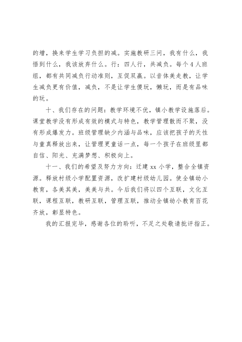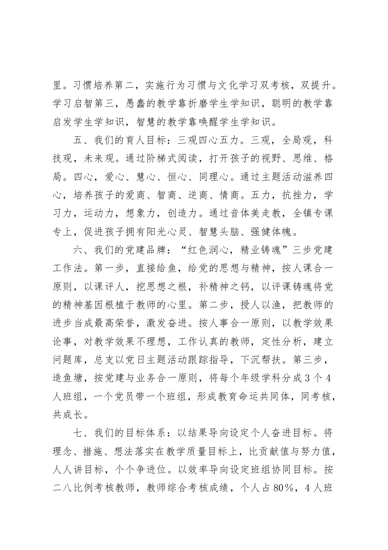 学校校长工作汇报,主要讲了11点内容各位专家、领导、同仁:你们好!乡村振兴,教育是原动力。xx学校以“遇见最好的自己,做美的教育”为工作追求,致力于让每一个教师发自内心的热爱工作,推动xx教育高质量发展。具体汇报如下:一、我们的基本情况:中心学校管辖范围,有10所小学,一所镇小,x所村小,均属完全小学。共有xx名小学生。幼儿园有xx所,x所中心幼儿园,x所村级校中园,共有xx名幼儿。我们虽没有一流的教学设施,但我们心向美好,涌动着一种积极奋进的能量。中心学校所属校园,有xx名小学教师,xx名幼儿教师。我们全体教师虽还不够聪明,不够智慧,但我们足够努力。二、我们的使命:努力把教育变得有意思,把学生成长变得有意义。教是传授,育是智慧,学是知识,习是体验,力求教与育融合,学与习贯通。三、我们的愿景:追求一马当先,形成乡村教育的独特价值与管理特色。目前,我们是区级阅读示范学校,区级双优组织示范学校,区级教学质量先进集体,区级幼小衔接示范学校。成绩属于过去,我们拥有教育的诗与远方,未来更可期。四、我们的教育价值观:价值取向第一,让每一个孩子学会讲100个中华传统文化故事,将真善美的种子埋在孩子的心