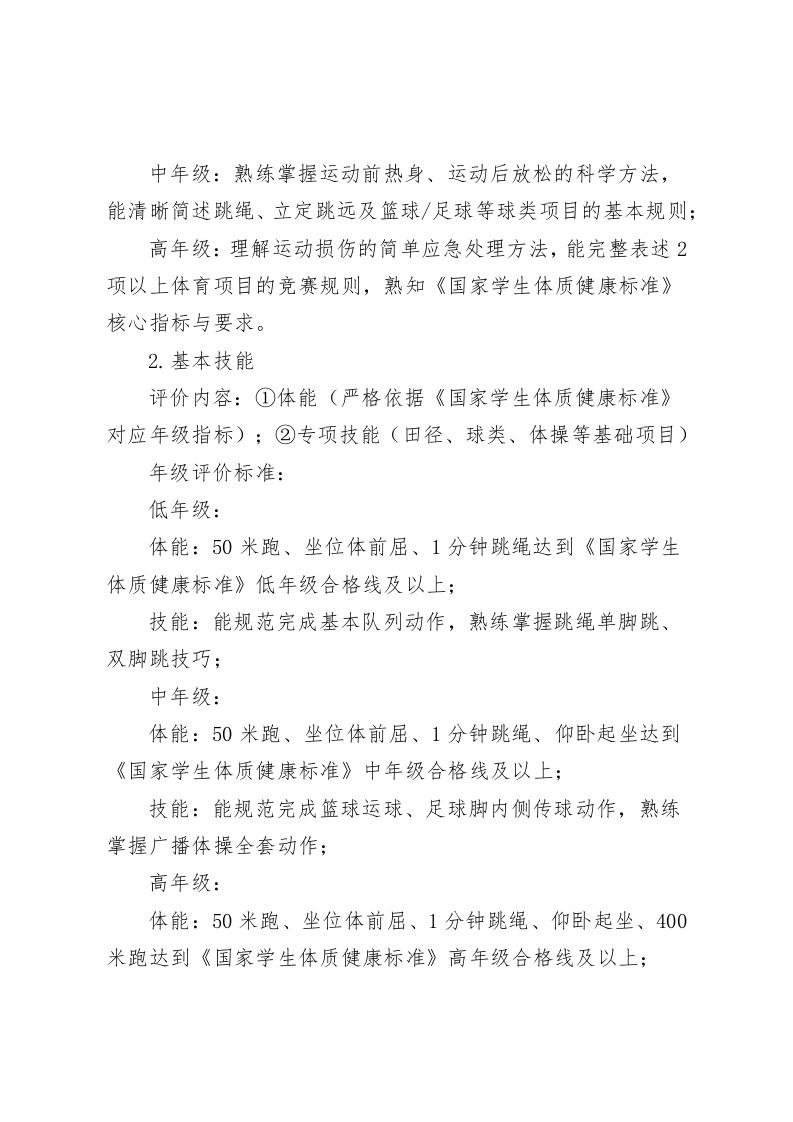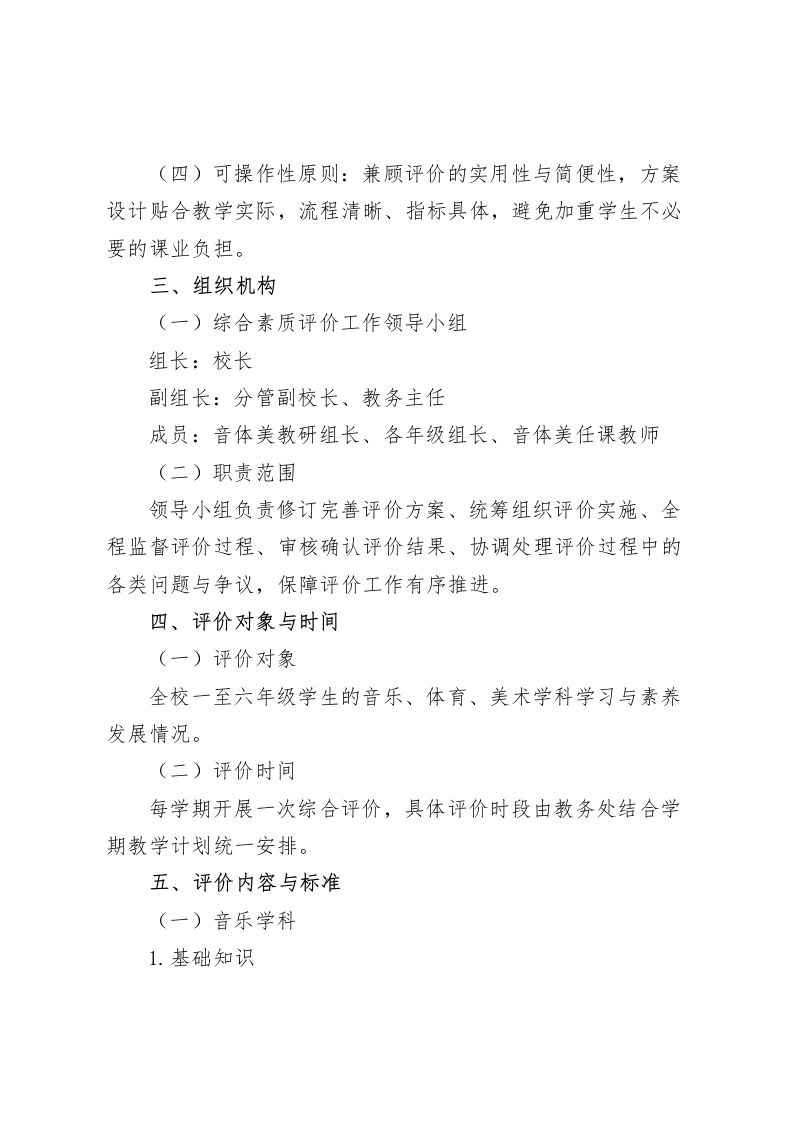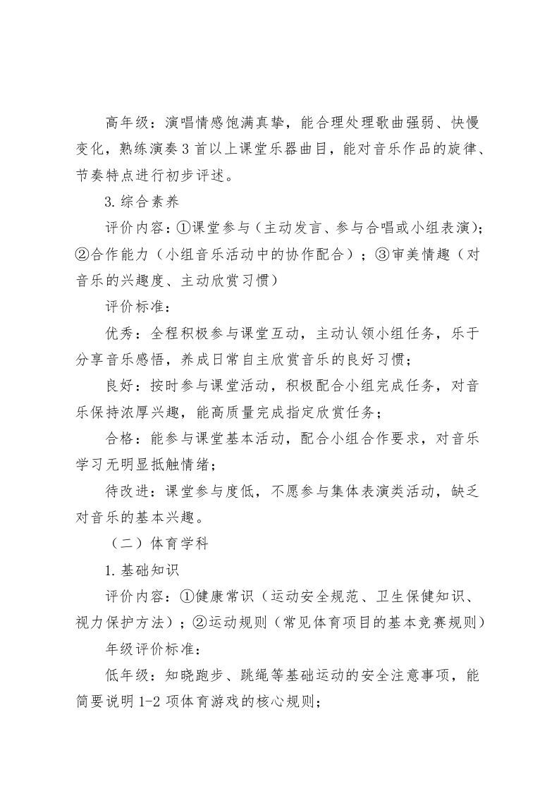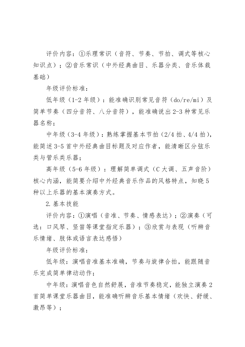 学校音体美综合素质评价方案(2025年修订版)为深入贯彻党的教育方针,全面落实素质教育要求与立德树人根本任务,促进学生德智体美劳五育并举、全面发展,依据《关于深化教育教学改革全面提高义务教育质量的意见》《国家学生体质健康标准》等相关政策文件精神,结合我校办学实际与学生发展需求,特修订本音体美综合素质评价方案。一、指导思想坚持以学生发展为本,遵循教育教学规律与学生身心发展特点,构建科学规范、导向明确的音体美综合素质评价体系。通过评价改革推动教师优化教学策略,激发学生学习内驱力,培育学生审美情趣、体育精神与艺术素养,助力学生成长为身心健康、素养全面的时代新人。二、评价原则(一)全面性原则:评价内容涵盖音乐、体育、美术三大学科的基础知识、基本技能与综合素养,兼顾知识掌握、技能提升与素养培育,关注学生全面发展状态。(二)发展性原则:聚焦学生成长轨迹与进步空间,坚持过程性评价与终结性评价有机融合,以评促学、以评促长,助力学生持续发展。(三)科学性原则:评价标准细化明确,评价方法科学多元,评价程序规范严谨,确保评价结果客观公正、具有公信力。