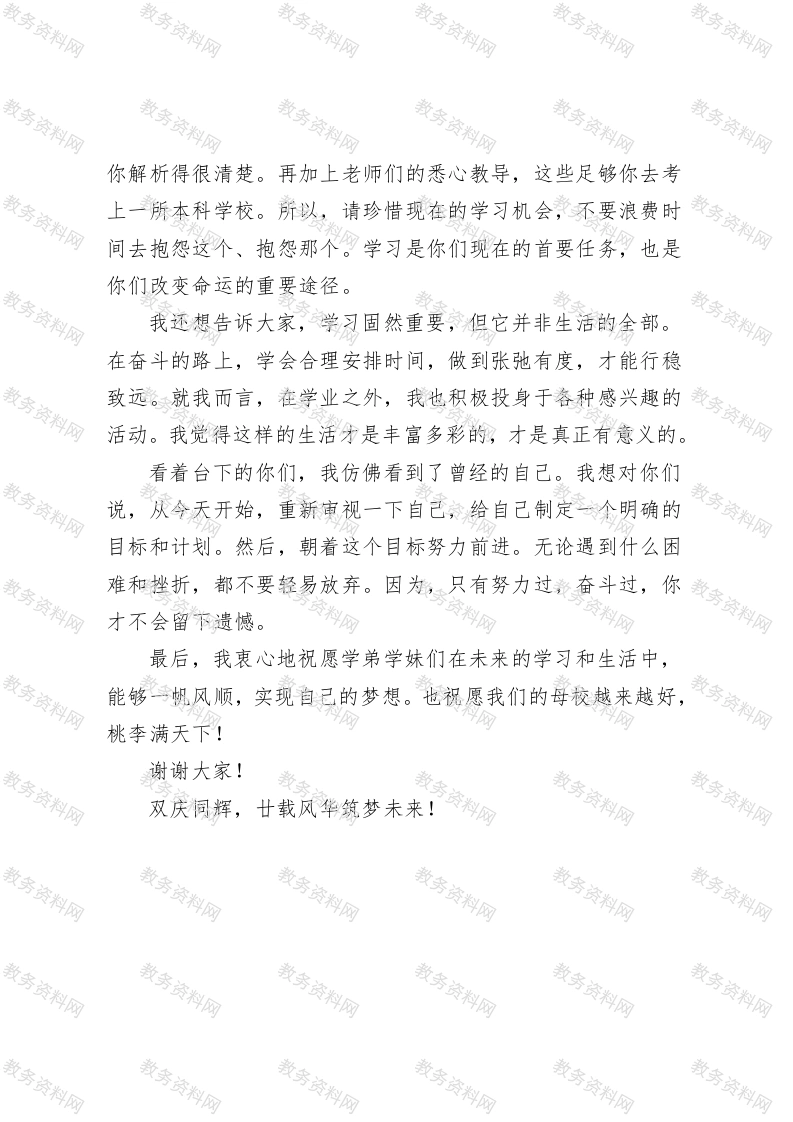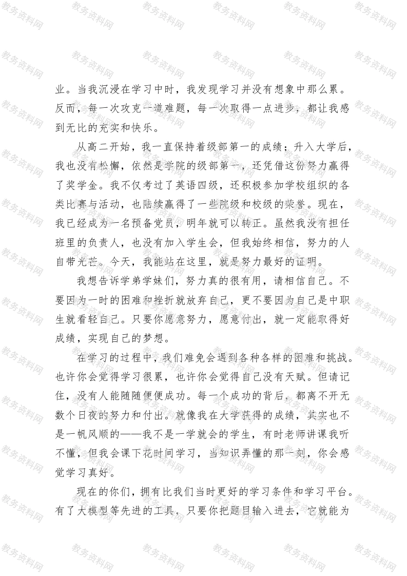 优秀毕业生在XX应用技术职业中等专业学校建校20周年庆典上的发言一努力,为中职生开启美好未来尊敬的各位老师、亲爱的学弟学妹们:大家好!我是济南应用学校20XX届毕业生韩越,现在就读于山东政法学院。很荣幸能在母校20周年校庆这个特别的时刻,作为优秀学生代表站在这里和大家分享我的故事。首先,请允许我向培育我的母校,向辛勤教导我的老师们,致以最衷心的感谢!没有济南应用学校,就没有现在的我。是这里的一草一木、一桌一椅见证了我的蜕变,是老师们的悉心教诲和鼓励支持,让我有了勇气和动力去追逐自己的梦想。现在国家大力发展中职教育,为我们提供了广阔的发展空间和无限的可能。我相信,在场的很多同学和曾经的我一样,都想借这个平台考上一所理想的大学,开启美好的未来。回想起高中时光,我感慨万千。刚进入中职时,我和很多同学一样,没有目标,没有梦想,成绩更是一塌糊涂。英语水平只停留在小学阶段,语文连作文都写不好。我很清楚自己并不聪明,但我不甘心就这样浑浑噩噩地度过高中。我告诉自己,我要做最努力的那一个。那时候,我从未想过自己一定要考上山东政法学院。我只是告诉自己,要尽自己所能,一步一个脚印地努力学习。每天我都按照规律的作息时间,认真听讲、做好笔记、按时完成作