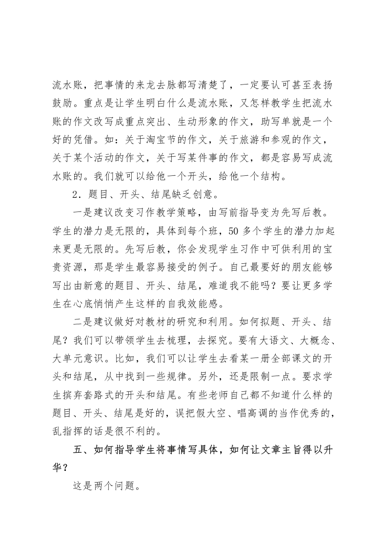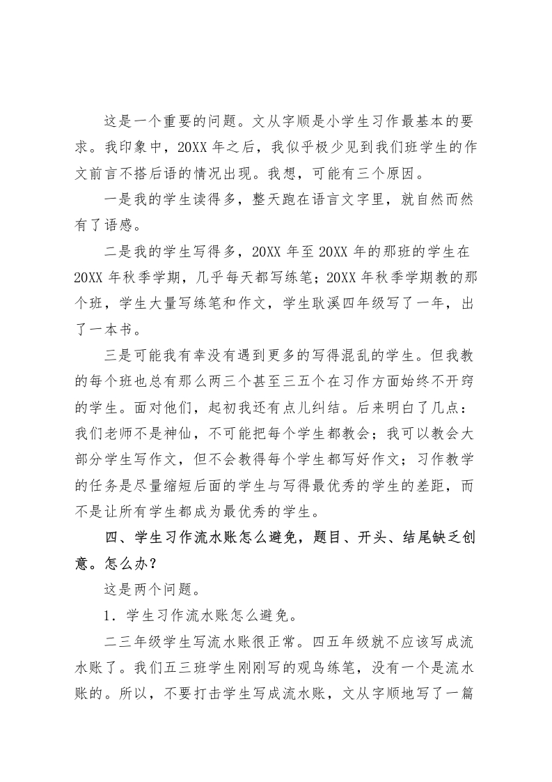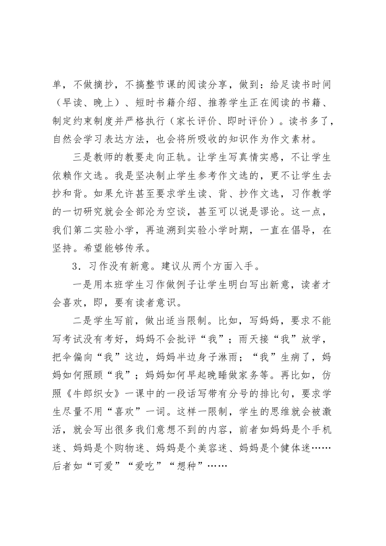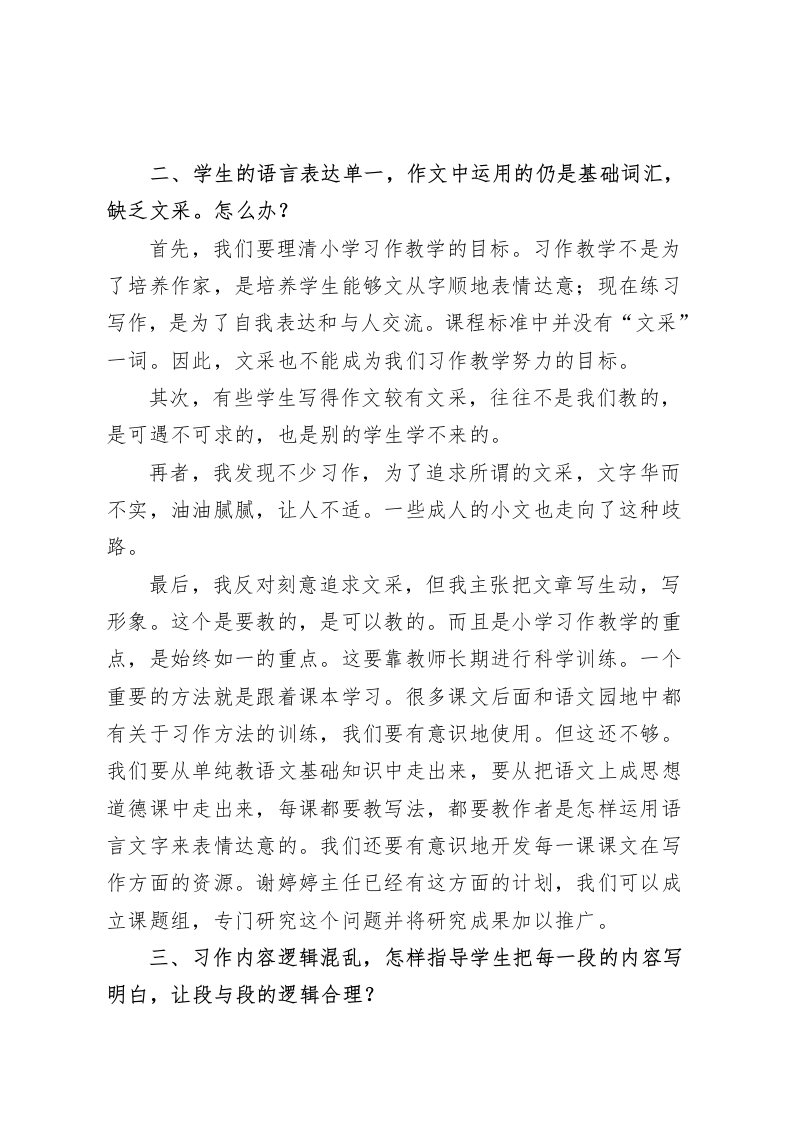 在“菁菁语文”论坛上的作文:教得幸福,写得愉快上午,第二实验小学所在联盟校举行“菁菁语文”论坛语文集体教研活动。X校长、X主任邀我解答老师们提出的几个关于习作的问题。下面是我的解答。一、学生不会审题,学生习作没素材,不知道写什么,习作没有新意。怎么办?答:这其实是三个问题。1.学生不会审题,可能的原因包括:基础不好,看不懂:学习马虎,没认真看;要求不明,产生歧义;学生习惯于依靠作文选,尚未养成自己动脑习作的习惯等等。建议找到原因,对症下药。2.习作没有素材,不知道写什么。建议做三个方面的工作。一是培养学生留心观察的习惯。注意,是留心观察,而不是细致观察。比如,经常让学生写有关身边人、事、物、景的练笔,注意,是写实,不是臆想。比如,带领学生实地观察,然后习作。昨天,我刚刚结束连续七次的校园观鸟。我每天带8个学生,七点到校,在校园里看鸟影,听鸟声,持续时间50分钟左右,晚上写一则练笔。20XX年,我让学生在校园里找一种喜欢的植物,持续观察一年,把观察所得写成练笔。这些都是很好的方法。二是让学生多读书,多积累。我近年来采取的是自由阅读、无打扰阅读的方式。主要做法是不打卡,不做笔记,不做导读