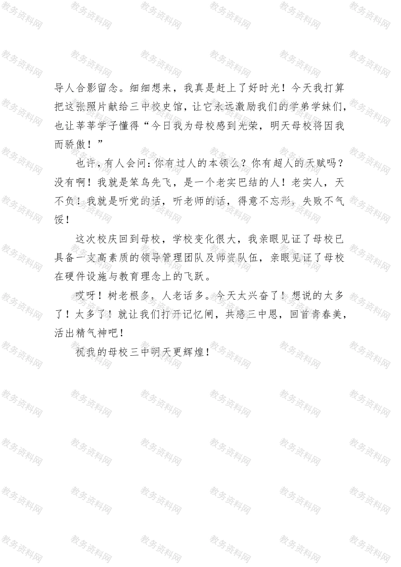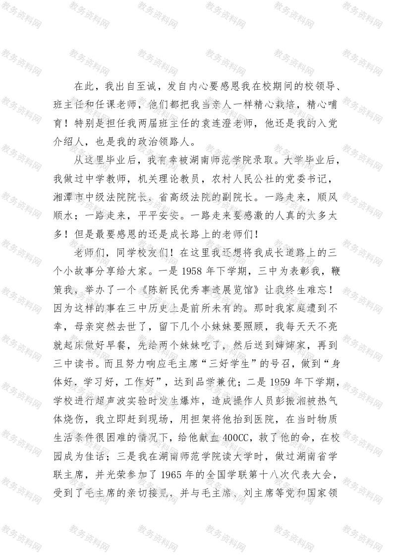 在XX市第三中学建校七十周年庆祝大会上的发言尊敬的各位领导、老师们、校友们:上午好!丹桂飘香,风景如画,我们重逢了!真是群贤毕至,少长咸集,见了你们格外亲啊!有道“一年好景君须记,正是橙黄橘绿时”。但我们今天可是“一生美景君须记,正是桃李芬芳、云霞灿烂时啊”!为什么?因为今日在这里我们大家有个最亲切的称呼一一“校友”!而且是湘潭市三中的校友!这里的每一寸土地,每一张课桌,每一株小草,每一棵树木,都见证我们的成长,都让我们特依恋,最想念,倍感温馨!一句话,三中是我们的母校,母亲!我叫陈新民,一个三中围墙底下东坪镇的穷苦娃娃。父亲陈桂生是个赤贫的码头工人,母亲是善良的家庭主妇。我小学还没有毕业就出外做工,为全家的生活而奔波劳碌了!有一天,我猛然发现这荒凉的长岭上建造琼楼玉宇了,毛主席共产党要把中学办到我的家门口了!教育不再是有钱人子弟的乐园,而是向工农子女开门了。于是我发愤努力,咬紧牙关于1956年考入三中了,我坐在教室里最大的愿望就是要读好书,要对得起党,对得起毛主席!于是我初中头一期就当上了团支部书记,高中一年级我就完成了人生观、世界观的飞跃,在老师的教育下,在同学们的帮助下,我翻开了自己生命史中最光辉的一页,1960年5月20日(19岁时)加入了伟大的中国共产党,将自己前进的步伐纳入了无产阶级先锋队的序列!