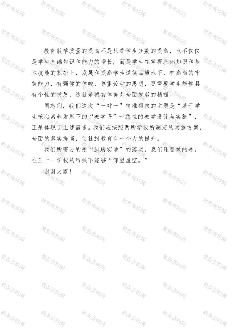 在XX市三十一学校对社旗县苗店镇中心小学“一对一”精准帮扶活动启动仪式上的讲话各位领导,老师们,大家上午好!今天,我们迎来了X市第三十一学校对社旗县苗店镇中心小学的“一对一”精准帮扶活动的启动仪式。这是国家对我们薄弱学校帮扶的优惠政策,也是X市三十一学校优质学校对我们帮助的具体落实与实施,我们对三十一学校领导和所带领的优秀团队的到来表示深深地感谢!在活动启动仪式上,我代表社旗县教育体育局对社旗县苗店镇的老师们提出六点建议:一、要坚持崇尚科学精神。科学精神不仅仅体现在理科学科教学中,而是体现在教师教育教学、学生学习、教师专业成长的各个方面。语文老师要研究每一个汉字,因为每一个汉字都凝结了中华民族古代乃至现代人们的智慧,这种智慧只有中国人才有资格说出其自古及今的演变;每一个成语典故都汇聚着中华民族的精神传承,是对当时也是对现在和未来每一个中国人做人、做事所形成的人生观、价值观和世界观的深度思考;数学老师对于数学思想、数学基本规律、数学基本方法等每一个步骤、环节都要经过细致的研究和分析,因为这不仅仅是前人智慧的结晶,更需要我们的传承和发展,这种发展就体现在尊重学生身心发展的规律,