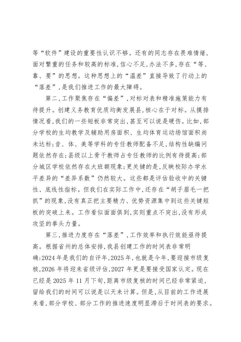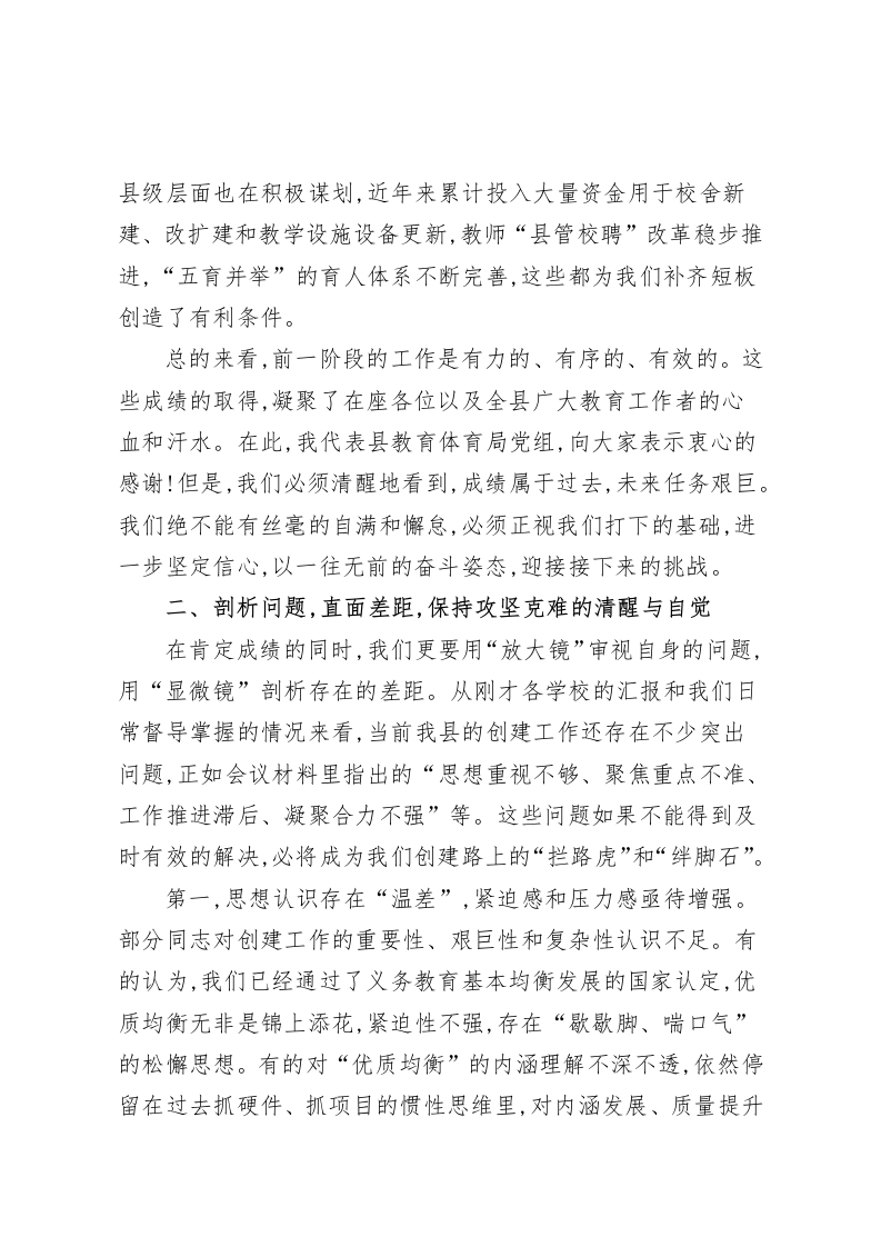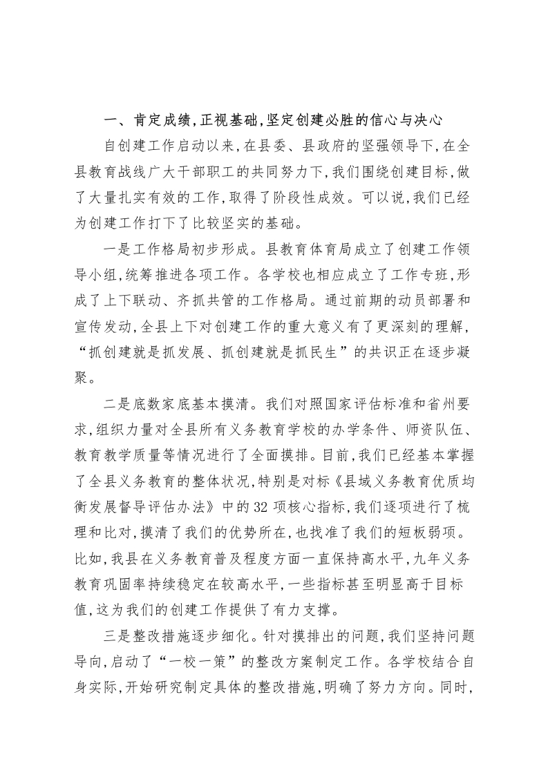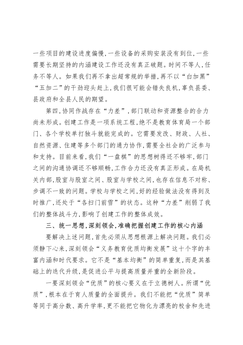 在XX县教育体育局创建义务教育优质均衡发展县调度会议上的讲话(精品)同志们:今天,我们在这里召开全县创建义务教育优质均衡发展县调度会议,主要任务是深入分析当前我县创建工作面临的形势,精准查找存在的短板与不足,进一步统一思想、压实责任、强化措施,对下一步的创建攻坚工作进行再动员、再部署、再加压。刚才,教育督导股和教育股的XX同志分别对创建指标进行了解读,并提出了具体的工作建议,各学校的负责同志也围绕各自存在的短板弱项作了汇报,讲得都很好,很实在,问题找得准,思路也清晰。这充分说明,我们前期的工作是有成效的,大家对这项工作是上了心的。创建义务教育优质均衡发展县,是党中央、国务院在新时代背景下,为推动义务教育由基本均衡向优质均衡迈进作出的重大决策部署,是满足人民群众从“有学上”到“上好学”美好期盼的必然要求,更是推动我县教育事业高质量发展、提升区域综合竞争力的关键之举。这项工作,对于XX县而言,不仅是一项必须完成的政治任务,更是一项关乎长远发展的民生工程和民心工程。我们必须清醒地认识到,这项工作的成败,直接关系到X县未来几十年教育发展的基本格局,关系到我们能否为XX县的下一代提供一个更加公平、更高质量的教育环境。下面,我讲四点意见。
