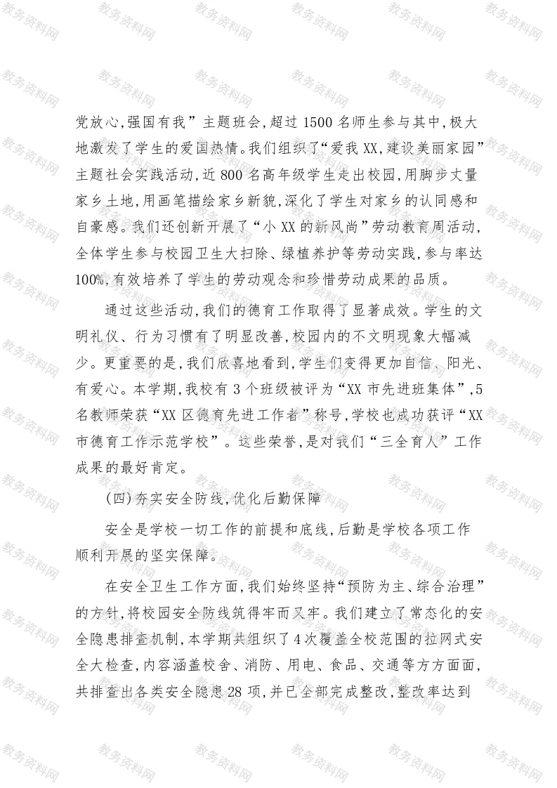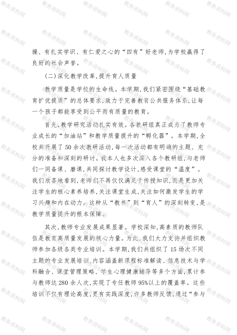 在XX小学2025年秋季学期期中总结大会上的讲话尊敬的各位老师、各位同仁:大家下午好!金秋时节,硕果飘香。今天,我们XX小学全体教职员工齐聚一堂,隆重召开2025年秋季学期期中总结大会。首先,我谨代表学校领导班子,向半个学期以来辛勤耕耘、默默奉献在教育教学第一线的全体同仁,致以最诚挚的问候和最衷心的感谢!时光荏苒,自9月1日开学至今,我们共同走过了紧张、充实而又富有成效的半个学期。本次会议的主旨,在于全面、系统地回顾与梳理半学期以来的各项工作,总结经验、表彰先进,更在于直面问题、剖析不足,从而精准擘画下半学期的工作蓝图,凝心聚力,为推动学校教育事业迈向更高质量的发展阶段注入新的、更强的动能。回首过去的两个多月,我们全体XX人同心同德,锐意进取,在政治学习、师德建设、教育教学、德育创新、安全保障等各个方面都取得了令人鼓舞的成绩。这些成绩的取得,离不开每一位教职员工的智慧与汗水,离不开大家对教育事业的无限忠诚与热爱。下面,我将从四个方面对半学期来的工作进行总结,并对下一阶段的工作提出几点思考和要求。