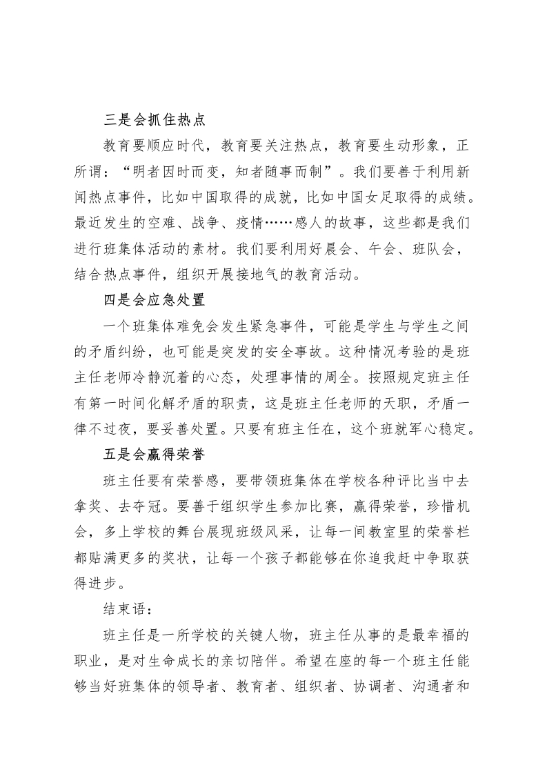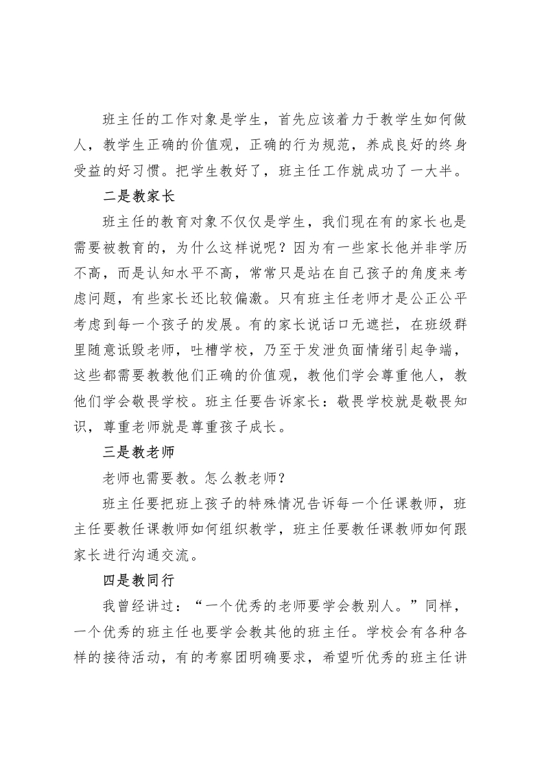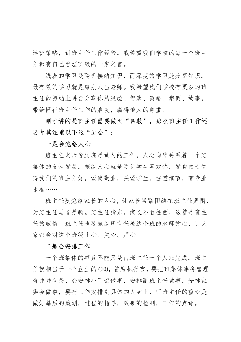 在班主任工作会议上,校长讲话班主任要学会四教和五会各位班主任老师:大家好!俗话说:“兵熊熊一个,将熊熊一窝”,一个好校长就是一所好学校,同样的道理,一个好的班主任就会带出一个好班,教出一批好孩子。班主任是一所学校重要的人物,对学生来说学生最怕的就是班主任,学生最听班主任的话;对家长来说也是非常看重班主任的,家长根本不给校长面子,但家长对班主任总会敬重几分。曾经有人问我:学校里哪个岗位最重要?我毫不犹豫回答:当然是班主任这个岗位最重要。有的同行问我:为什么班主任这个岗位最重要?我说:一所学校我这个当校长的十天半个月不在学校,学校依然能够正常运转。但是一个班的班主任倘若一个星期不在学校,这个班可能就要乱翻天了。学校的工作很多都依赖于班主任去落实,学生佩服班主任,家长信赖班主任,学校仰仗班主任。因为班主任工作重要,因此我今天参加班主任工作例会,想跟大家分享的主题是:班主任要学会“四教”和“五会”:什么是“四教”?一是教学生