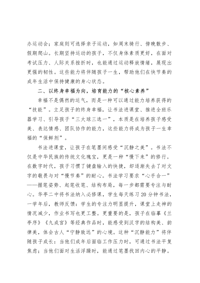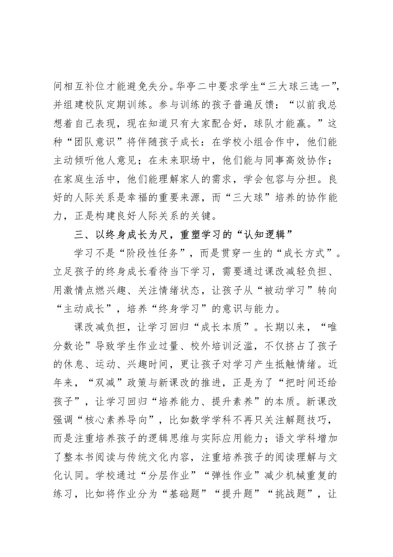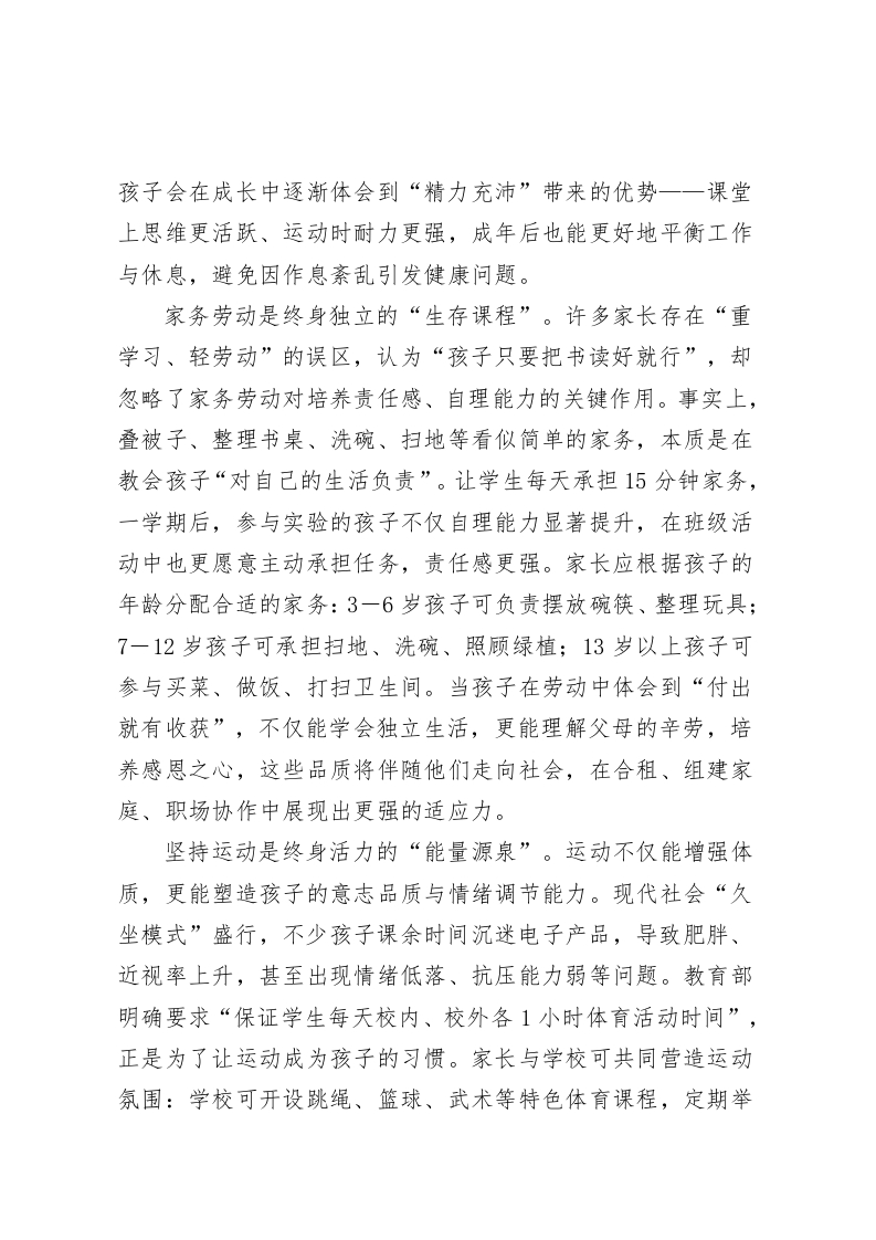 在初一年级家长会上的发言:以“终身”为尺,绘就孩子成长的长远图景教育的本质,是为孩子的未来奠基,而非仅着眼于当下的分数与短期成效。当我们将目光从“一时的优秀”转向“一生的发展”,便会发现,真正的教育应围绕孩子的终身发展、终身幸福与终身成长展开,在习惯、能力、学习认知三个维度播下种子,让孩子在漫长人生中持续汲取养分,成长为独立、幸福、有潜力的个体。一、以终身发展为基,筑牢习惯的“成长基石”习惯是伴随人一生的行为模式,良好的习惯如同为孩子装上“自动驾驶系统”,在未来的生活与工作中无需刻意用力,便能自然走向正向轨道。立足孩子的终身发展,培养作息、家务、运动三大习惯,正是为这一系统搭建核心框架。规律作息是终身健康的“底层代码”。童年时期的作息习惯,直接影响孩子的生理发育与认知能力,更会内化为成年后的生活节律。如今,不少孩子因沉迷电子产品、学业压力等原因熬夜,不仅导致白天精力涣散、注意力不集中,长期下来还会损伤免疫系统与神经系统。家长与学校需共同构建“作息守护机制”:学校通过合理安排课后服务时间,避免作业过量挤占休息;家庭则应制定固定的作息表,比如小学阶段20:30前入睡、初中阶段21:30前入睡,同时减少睡前电子设备使用,用亲子阅读、轻声交流替代屏幕刺激。当规律作息成为习惯,