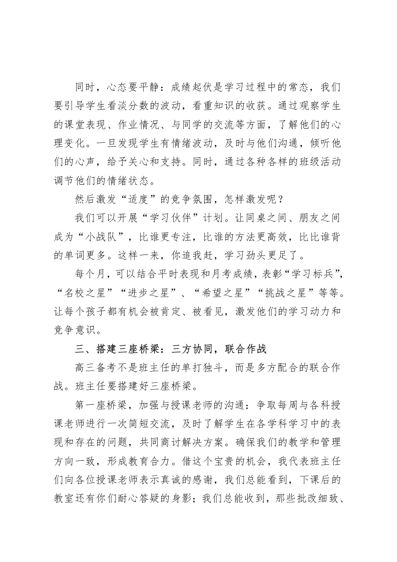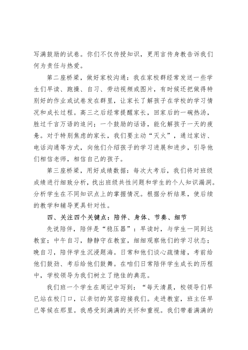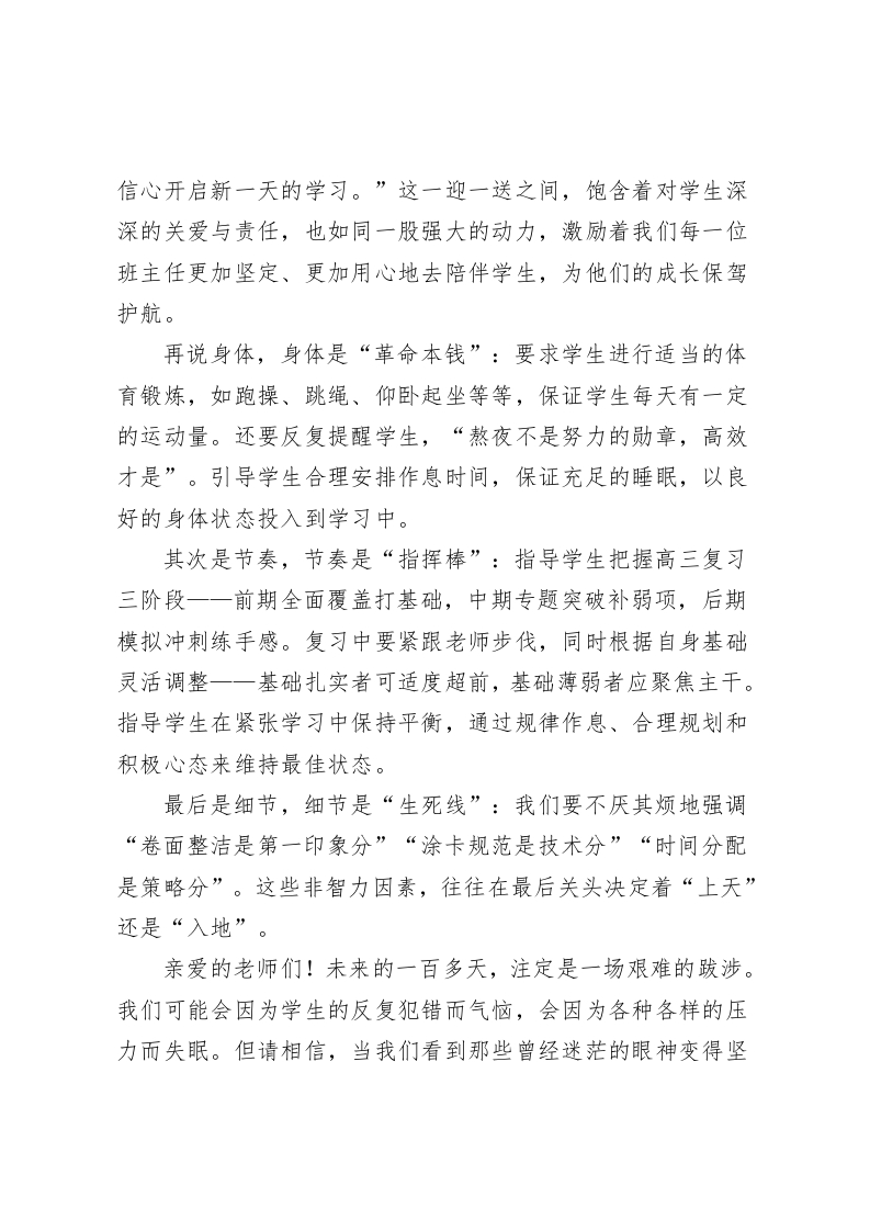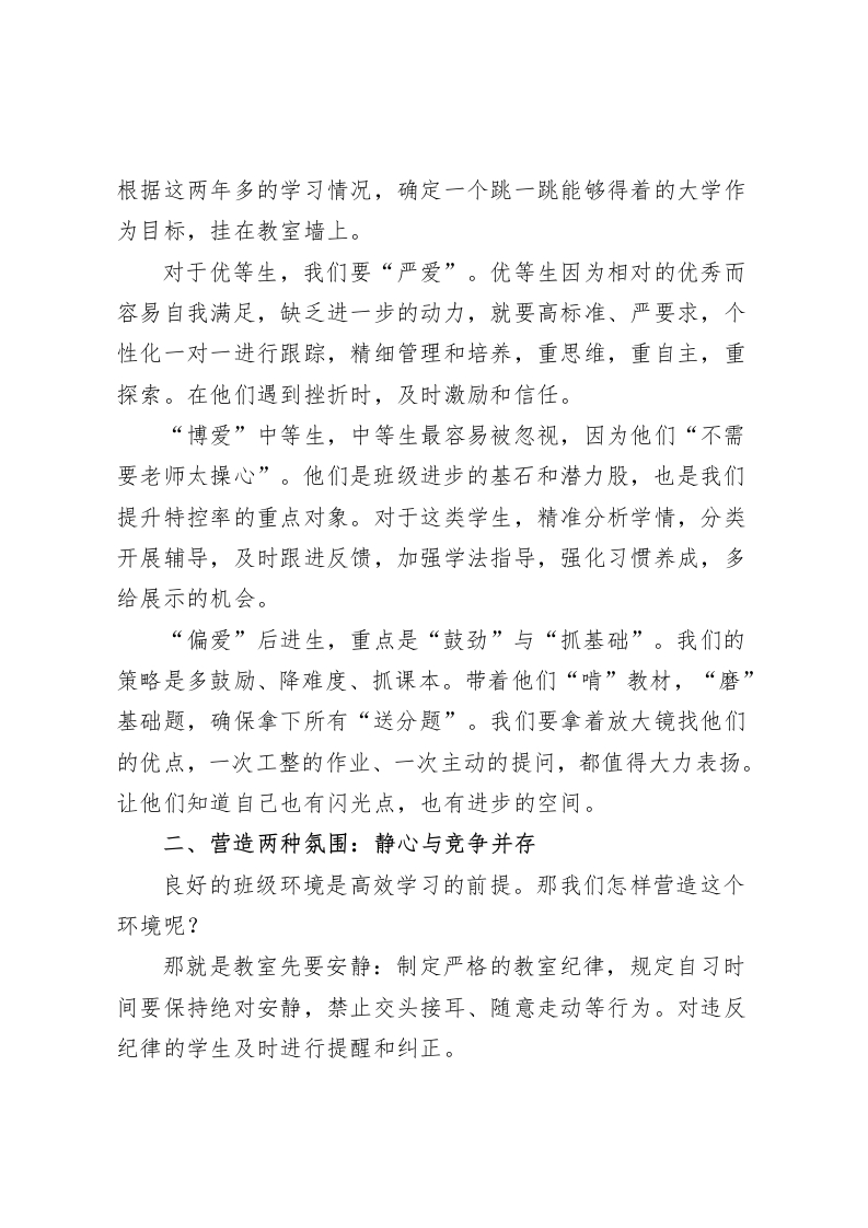 在高三教学工作会议上的发言:号角长鸣凝众志精准施策创辉煌尊敬的各位领导、亲爱的老师们:大家上午好!看着在座各位熟悉的面孔,仿佛看到过去两年多我们从问学楼到厚德楼,一起披星戴月、默默耕耘的身影。高考刚刚报名,冲锋的号角已经吹响,高考这场硬仗,我们必须打赢。它不仅是学生十二年寒窗的“临门一脚”,更是对我们2026级教师团队和管理团队的智慧和实力一次重大考验。作为班主任,我是这场战役的一线联络员和指挥员,我的职责是与各位并肩作战,带领我们的学生们冲锋陷阵,直至夺取最终的胜利。下面,我将从四个方面,汇报我的具体工作思路。一、明确一个核心:目标导向,分层推进我们的目标既宏大又清晰。宏大之处在于,助力每位青少年成长成才;清晰之处在于,要达成XX二中“特控率百分之六十、本科率百分之九十”的“六九”愿景。为此,我们要进行分层突破。我把高一高二高三以来的每次的联考成绩,制成了几张表格,第一张图片是每次联考前20名、前50名、前200名、前500名有多少?第二张图片是历次联考学生的年级排名,哪些学生成绩相对稳定?哪些学生成绩波动大?有没有什么规律等等。争取对班级的每一类学生都了如指掌。第三张图片是指导学生