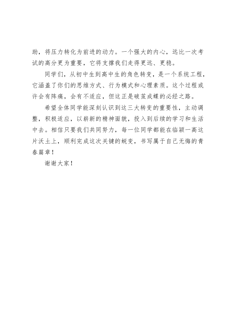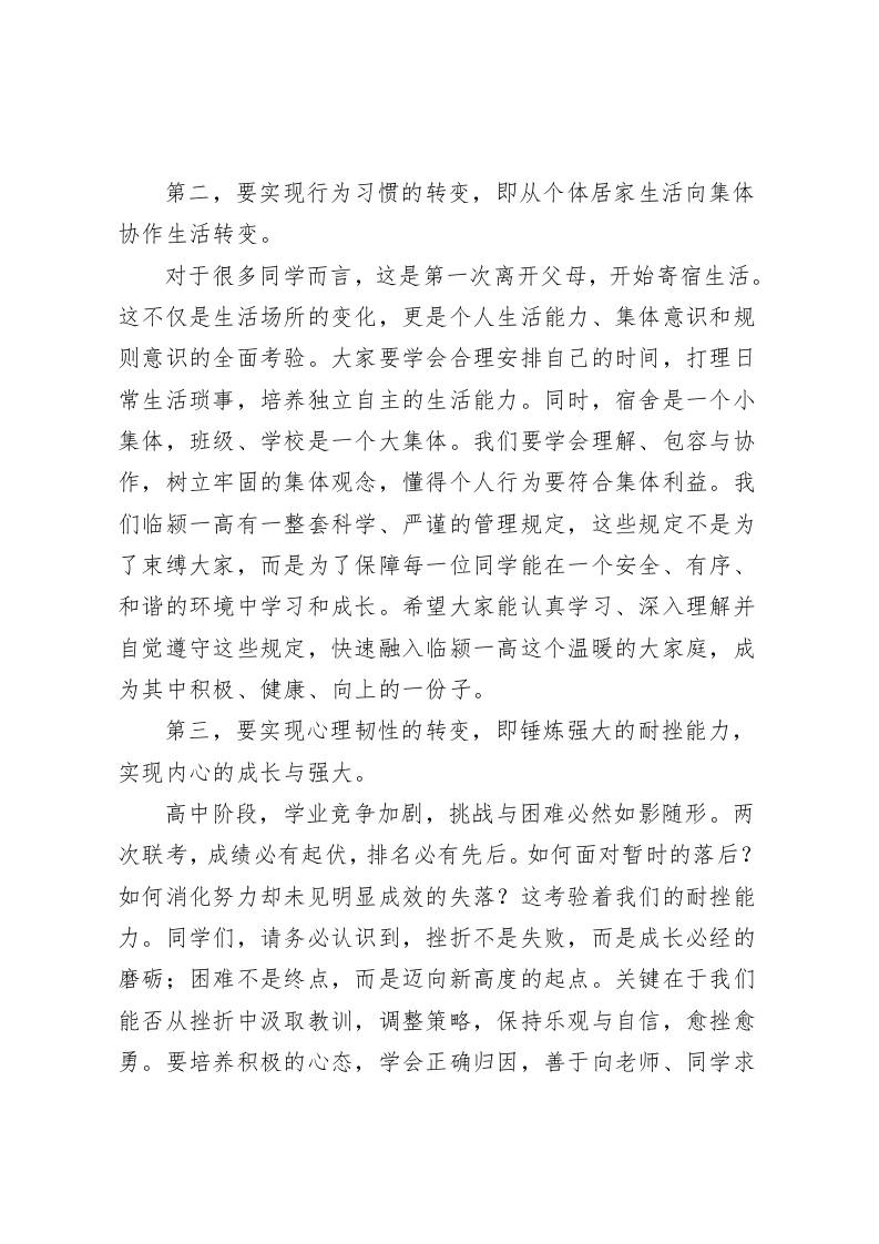 在某高中高一年级集会上的讲话:主动转变角色,迎接高中挑战(精品)同学们:大家上午好!时光荏苒,新高一的同学们踏入我们临颍一高这座校园已经两个月了。大家经历了两次联考的检验,初步体验了高中生活的节奏与挑战。从初中到高中,这绝不仅仅是年龄的增长或校园的变更,它更是一次深刻的成长蜕变,是一次必须完成的“角色转变”。借此机会,我想就如何更好地完成这一转变,与同学们交流几点看法。第一,要实现学习思维的转变,即从依赖记忆性学习向锻造理解性学习能力转变。初中学习,知识相对具体,侧重记忆与模仿。而高中阶段,知识量激增,理论性、抽象性、系统性显著增强。仅仅依靠“背多分”是远远不够的。两次联考,相信不少同学已经感受到了这种差异。这就要求我们必须将学习的重心,从“是什么”转移到“为什么”和“怎么样”上来。要学会深入思考概念、规律的内在逻辑与相互联系,构建起属于自己的知识网络。课堂上要紧跟老师的思路,积极思考;课后要勤于总结归纳,学会举一反三。这种从被动接受到主动探究的思维转型,是决定我们高中学习成败的关键第一步。