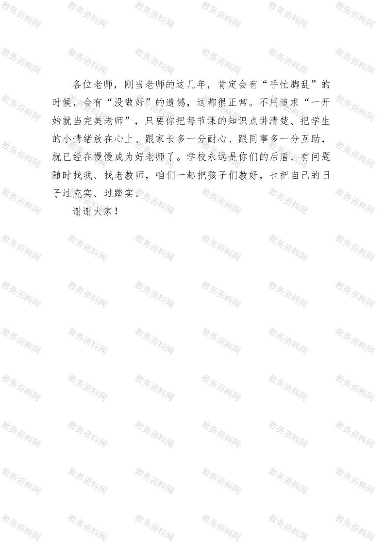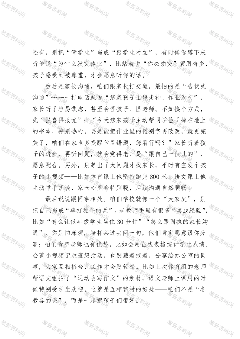 在青年教师座谈会上的讲话各位青年老师:今天坐在这里,看着你们眼睛里的光,特别亲切一一我刚入职那会儿,也跟你们一样,既盼着把课上好,又怕没管好学生,连跟家长打电话都要先在纸上打草稿。今天不跟大家说太多“大道理”,就聊几句咱们日常工作里用得上的“实在话”,不管是教哪个学科,咱们做老师的,核心都是把“人”的事做细、做暖。先说说教学。咱们常说“备好课”,其实备好课不只是备知识点,更要备“学生能不能接住”。比如教公式,别一上来就板书推导,先拿学生熟悉的事儿举例子;就像体育课教立定跳远,不能只说“蹬地、收腹”,得先让他们感受“跳起来能摸到前面的小旗子”,有了兴趣才听得进方法。青年老师脑子活,愿意尝试新工具,比如用短视频放动作分解、用小竞赛带动课堂,这些都是好办法,不用怕一开始不熟练,多试两次,就知道哪种方式最适合自己的学生。再聊聊学生管理。咱们面对的不是“统一型号”的孩子,有的活泼,有的内向,硬用一套规矩管所有孩子,往往事倍功半。比如班上有调皮的学生,别总想着“怎么管住他”,不如先找他的“闪光点”一一他可能上课爱说话,但运动会上特别拼,你抓住这点夸他“有集体荣誉感”,再跟他说“要是上课能把这份劲儿用在听写上,就更棒了”,他大概率会愿意改。