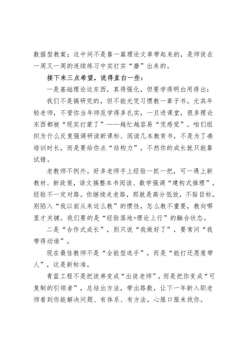 “青蓝工程”师徒结对总结会上,校长说出了什么让全场沉思的话?老师们,下午好:今天咱们坐在一块儿,主要是想把“青蓝工程”实行这段时间的情况捋一捋,说几句真心话。咱们这个队伍,老中青搭在一起,能不能形成合力,真不是靠几份表格、几次评比维系起来的,关键还在有没有那股子“真愿意带、真愿意学”的劲头。这段时间下来,不管是师傅带师徒,还是年轻老师自发向有经验的前辈取经,都让我看到了一个词一一融合。不是“形式对接”,是“人与人真的互相靠近”。这一点,我是既感动又欣慰的。这段时间的变化,一线最有发言权我们搞青蓝工程,说到底没那么多花哨的目的。就是一句话:有人愿意带、有人愿意学,彼此都能进步。先说师傅们一一有好几位老师,我是真得点名感谢。你们不仅自己课堂稳、班级管得紧,更不吝啬经验,每天课间、晚上、甚至周末,都有师傅在办公室一对一帮年轻人备课、理思路、反复磨公开课。要知道,拿开自己“炉火纯青的套路”,让年轻教师敢于摸索自己的方式,这可不光是“带”,是真心在扶。几位师傅对徒弟说得最多的一句话,不是“这么教”,