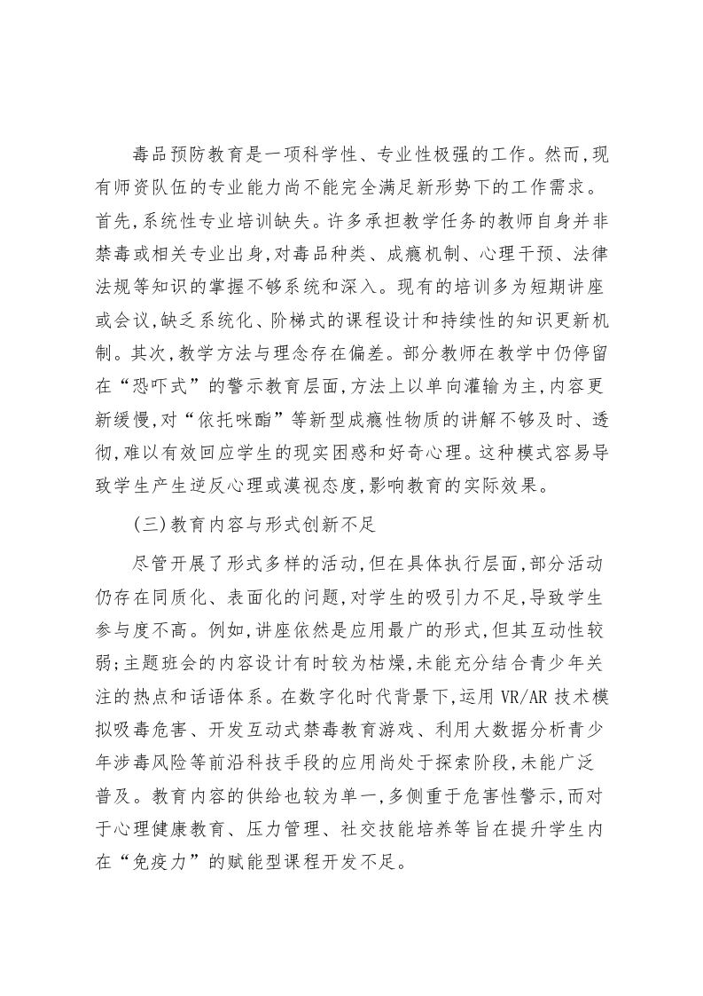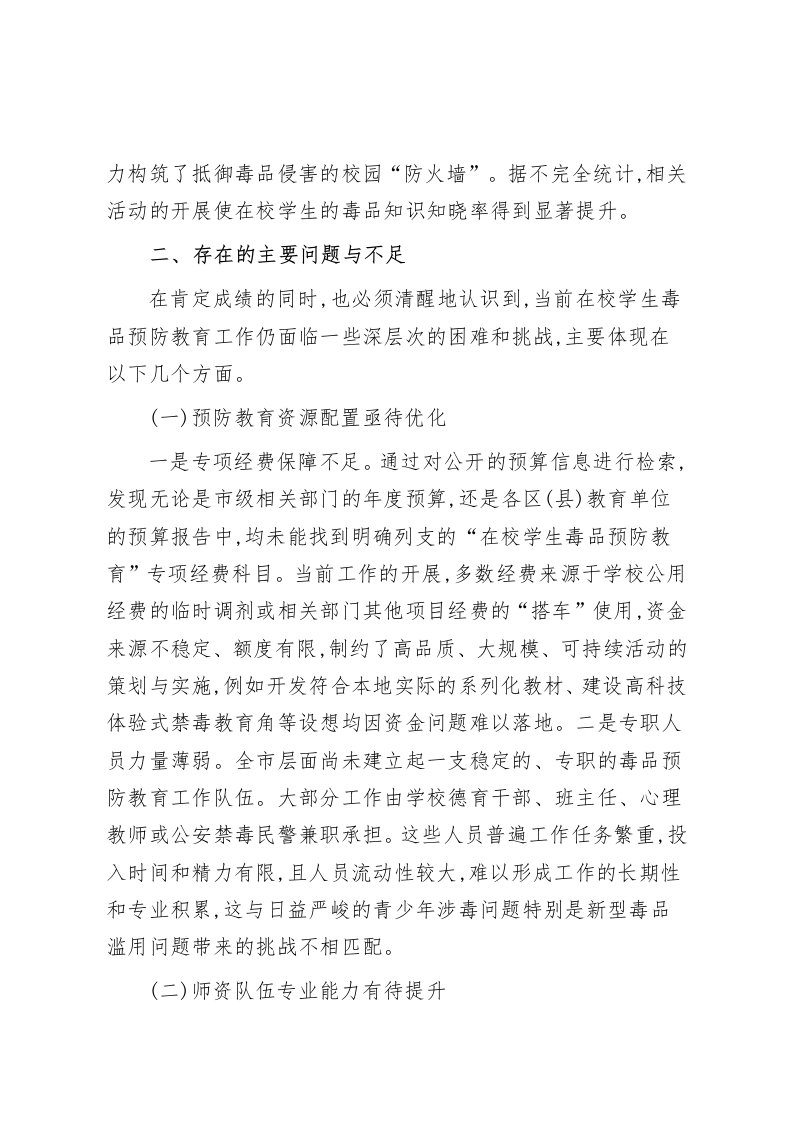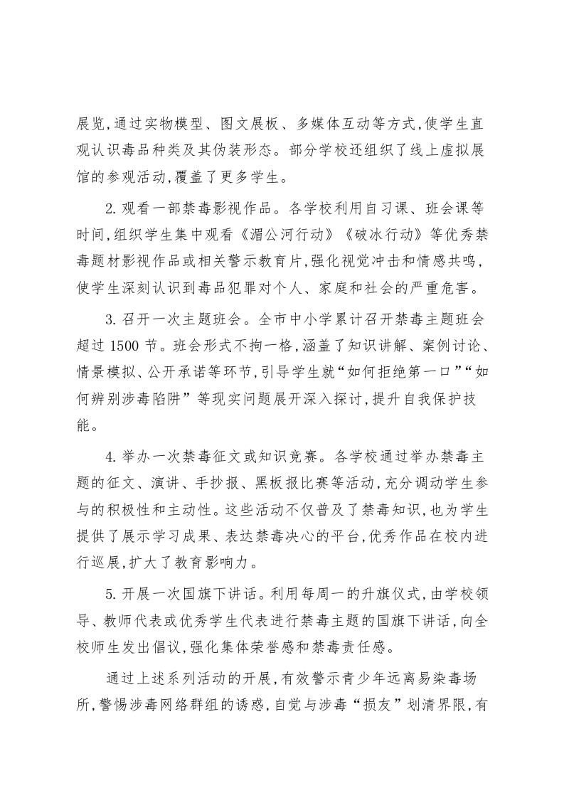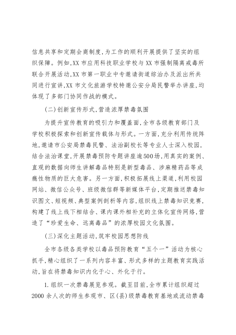 XX市2025年度在校学生毒品预防教育工作情况报告(精品)为深入贯彻落实国家关于禁毒工作的系列重要指示精神,依据XX省禁毒委员会及相关上级单位的统一部署,XX市禁毒工作专班围绕“防范青少年药物滥用”核心主题,于2025年在全市范围内扎实开展了在校学生毒品预防教育工作。现将本年度工作基本情况、存在的问题及下一步工作打算报告如下。一、工作开展基本情况2025年以来,特别是秋季开学后,XX市禁毒工作专班与市教育体育局等部门紧密协作,坚持预防为主、多措并举的方针,推动在校学生毒品预防教育工作取得了阶段性成效,有效提升了广大青少年学生的识毒、防毒、拒毒意识和能力。(一)强化组织领导,构建联动工作格局工作开展初期,市禁毒工作专班即联合市教育体育局召开专题工作会议,传达学习上级精神,明确将青少年毒品预防教育作为年度重点工作进行强力推进。会议要求,全市各级各类学校须将此项工作纳入学校安全及德育工作总体规划,由主要负责同志亲自部署,确保责任到人、措施到位。通过建立市、区(县)、校三级联动的工作机制,形成了齐抓共管、协同推进的良好局面。同时,加强了与公安、卫健、宣传等部门的横向联系,建立