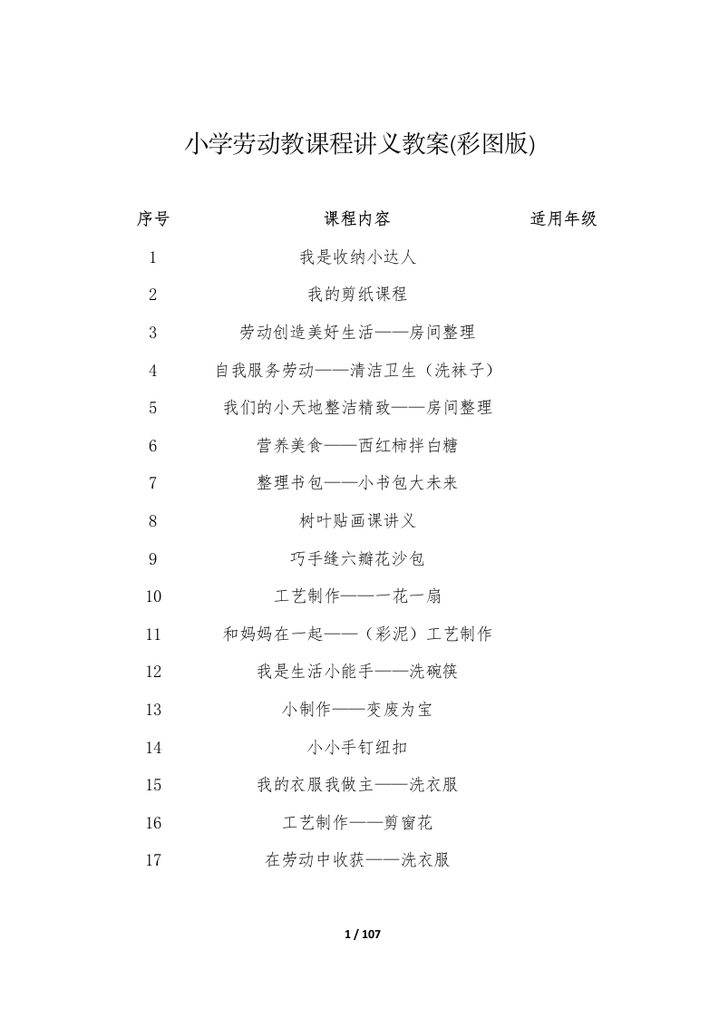 小学劳动教课程讲义教案(彩图版)序号课程内容适用年级1我是收纳小达人2我的剪纸课程3劳动创造美好生活一一房间整理4自我服务劳动一一清洁卫生(洗袜子)5我们的小天地整洁精致一一房间整理6营养美食一西红柿拌白糖7整理书包一一小书包大未来8树叶贴画课讲义9巧手缝六瓣花沙包10工艺制作一一一花一扇11和妈妈在一起一一(彩泥)工艺制作12我是生活小能手一一洗碗筷13小制作—变废为宝14小小手钉纽扣15我的衣服我做主——洗衣服16工艺制作一一剪窗花17在劳动中收获一一洗衣服1/107