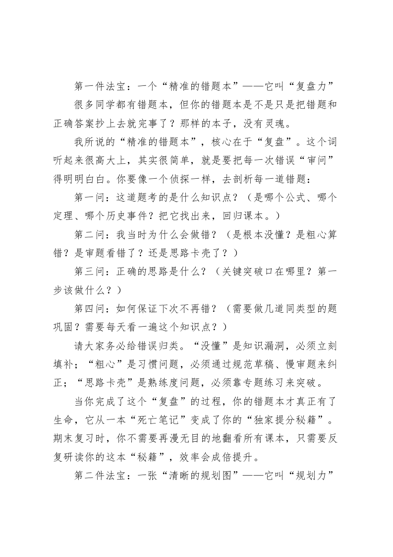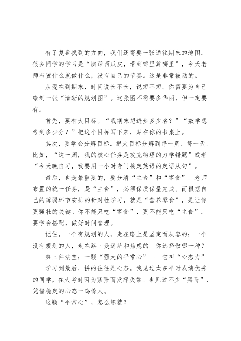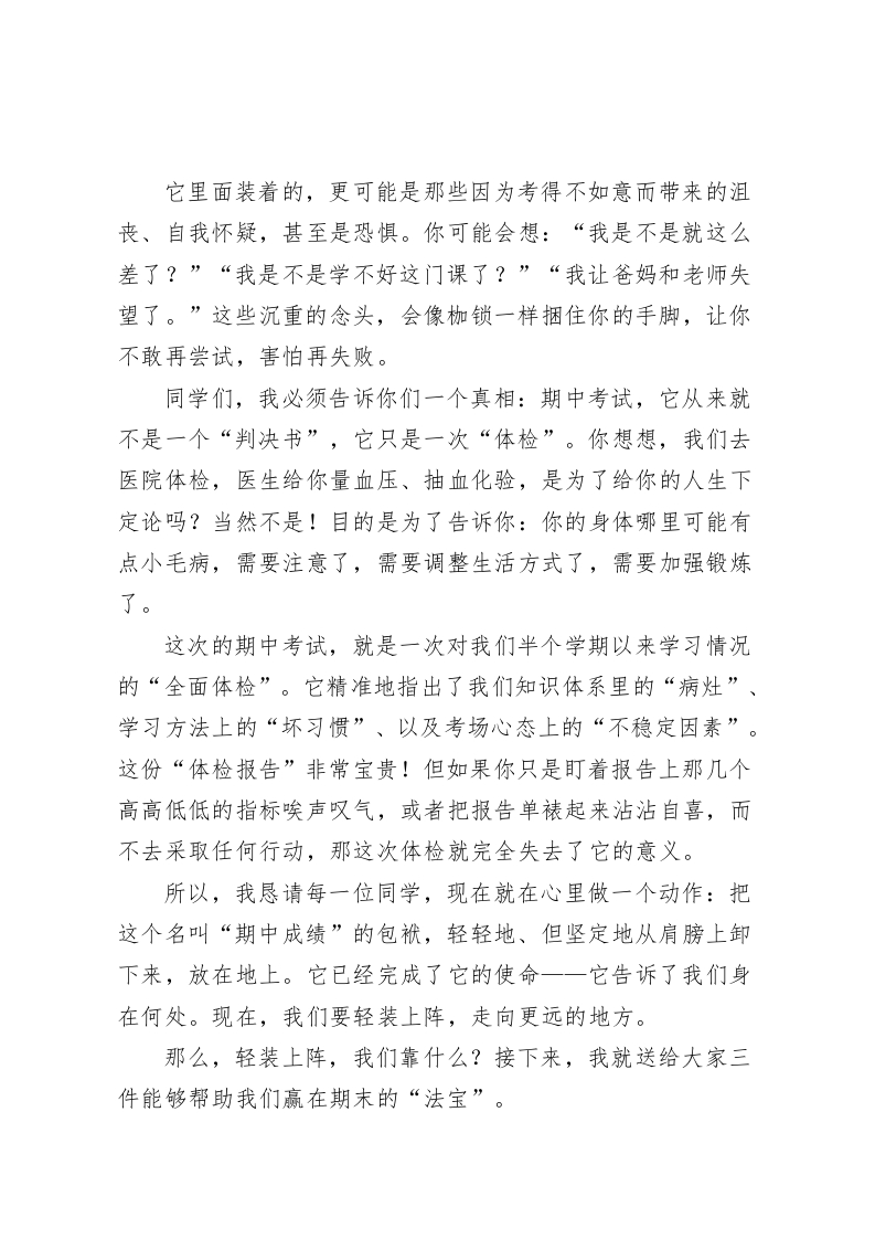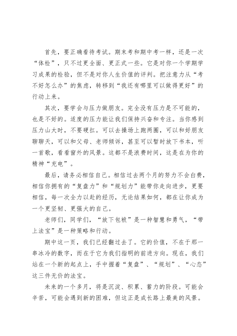 放下期中“包袱”,带上这3件“法宝”,轻装上阵赢期末一一期中考试总结会校长讲话老师们,同学们:大家好!期中考试的硝烟已经散去,成绩和排名此刻就摆在我们的面前。我知道,此刻大家的心情是复杂的。有的同学心潮澎湃,为自己取得的进步感到自豪;有的同学或许有些失落,因为付出的努力没有完全体现在分数上;还有的同学可能正在忐忑不安,不知道如何面对父母和老师的目光。今天,我想对所有同学说一句发自肺腑的话:期中考试,已经结束了!无论你是欣喜还是沮丧,请先做一个深呼吸,然后和我一起,把这次考试带来的所有情绪一一无论是甜的、苦的、酸的、辣的,都统统打包,给它贴上一个标签,叫做“过去的经历”。今天,我的讲话核心,就是我们的标题:放下期中“包袱”,带上这3件“法宝”,轻装上阵赢期末!首先,我们谈谈为什么要“放下包袱”。这个“包袱”里,到底装了些什么?它里面装着的,可能是你因为考得好而产生的一丝骄傲和松懈。你会觉得,期末还远,可以先松一口气。这种想法是最危险的“糖衣炮弹”,它会让你在接下来的赛跑中慢下脚步。