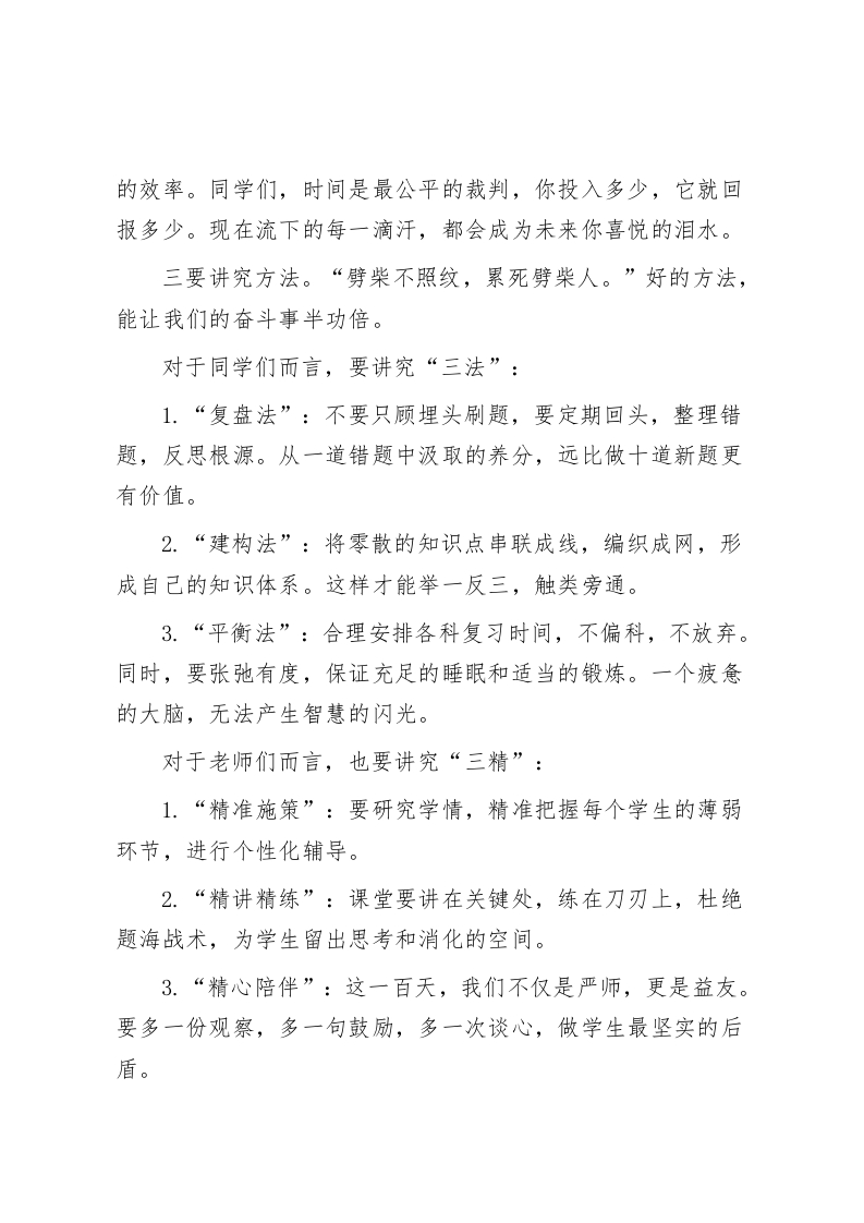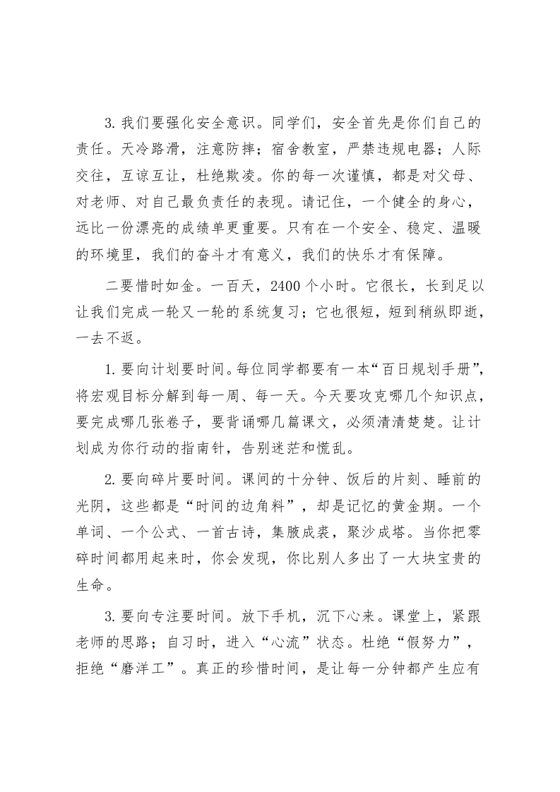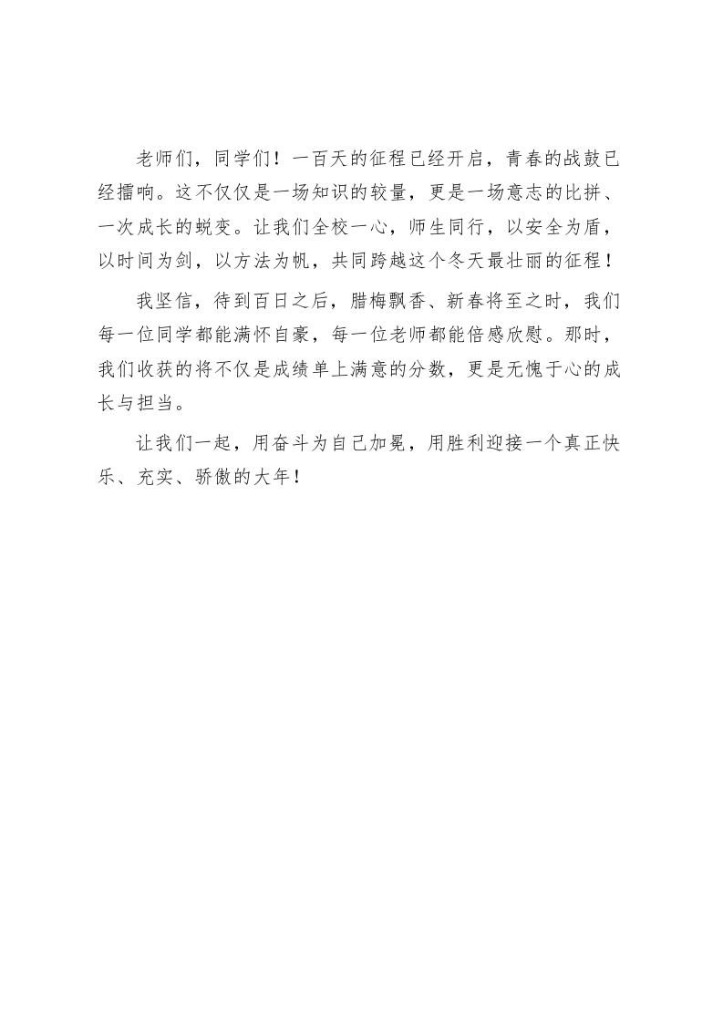 高级中学党支部书记、校长在冬季百日动员大会上的讲话:奋战一百天快乐过大年尊敬的各位老师,亲爱的同学们:大家上午好!北风虽凛冽,豪情正燃烧!今天,我们在这里隆重集会,吹响“奋战百日”的冲锋号。我们的目标明确而坚定:奋战一百天,用我们的汗水与智慧,换取一个硕果累累的期末,一个真正“快乐”的大年!这一百天,是我们本学期最后、也是最关键的一段征程。如何打赢这场攻坚战?我向全体师生提出三点要求:一要确保安全。安全是天,保障是机制,保护是手段,保证是底线。1.每个人都是自身安全的第一责任人。任何人不能隐瞒身体和心理的问题。每节课前每个时刻身体不适必须第一时间报告。这是常识也是制度。“行百里者半九十”,越是冲刺的时刻,越不能忽视脚下的路。安全,是我们一切奋斗的前提,是万家灯火的基石。2.我们要健全保障机制。学校将成立百日安全专项工作组,对校园设施、食品卫生、用电消防等进行无死角排查,做到日日有检查、周周有汇总、立查立改。班主任、宿管老师、安保人员要拧成一股绳,形成24小时无缝隙的安全管理网络。
