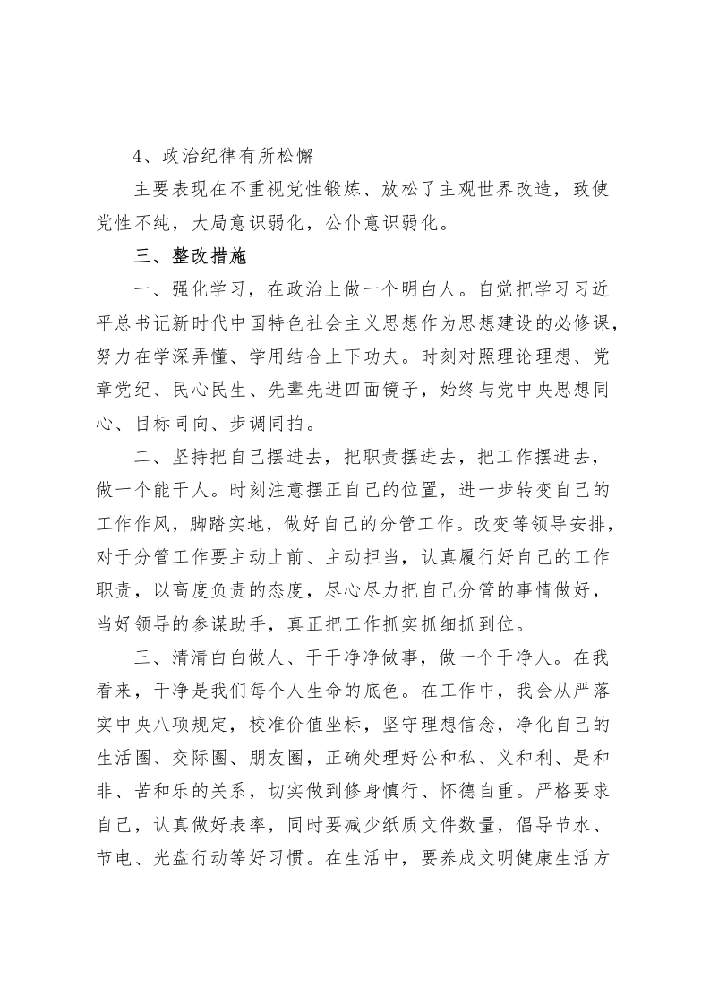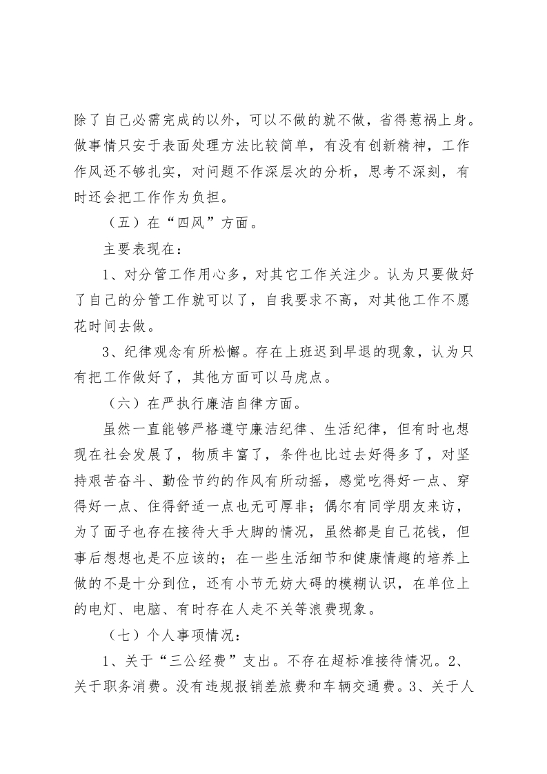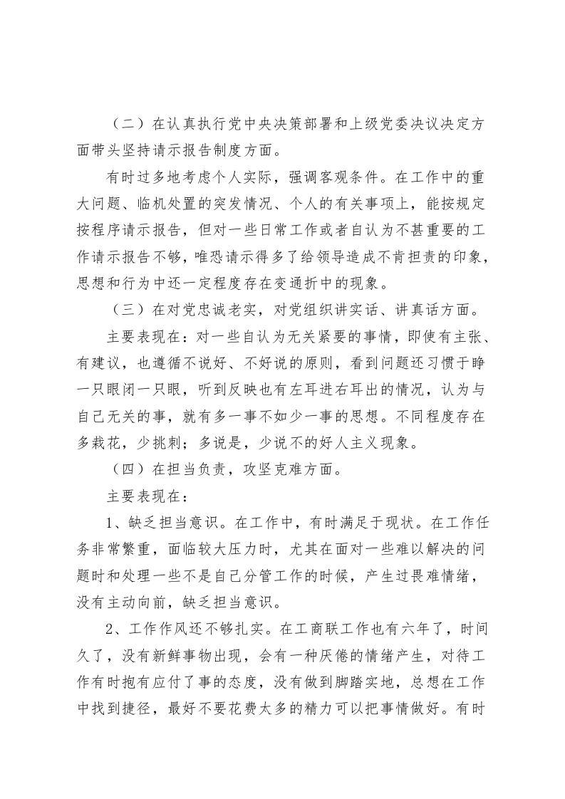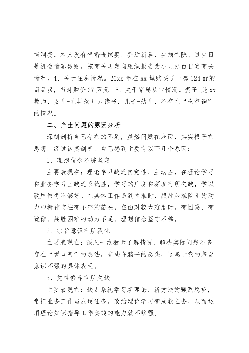 民主生活会上,教师党员对照检查材料做一个清清白白干干净净的人根据本次专题民主生活会具体要求,对照党员标准结合本人思想和工作情况,我学习了党的二十大精神报告和第二批主题教育精神,紧紧围绕六个方面的内容,结合自身工作实际,认真开展了对照检查,总的来说,自己在思想上严格要求,在遵纪廉政上能够自律,在履行岗位职责上认真负责。但同时也感到,自己的一些思想和行为与新形势、新任务要求还有较大差距,现将对照检查情况报告如下,恳请大家多提宝贵意见:一、存在的问题(一)在学习贯彻习近平总书记新时代中国特色社会主义思想方面。虽然能够牢固树立四个意识,坚定四个自信,做到四个服从,自觉在思想上政治上行动上同以习近平总书记同志为核心的党中央保持高度一致,但也存在不少问题。主要表现在:1、学习的自觉性和主动性不够。由于平时忙于应付日常事务,真正用于学习的时间和精力很少,学习缺少自觉性和主动性。基本上只满足于支部开展的活动,很少主动去学习。2、学习上的深度和广度不够。对习近平总书记新时代中国特色社会主义思想,满足于学习了、理解了,但在系统把握学、拓展延伸学、联系实际学上下功夫还不够,思考得不深不透,存在着知行不一、学用脱节的现象。