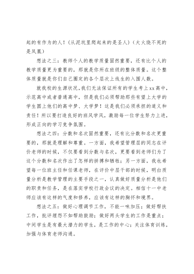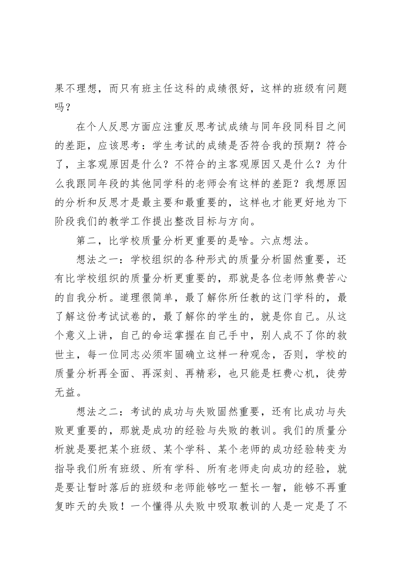 期中考试质量分析会,校长讲话:成绩属于过去。初三复习时间已过三分之一各位领导、老师们:大家辛苦了!刚才,教务处张主任做了上学期期末考试的成绩分析,有细致的学科个体分析;有班级整体情况各个层面与分数段方面深入浅出的分析;也有对年段的整体与上一届的情况进行了全面的比较分析,我觉得分析得很中肯、到位。谢谢张主任和马组长。代表学校,受王校长委托感谢老师们半个学期来的辛勤付出。先补充分析一下成绩。看表格分析。1、同期与三年成绩比较,找学科和班级差距和问题。2、本次成绩看,班级学科差距,重点看优秀班级的差科和落后班级的优科,建议找找原因。下面我讲几点意见:第一,客观对待分数,主观反思原因。从这次考试的分数面上看,整体不错,但个别学科个别班级的考试结果还是不容乐观的。个人认为,在班级整体反思时,应注重思考两点:当所有科目的考试结果在你这个班级所体现出来的都是一致“不理想”时,我们是不是要反思一下,为什么会出现这种结果,原因在哪?我的这个班级有问题吗?当这个班级的所有科目的考试结