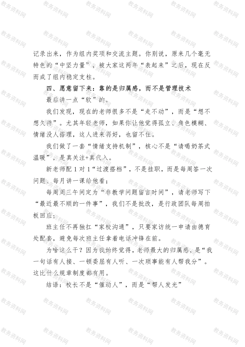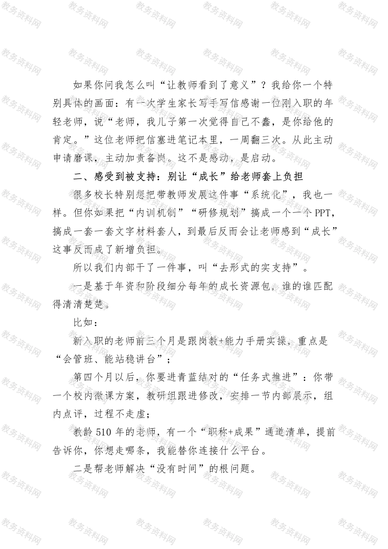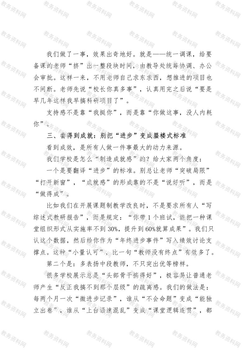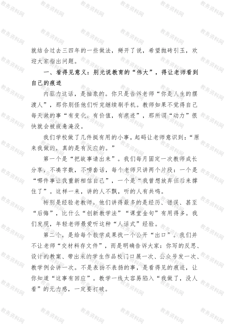 如何激发教师内驱力一从“要我成长”到“我要成长”的校长管理实践尊敬的各位领导、各位同仁:大家好,我是XX学校的校长,很高兴今天能有机会和各位同行交流一些管理上的思考。刚才听了不少发言,有让人沉思的,也有戳到心窝的。说实话,讲理念我不太擅长。我今天不谈太“高”的理论,也不总结公式化套路,只想围绕一个我们学校最经常碰到、也最难彻底解决的老问题一一怎么真正把老师“带动”起来?不是动脑,而是动心;不是回应号召,而是自己愿意往前走。这几年,我越来越觉得,做校长其实有两件事绕不开:一个是管对方向,一个是带得住人。前者靠眼光,后者靠细水长流。就“教师成长”这件事,嘴上说容易,但真要让一位骨干老师焕发出新的战斗力,或者看着一个教龄10年的中层教师重新燃起职业热情,这里面有些门道,不全是“制度设计”能解决的。我琢磨来琢磨去,发现离不开几个“感”一一看得见意义,感受到支持,尝得到成就,融得进团队。这四个感,是我们学校管理员在做事时反复去打磨、试错、再修正的方向。下面我