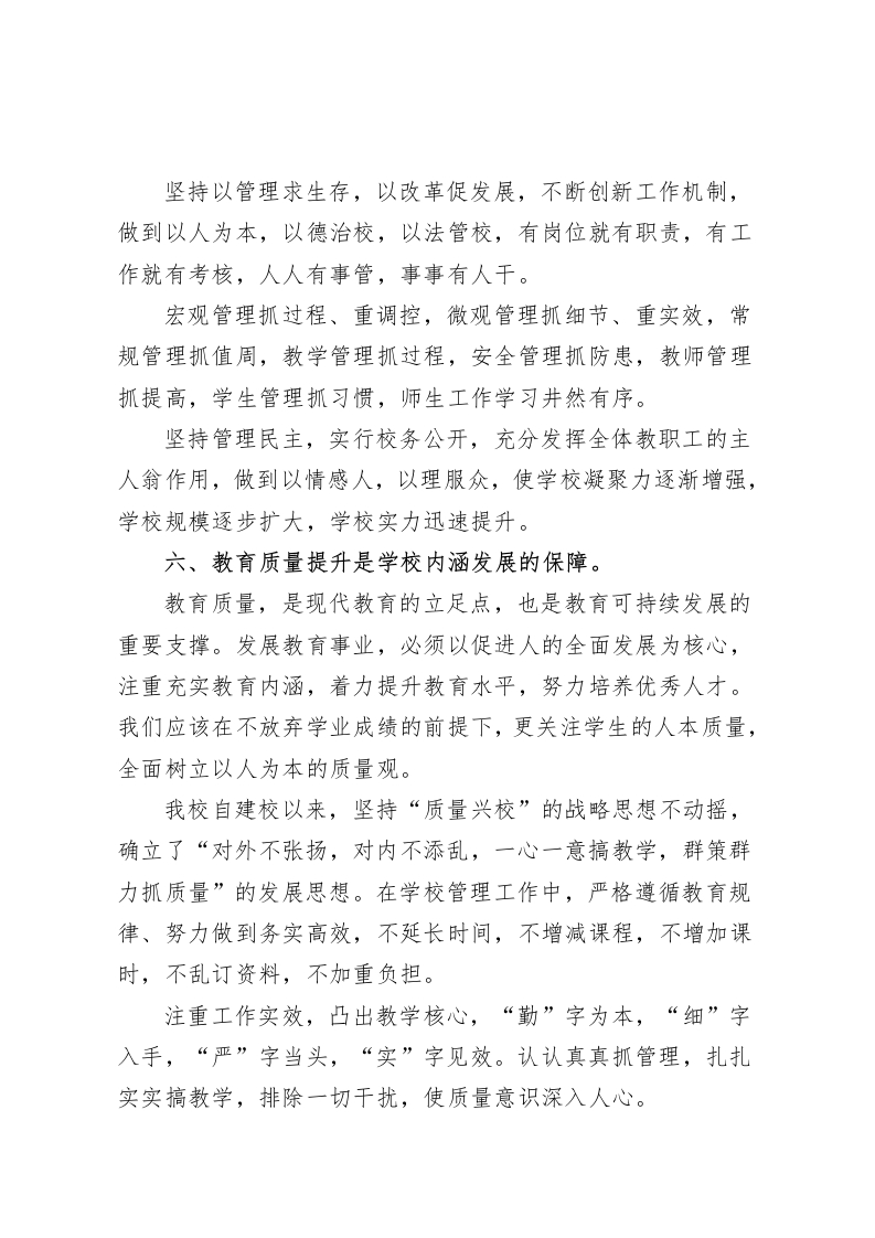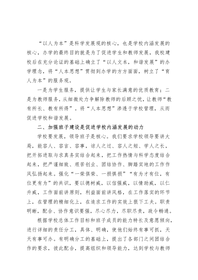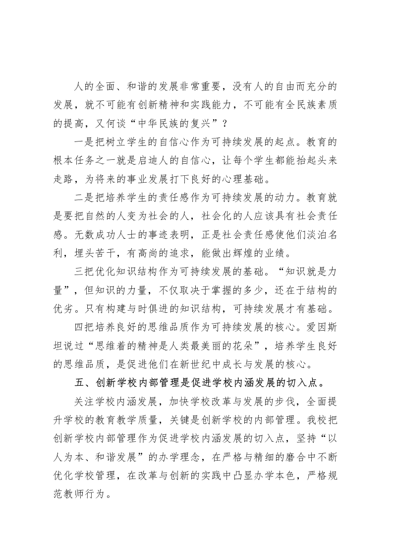 校长参加中学校长论坛发言稿新时期学校内涵发展的思路与实践各位领导、同仁:大家好!畅谈校长管理方略,共议学校内涵发展,于我而言,有“镜中花,水中月”之嫌。在此,我只想与各位交流一下在工作中的一些感悟,与大家共勉,不妥之处,请批评指正。谈到学校内涵发展,首先,需要明确内涵、内涵发展这两个逻辑概念。内涵主要是指概念所揭示事物的本质特征,内涵发展是指事物内在属性的发展,明确了这两个概念,学校内涵发展就不难理解了:学校内涵是学校本质属性的总和,学校内涵发展则体现在学校管理效能高、教育质量高、综合实力强、特色明显上。可见学校的内涵发展是一种追求质量的发展。它强调提升学校的办学质量,也就是提升学校的“软实力”。学校内涵的发展,至少应该包括:学生的发展,教师的发展,教学质量的发展,管理水平的发展,办学环境的发展,特色的形成与发展。从哲学的角度来说,从可持续的发展观看,内涵发展是今后学校发展的必由之路。校长作为学校的管理者只有深入理解学校教育的内涵才能促进学校的进一步发展。下面我就结合我校的实际谈谈自己的认识。一、“以人为本”是学校内涵发展的核心