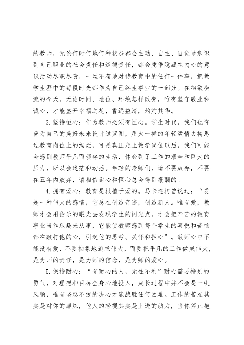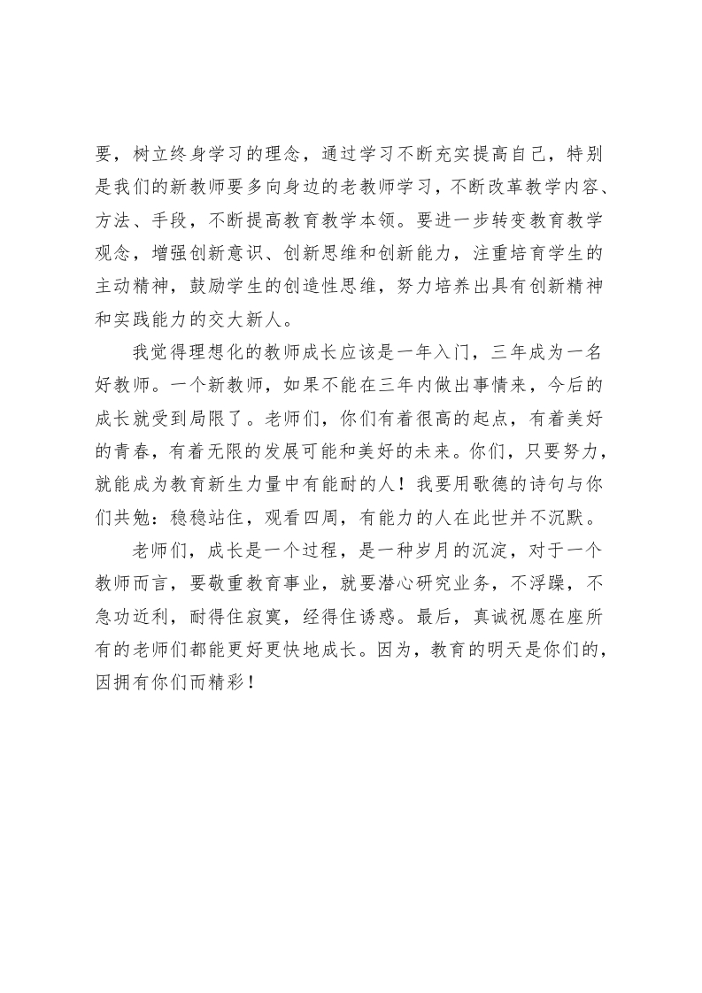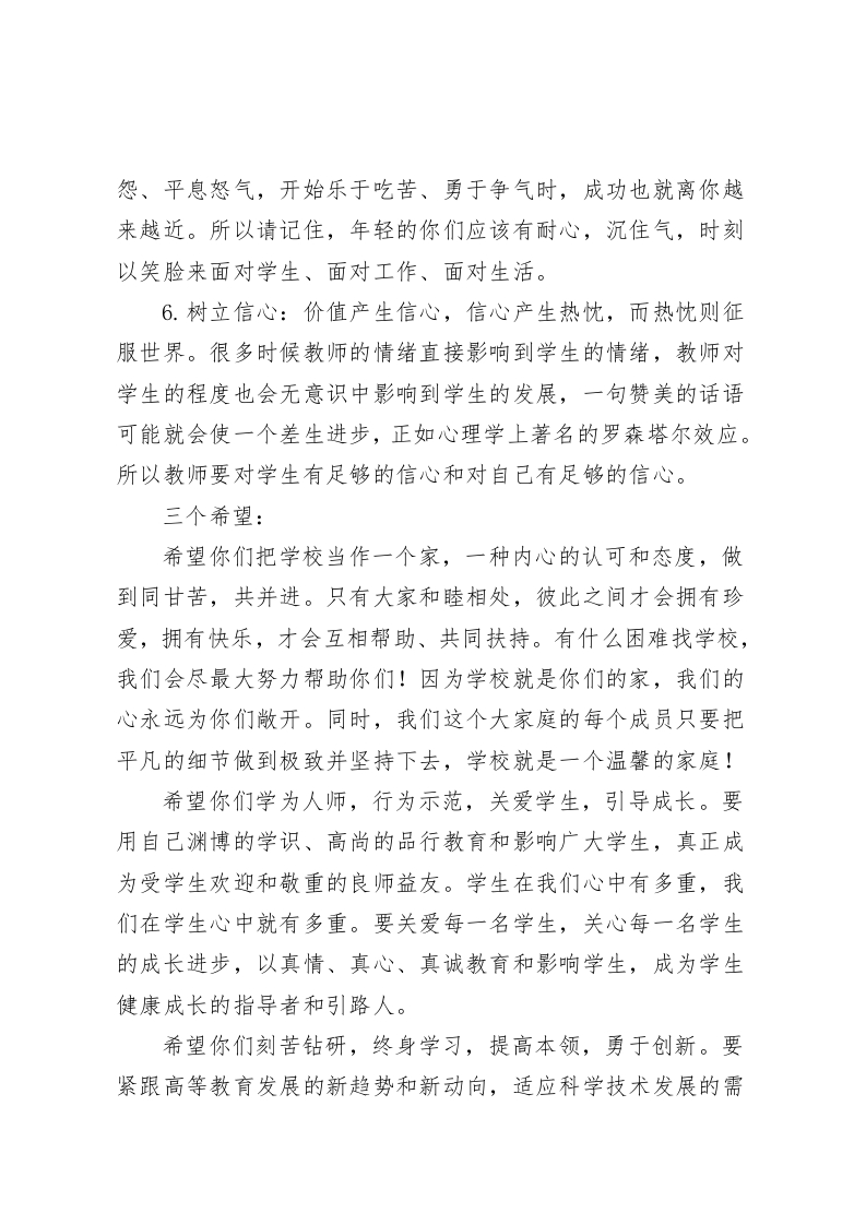 校长对新教师讲话,教育的明天是你们的,因拥有你们而精彩各位老师:大家下午好!你们留给我的初步印象就是:女的长的漂亮,男的长的帅。一个个浑身上下都充满了激情,充满了斗志。在此,我代表学校对你们加入XX学校这个大家庭表示热烈的欢迎,有了你们的加入,我们这个家会更具生机与活力!此值你们教师生涯翻开新的一页,请思考一个问题:“成为一名教师意味着什么?”是否意味着有了一个铁饭碗,或是意味着得到那些世俗意义的功名利禄?我想更应该意味着信仰,意味着将教育这一事业放置于自己存在的核心。获得薪酬不是我们的目的,外在的肯定也只是额外的奖赏;最重要的,是我们要一颗热爱教育之心,它是我们激情的源泉以及归宿,是我们生存于世的意义所在。下面就以“六个心”、“三个希望”来谈谈如何为自己开辟一片生长的沃土。1.锻造静心:“非淡泊无以明志,非宁静无以致远”,静心是教师职业精神的核心,教师所需的静气就是远离俗气,静下心来备好每一堂课,静下心来批每一本作业,静下心来与学生对话:静下心来研究学问,静下心来读书,静下心来总结规律,静下心来反思言行,以便超越自己,以便超越过去。2.坚守诚心:古今中外、从企业到教育,无论做生意还是做学问,诚心都是立足的根基。忠诚胜于能力,作为教师更要有诚心。这是一个教师必备的、最基本的心态。具有敬业精神