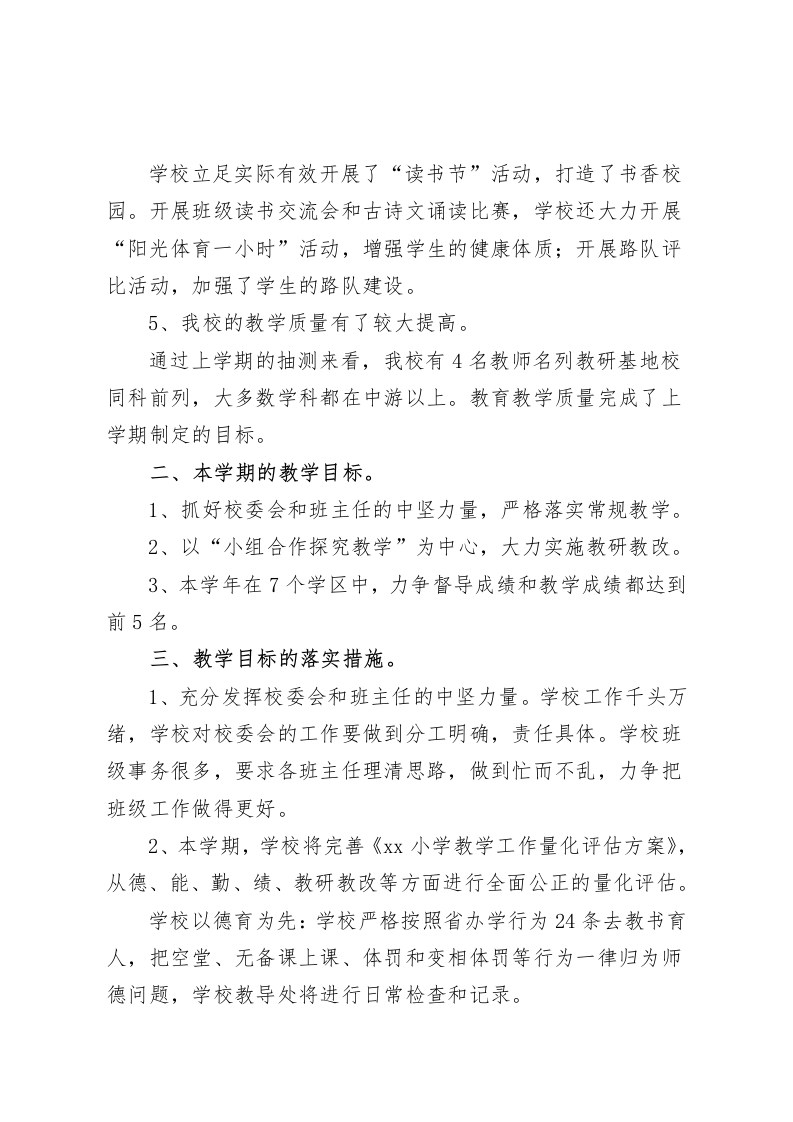 校长对学校的教学工作做了汇报,讲话的内容让教师倍感欣慰各位领导、老师们:你们好!现在我对Xx小学的学校教学工作向大家汇报如下:一、上学期教学工作总结上学期,我校的教学工作以“十二项育人制度”为指导、以“小组合作探究学习”为课改中心,加强常规管理,大力提高教师的教科研水平,培养学生的创新精神和实践能力,使我校的教学质量稳步提升。1、教学常规常抓不懈我校严格落实课程方案和作息时间,全体教师都能严格遵守考勤制度,按照课表上课,都能认真备课,认真批改作业,全体教师的工作作风扎实细致。2、以教科研为突破口,提高教师的课堂教学效率学校发挥了教研组的龙头带动作用。学校每月召开周次教学办公会,教师每人每学期至少上一节公开优质课,扎实有效地开展教研活动。3、充分发挥小组合作探究学习的作用。学校构建了“自主、合作、探究”为特征的教学和学习方式,小组合作教学的实施,培养了学生发现问题、提出问题的能力,启发了学生养成合作学习的习惯,大大提高了学生的课堂学习效率。4、学校师生活动开展的扎实有效。