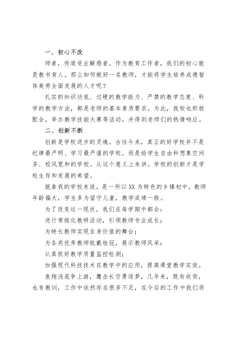 校长论坛简短发言初心不改,创新不断,风正悬帆谱新篇尊敬的各位领导、各位同仁:大家好!非常感谢教育局组织的这次论坛活动,给我们提供了一个难得的学习机会。今天,能有幸在这与各位一起交流教育教学工作,我感到无比荣幸!对我而言,今天不只是一个交流会,更是一个“三人行,必有我师”的提升自我机会。下面,我将围绕“初心不改,创新不断,风正悬帆谱新篇”为主题并结合本校实际教学情况进行发言。百年大计,教育为本。可以说教育是一项造福于世世代代的光辉事业,而学校就是教育工作的主战场。每当回首自己的教学时光,满足感、优越感油然而生!因为我陪伴了学生最重要的成长时刻,我身边孜孜不倦的老师们也时刻在感动着我,影响这我。他们当中的每一个都把自己的知识向学生倾囊相授,把人生的大道理一遍遍地讲给学生听。他们是老师,亦是家长,他们用自己的实际行动完美诠释了爱和责任。我相信,这不仅是我们学校教育工作者的精神面貌,更是全县、乃至全国教育工作者精神面貌的真实体现。校长是学校发展的核心,身处这个职位,也感受到了肩上沉甸甸的担子。学校建设任重而道远,作为一校之长,我认为教育工作必须要做到“初心不改,创新不断”才能不断开创教育新篇章。