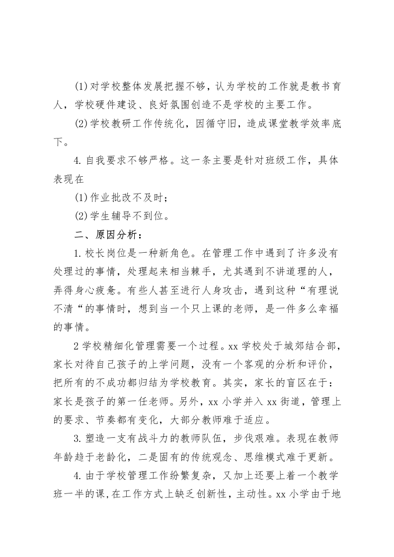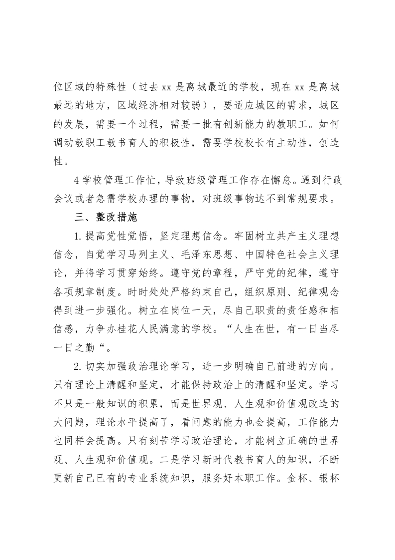 校长民主生活会发言常反思、常警醒,做合格党员各位教师:作为xx中心学校党总支的成员,结合Xx小学校长岗位及六年级数学教学工作,从存在问题,存在问题原因分析,下步整改措施,个人有关事项说明四个方面,做一个发言:一、存在问题1.理想信念不坚定。党员模范的带头作用不够,对于纪律观念意识较淡薄,自己的思想行动与党的要求还有一定的距离。具体表现在:(1)刚履职时,信心百倍,可遇到棘手的问题时,想到退却,甚至想到放弃。(2)难于适应xx人民对优质教育的需求。2.在理论学习上不够自觉。没有把政治理论学习放在一个重要的位置,对学习的重要性认识不足、感受不深、要求不严。具体表现在:(1)对“挤“时间学习重视不够,找客观,时间太紧,工作繁忙。(2)系统学习不够,主动性较差。通过会议或者专题培训,对党的一些知识一知半解,没有潜下心来,结合教学工作实际,进行“有的放矢“的学习,缺乏系统的掌握。3.新发展理念落实不到位,工作上有时放不开,循规蹈矩,按部就班,缺乏主动性和创造性。具体表现在: