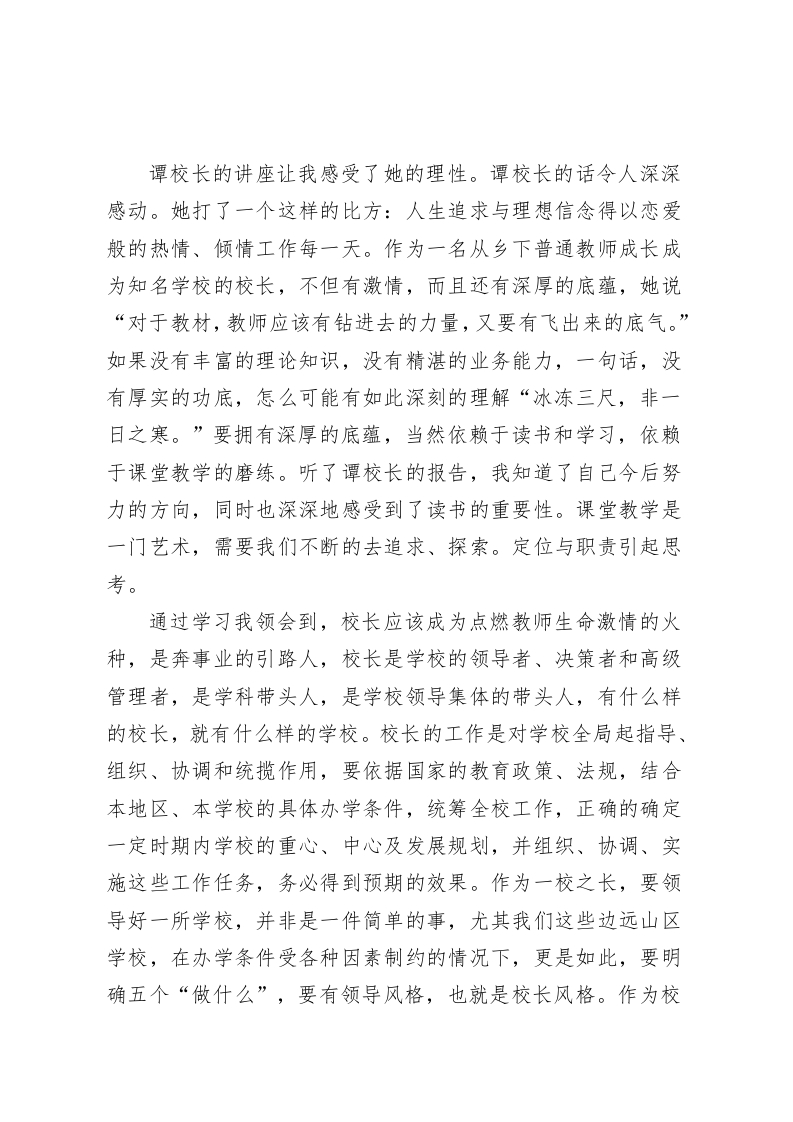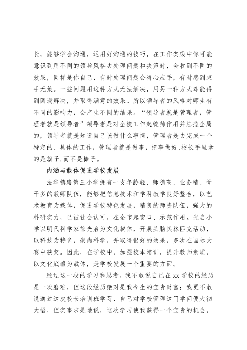 校长培训学习心得激情一教育的永远追求金秋十月,我有幸参加由xx教育局承办的第二期校长培训班,参观了法华镇路第三小学、徐汇区光启小学,聆听了上海市教育局政策法规处朱坚讲的《依法治校及学校管理》、交大安泰管理学院副教授胡巍讲的《学校团队建设与管理沟通》、华东师大杨小微讲的《小学教学改革与课程改革》、李晓文讲的《学生心理与行为研究》,体验建平实验学校谭淑云校长、洋泾菊园实验学校王涣文校长成功的学校管理经验面对面的交流,使我拓宽了视野,受益非浅。激情与思想带来的精神大餐1、激情一一事业的永远追求听谭校长的讲座,我感受到她是一位充满着激情的校长,她说“做学校先进文化的引领者,让生命在岗位中熠熠闪光”,讲课中她呼喊“生命因教育而美丽”,这都来自于她对生活的激情,对孩子,对课堂,对教学的投入。听了她的报告,更让我体会到了这是一种对教育不断深入、不断提炼、不断创新的激情。我们的教师需要校长的激情去唤醒他们沉睡的机制,我们的课堂需要老师的激情,需要用老师的激情去感染学生,触动学生,用老师的激情来浸润学生的情感。我们的谭校长已为我们作出了一个很好的典范,那就是对学校、对学生的一种激情,对教育追求的一种永远的激情。2、底蕴一一自我的内心修炼