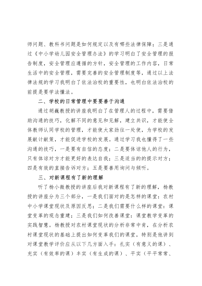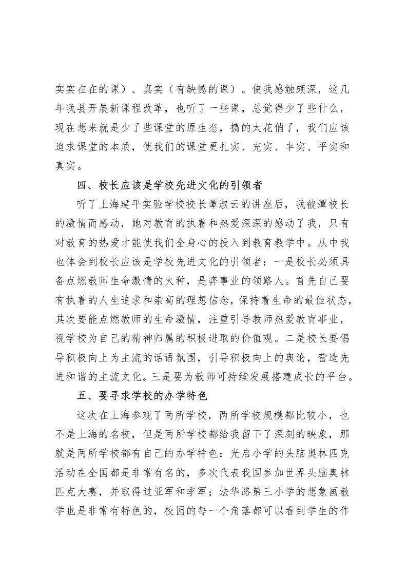 校长培训学习心得提升了自己的综合素养,丰富了自己的知识20xx年x月x号到x月x号,在xx教育局的统一安排下,我有幸参加了为期五天的校长培训班。本次活动主办方作了周密的安排,短短的五天时间我们参观了上海的光启小学和法华路第三小学,聆听了上海市教育局政策法规处的朱坚处长作的《依法治校及学校治理》的报告;上海交通大学安泰经济与管理学院胡巍教授作的《学校团队建设与管理沟通》的讲座;华东师范大学杨小微教授作的《农村小学教学现状与课堂变革智慧》的讲座;华东师范大学李晓文教授作的《学生学习动机培养》、《学生情绪表达与身心和谐发展》的讲座;以及上海市洋泾菊园实验学校校长王涣文和上海市建平实验学校潭淑云校长的讲座和经验介绍。通过这次培训学习使我汲取了先进的教育理念,对教育教学管理有了新的认识,提升了自己的综合素养,丰富了自己的知识,收益匪浅。一、校长要懂得依法治校朱坚处长的报告分三个部分,首先总体介绍我国的教育法规建设情况,其次着重介绍了新修订的《中华人民共和国义务教育法》,再次介绍了《中小学幼儿园安全管理办法》。听了朱处长的报告,我收获很大一是明白了我国法律体系框架下的教育法律法规:二是听了朱处长对我国新修订的《中华人民共和国义务教育法》的详尽诠释,我了解了在新的义务教育法中对经费保障问题、素质教育问题、均衡发展问题、学生学校老