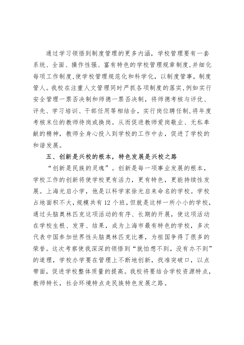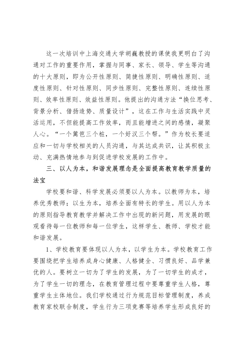 校长培训学习心得体会不在于看到多少而在于想到多少我有幸参加了xx组织的校长培训班的学习,聆听了上海市多位名教授、名校长、教育专家的报告,参观了上海交通大学、上海光启小学、上海闵行区第三小学。学习期间,大家经常交流学习、参观的体会,与专家、名校长面对面直接交流。同时与Xx省的校长相互交流教育情况。通过这次培训学习,提升了本人的教育理论水平,加深了对教育法规、教育政策、教育方针、素质教育和课程改革的理解,学习了先进的教育管理经验,更加增强了对教育工作的责任心和使命感,进一步领悟了“德育为首、质量立校、人才强校、特色兴校”的管理理念。以下是本次学习的几点思考,付诸笔端,和大家一起探讨:一、校长应成为学校先进文化的引领者,是点燃教师激情的引路人1、校长必须对事业充满爱,充满激情。校长要有高度的责任心,对事业不断去追求。正如恩格斯所说“有理想的人,生活才是火热的”。这次给我们上课的潭校长,不但业务精湛,作风顽强,而且对生活充满激情,对教育工作执着,他几十年都保持“以恋爱般的热情对待每一天工作”。我被他的言行深深鼓舞,更加明白了遇到问题和挫折怎样冷静地思考与处理,那就是对每一件事,每一个教师,每一个学生充满爱、充满激情地去对待。这样定能达到最佳的效果。