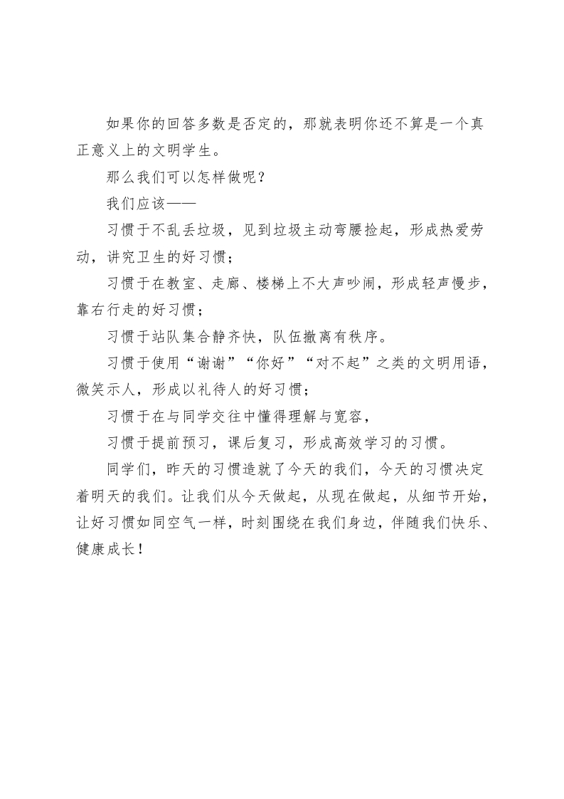 校长在国旗下讲话学会感谢,学会欣赏早上好,非常高兴我们又相聚在这个美好的早晨。今天国旗下讲话的主题是:好习惯伴我成长。三字经上说,“人之初,性本善”,“苟不教,性乃迁”。我想,这也是人人要接受教育的原因之一吧。我们现在正处于长身体,长知识的黄金期,这也是我们性格形成的黄金期,毫不夸张地说,现在养成的一些好的行为习惯可以使我们受益终生。现在,我们一起做几道简单的选择题,大家只需在心里用“是”或“不是“来回答,之后,我们就会明白自己的言行是否符合学生的最基本的要求。1、你会轻手关门吗?2、你会随手捡起地上的废纸吗?3、你能按时完成老师家长交给你的任务吗?4、上课铃响了你能立即安静下来吗?5、在听不懂老师讲课时你会苦思冥想吗?6、考试后,你查找失败的原因了吗?7、影响了同学学习,你会向他们道歉吗?9、见到老师、长辈你能主动问好吗?10、看见需要帮助的人,你会帮助吗?11、你为爸爸妈妈洗过头和脚吗?