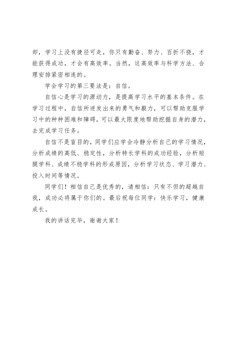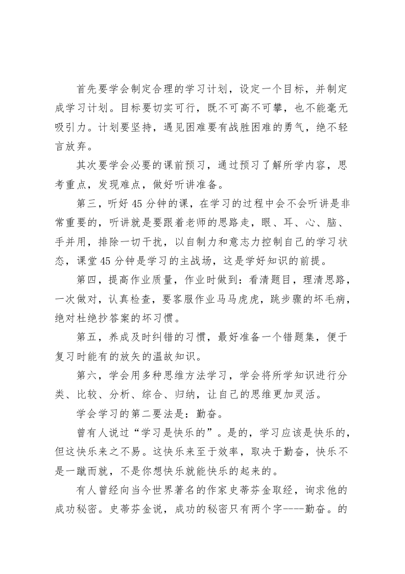 校长在国旗下讲话学会学习,提高自我学习水平同学们:早上好!今天我演讲的题目是:《学会学习,提高自我学习水平》。学习,是人类最基本的活动之一,它不但关系到人的生存和发展,也是关乎人类文明推进和延续。人类改变自身的力量在于学习。联合国教科文组织特别指出:学习是个人和社会的“内在财富”,“学会学习”是对21世纪人才的必然要求。美国著名的未来学家阿尔温托夫勒曾经指出:未来的文盲不再是不识字的人,而是没有学会学习的人。在未来世界,学会学习是每一个人都要面对的时代课题,它将是打开终身学习之门的钥匙,也是进入知识经济时代的通行证。著名的法国数学家笛卡尔说:最有价值的知识是关于方法的知识。中国南宋著名的教育家朱熹也曾说过:事必有法,然后可成。所以学会学习的第一要法是:寻找适合自己的学习方法学习效率是由学习能力决定的,而学习能力其核心就是学习方法,学会学习就是掌握学习方法。学习方法是多种多样,因人而异的,要根据自身的特性寻找适合自己的学习方法,然后内化为自己的良好学习习惯。那么高中阶段应形成那些良好的学习习惯呢?