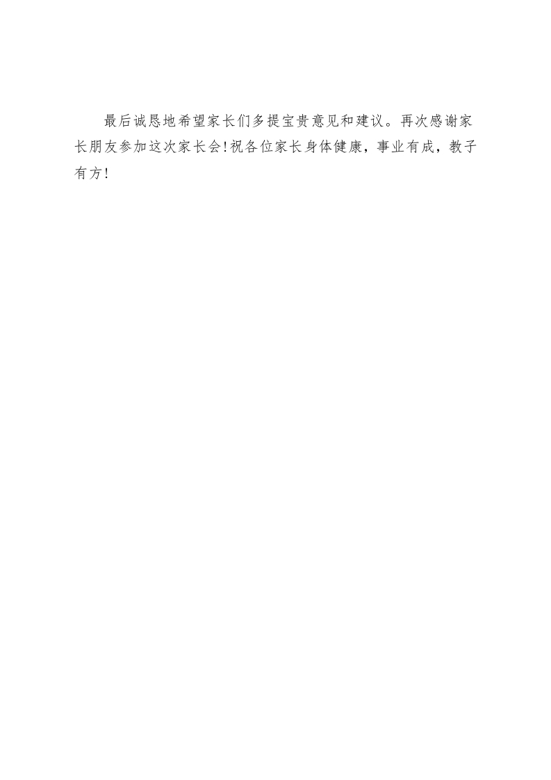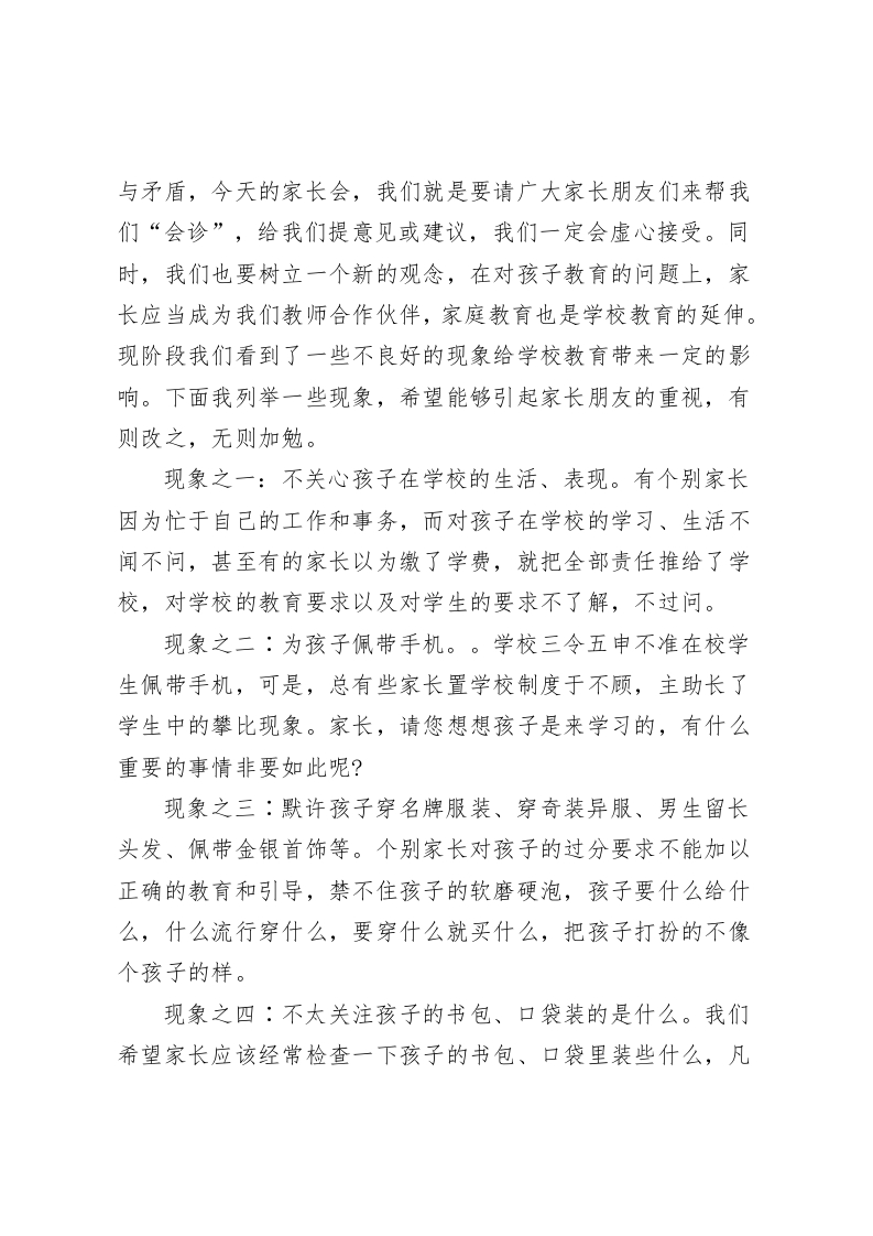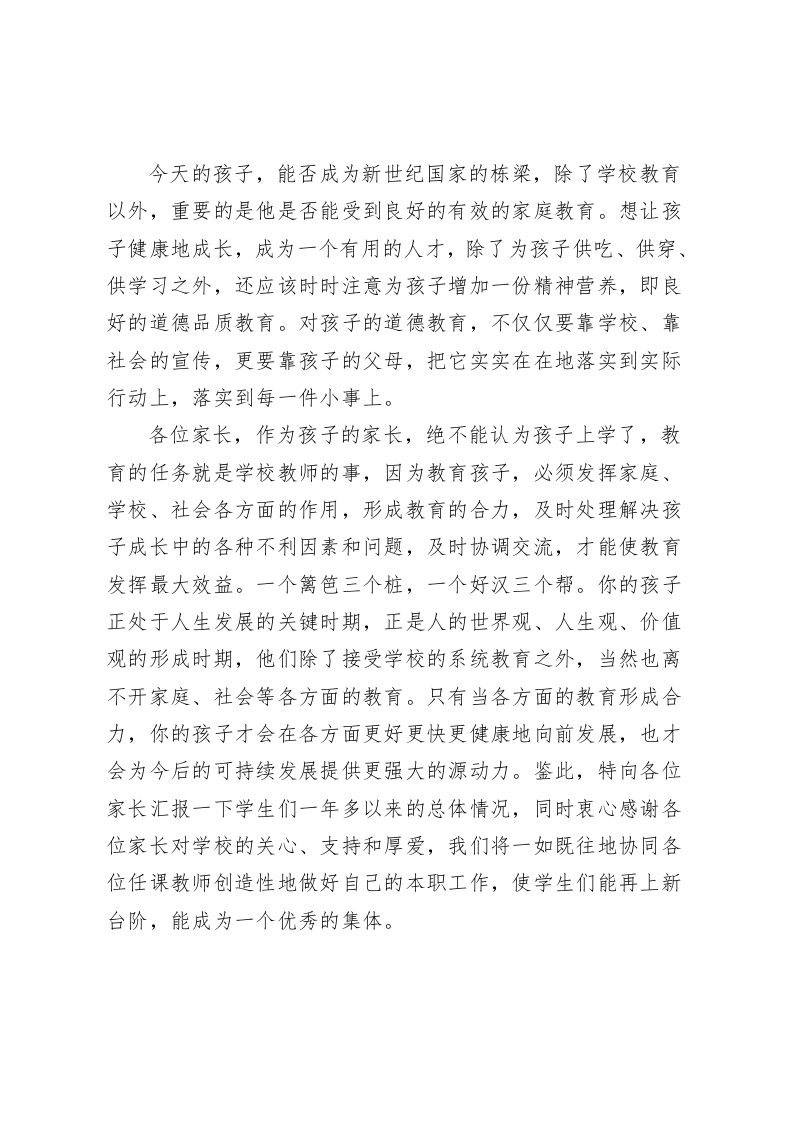 校长在家长会上发言做一个与时俱进的现代家长尊敬的各位家长、老师们:你们好,在此,我首先代表全校师生,向多年来一直理解、关心、支持我校发展的各位家长,表示热烈的欢迎和最诚挚的谢意。今天,我们聚集一堂召开由学生家长和老师们共同参加的座谈会,其目的是为了沟通和交流教育子女成才的经验,拉近家长、老师和学生之间的距离,增进理解,共同分析子女在学习成长中的各种积极因素和不利因素,制订目标,采取措施,家校结合,齐抓共管,形成学校、家庭和社会教育的合力,实现我们共同追求的目标,让每一个学生都学会做人、学会求知、学会做事、学会合作,健康成长,成为对社会、对人民有用的人才。在此,我首先代表全校师生,向多年来一直理解、关心、支持我校发展的各位家长,表示热烈的欢迎和最诚挚的谢意。家长朋友都很关心自己的子女这两个月来在学校的学习情况,关心三中、关心初二年段的学习风气。家长朋友,您把孩子交给了我们,我们有责任,也有义务把孩子教育成人、成材。孩子既需要成绩,也需要成长,教育不是一蹴而就的,我们要尊重教育规律,对孩子一些不良的习惯,需要给我们时间来进行转化,家长心情可以理解,我们的心情也和您一样。为了所有孩子的未来,为了每个家庭的嘱托,我们肩负着光荣的使命,我们深知身上的担子的分量,尽管我们用心、用心、再用心,但是我们的管理中可能还会有许多疏漏,还会存在有许多问题