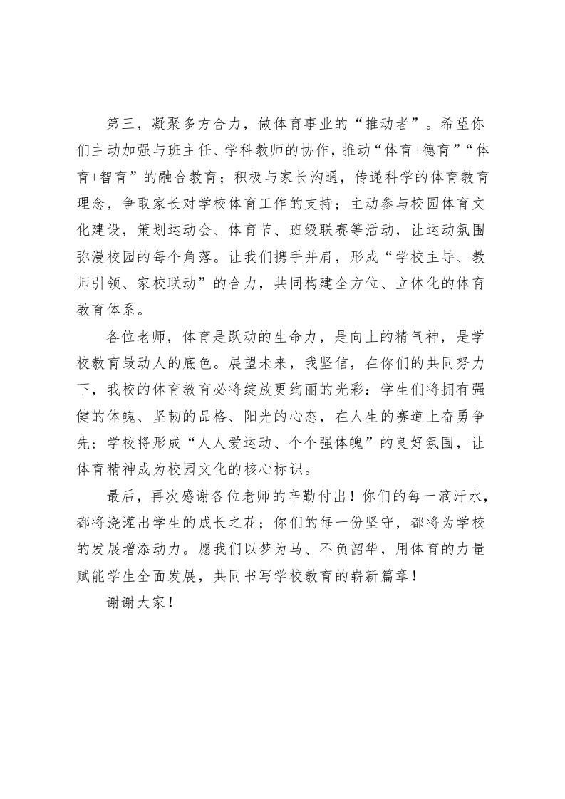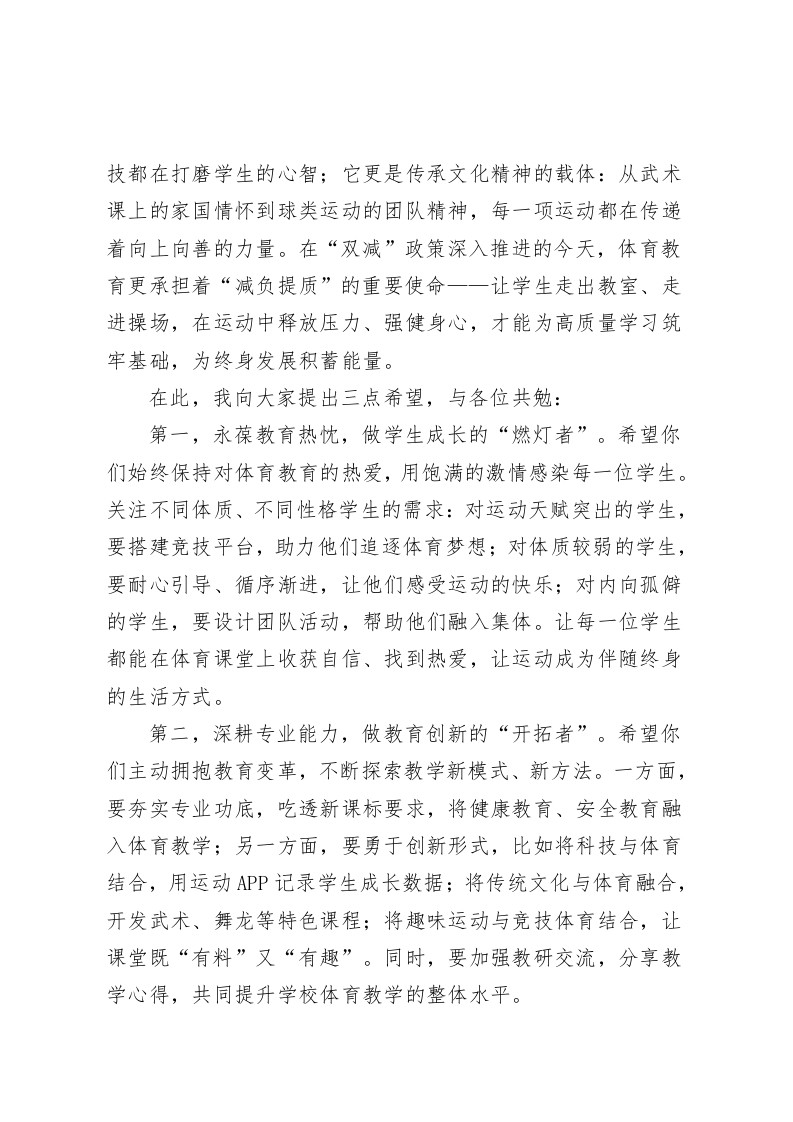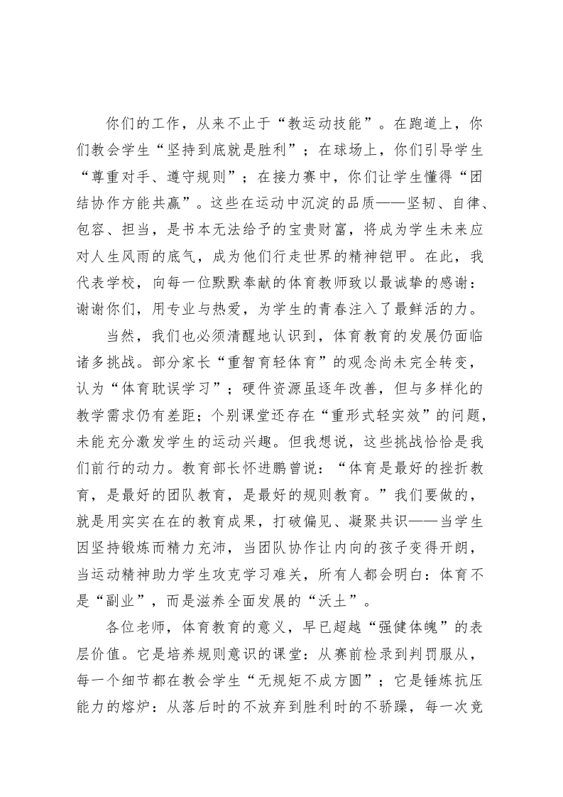 校长在体育教学工作会上讲话:把“体育课”上成学生一生的“必修课”尊敬的各位体育教师:大家好!今天,阳光正好,暖意融融,我们怀着对体育教育的赤诚与热爱齐聚一堂,共话使命、共商发展。作为校长,每当我漫步校园,看到运动场上你们带领学生奔跑跳跃的身影,听到此起彼伏的呐喊与欢笑,心中总有无限感慨:你们是校园里最具活力的耕耘者,是学生成长路上不可或缺的引路人,体育教育更是学校“五育并举”育人体系中最具生命力的重要支柱。回望过往,我们的体育教育之路,写满了各位的坚守与付出。清晨的操场,你们顶着晨曦调试器材;傍晚的余晖中,你们陪着学生加练备战赛事:烈日下、寒风中,你们用汗水浇灌着每一颗年轻的心灵。还记得去年区运会,李老师带着田径队队员连续三个月早训晚练,膝盖旧伤复发仍咬牙坚持,最终带领团队斩获团体季军;还记得张老师为了让内向的学生融入集体,设计“趣味接力赛”“团队拔河”等特色活动,让原本孤僻的孩子在运动中收获了友谊与自信;更记得疫情期间,你们连夜录制居家锻炼视频,编写趣味健身手册,让“停课不停练”真正落地一一这些看似平凡的瞬间,串联起学校体育教育的温暖记忆,也让“健康第一”的教育理念深深扎根在每个学生心中。