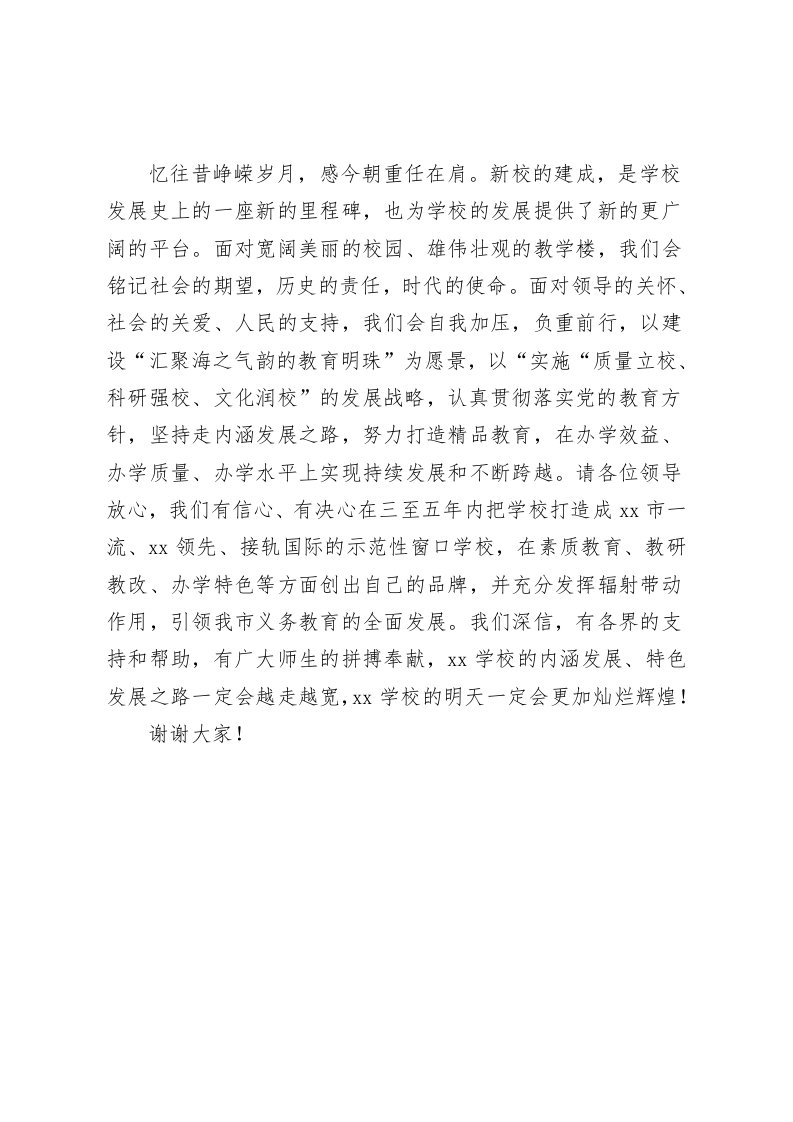 新校区落成校长讲话忆往昔峥嵘岁月,感今朝重任在肩尊敬的各位领导、各位来宾、老师们、同学们:大家好!在这象征收获的美好季节,我们怀着无比喜悦的心情相聚在这里,隆重举行新xx学校落成典礼。在此,我代表全校3000余名师生员工,向出席今天庆典的各位领导、各位嘉宾表示最热烈的欢迎!向长期以来支持、关心学校发展的领导和社会各界人士表示最衷心的感谢!20xx年春,市委、市政府着眼我市教育均衡发展的战略和城乡一体化的大趋势,决定将xx学校与xx中学合并,建设一所新的xx学校,并将此列为当年的“十大工程”。这一决策,充分反映了广大群众的愿望,为数千个家庭的孩子享受优质教育资源提供了便利:这一决策,也彻底消除了制约两所学校的发展瓶颈,为学校迈向更高目标创造了条件,是一件实实在在的“民心”工程。在学校建设中,市委、市政府主要领导多次亲临现场,听取各方意见,解决施工中遇到的问题;经济开发区、xx街道等各级政府、施工单位、相关部门及社会各界,都对学校建设给予了高度关注,提供了大量的帮助。在这里,我要代表Xx学校全体师生,向为新校付出心血的各位领导和建设者们致以最崇高的敬意!我们相信,各界的深切关怀必将化为广大师生巨大的精神力量,鼓舞着我们为创建一流的学校而不懈努力!