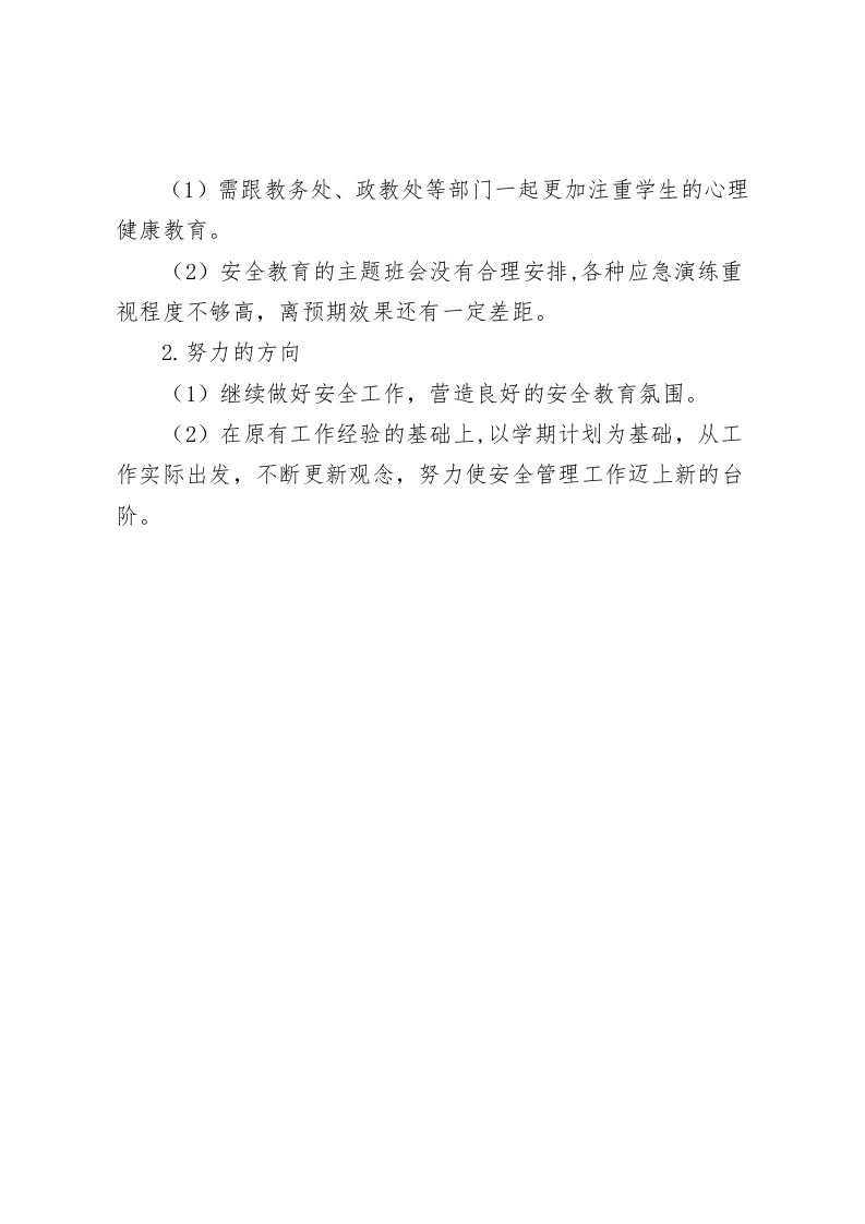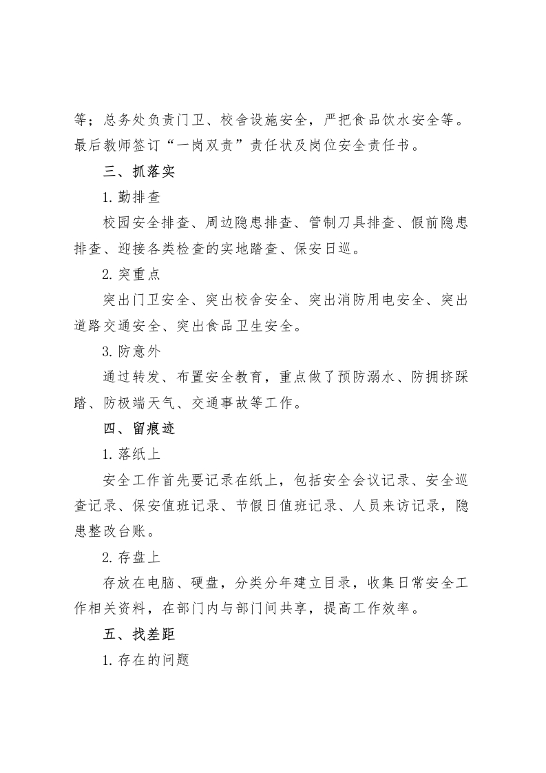 学校安全工作年终总结重教育、明责任、抓落实、留痕迹、找差距老师们:经过对这学期工作的梳理,安全工作总结主要分为:重教育、明责任、抓落实、留痕迹、找差距5个部分。一、重教育安全教育是学校安全工作的重要内容。安全教育做到面向全体、计划先行、形式多样的特点。1.面向全体:重视安全教育,既通过提示、提醒加强对教职工和学生的安全教育,也通过一封信、公众号、微信群等方式加强对家长和学生的安全教育。2.计划先行:学期初根据不同时段和节日特点,制订安全教育计划,将各项安全教育分解到国旗下讲话、主题班会、黑板报、手抄报主题之中。3.形式多样:主要有国旗下讲话、主题班会、安全演练、致家长一封信、公众号等形式进行安全知识宣传教育。二、明职责督促学校落实“一岗双责”,先是校级领导签订责任书,然后部门签订责任书,例如教务处严格作息时间,规范教学行为,防止发生教学安全责任事故;政教处、安全办加强安全教育,规范学生行为,负责集体活动安全组织,防控传染性疾病