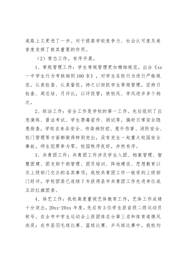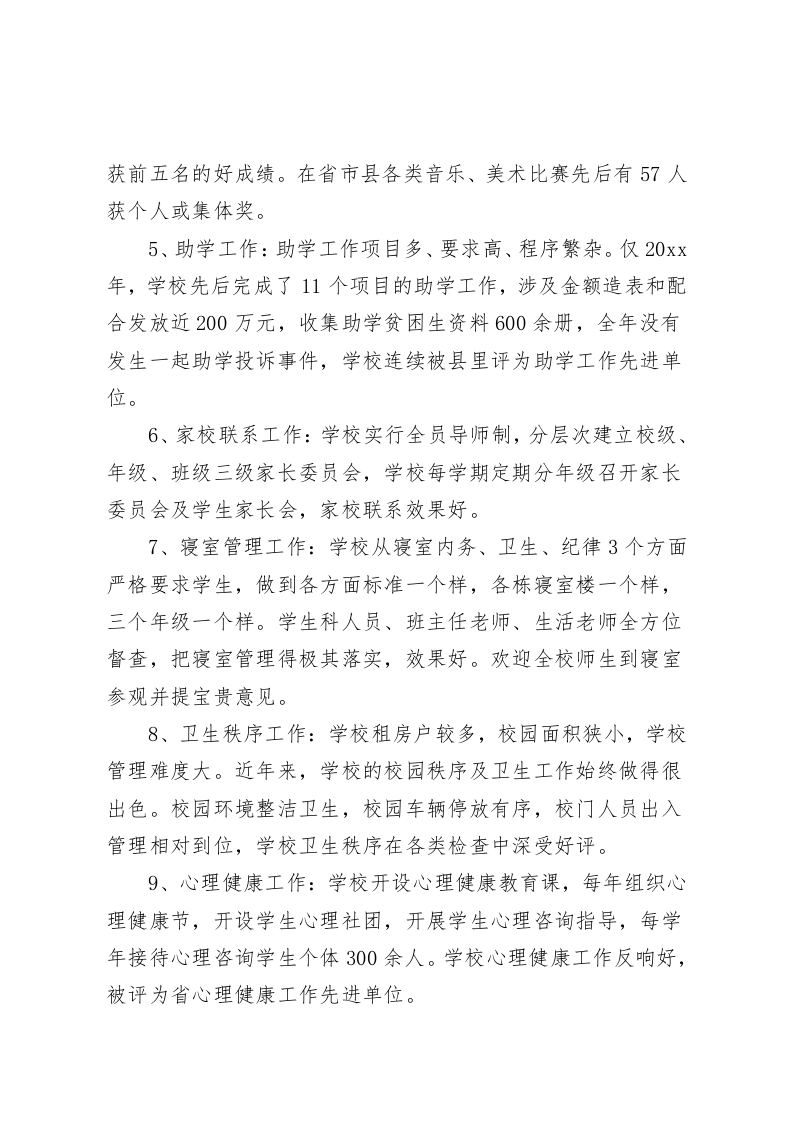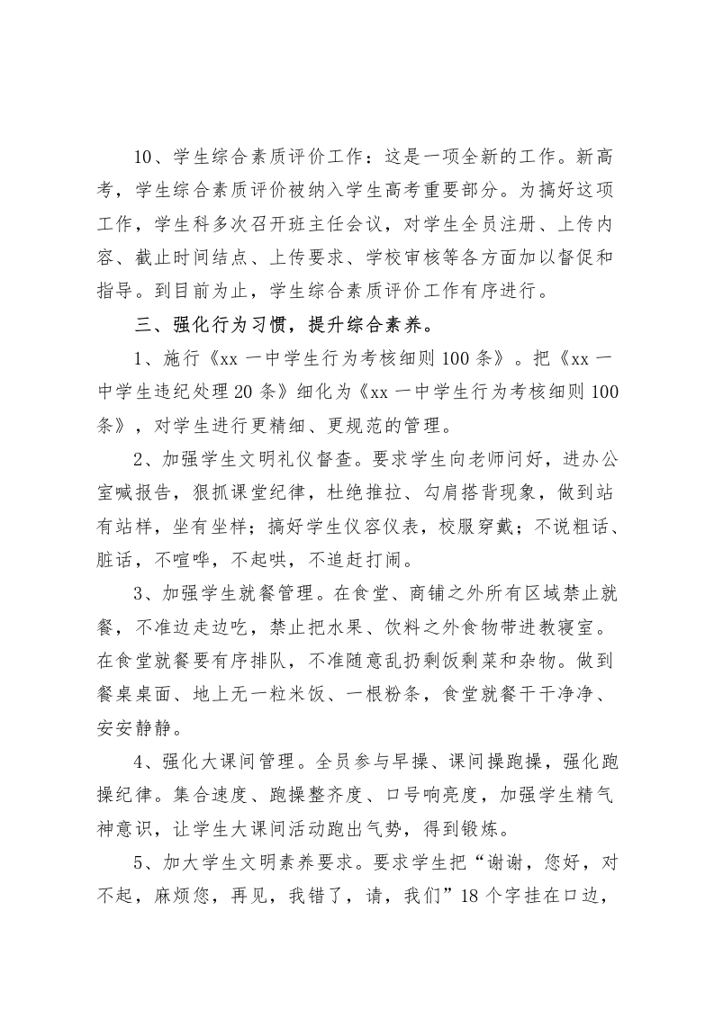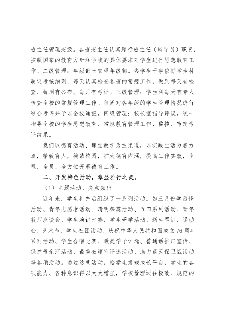 学校德育工作亮点汇报,校长讲话学校愿与大家一道,同心同德,开拓进取,创新德育教育途径,让校园更新、明天更好各位领导、同仁:非常感谢各位莅临我校,现在我向大家汇报一下我校的德育工作,讲的不足之处,敬请各位批评指正。我校德育工作亮点多,效果好。从严从细,反复抓,抓反复,强训练,促内化,让学生感悟责任、文明是做人的基本素质,引导学生由被动心态转化为自觉行动,使学生在校当个好学生、在家做个好孩子、在社会是个好公民。学校先后被评为省文明单位、中小学德育工作先进集体、社会治安综合治理优秀单位、平安校园、精神文明建设工作先进集体、未成年人思想道德建设先进集体、学校安全管理先进集体、消防安全教育示范学校。一、抓实德育常规,实行“四级”管理。我们重视抓实“四、五、八”德育常规:每月四项工作:月思想教育工作、月德育工作例会、月黑板报检查、月星级班级评比。每周五项工作:学生科工作例会、主题升旗仪式、卫生大扫除、主题班会活动、常规管理通报。每天八项常规:校园秩序、校园卫生、寝室管理、校门管理、学生纪律、早操课间操、文明礼仪、安全隐患。坚持实行“四级”管理机制,学生科对照学校《xx一中班级考核细则》,做好教育常规的督查、记载工作。一级管理: