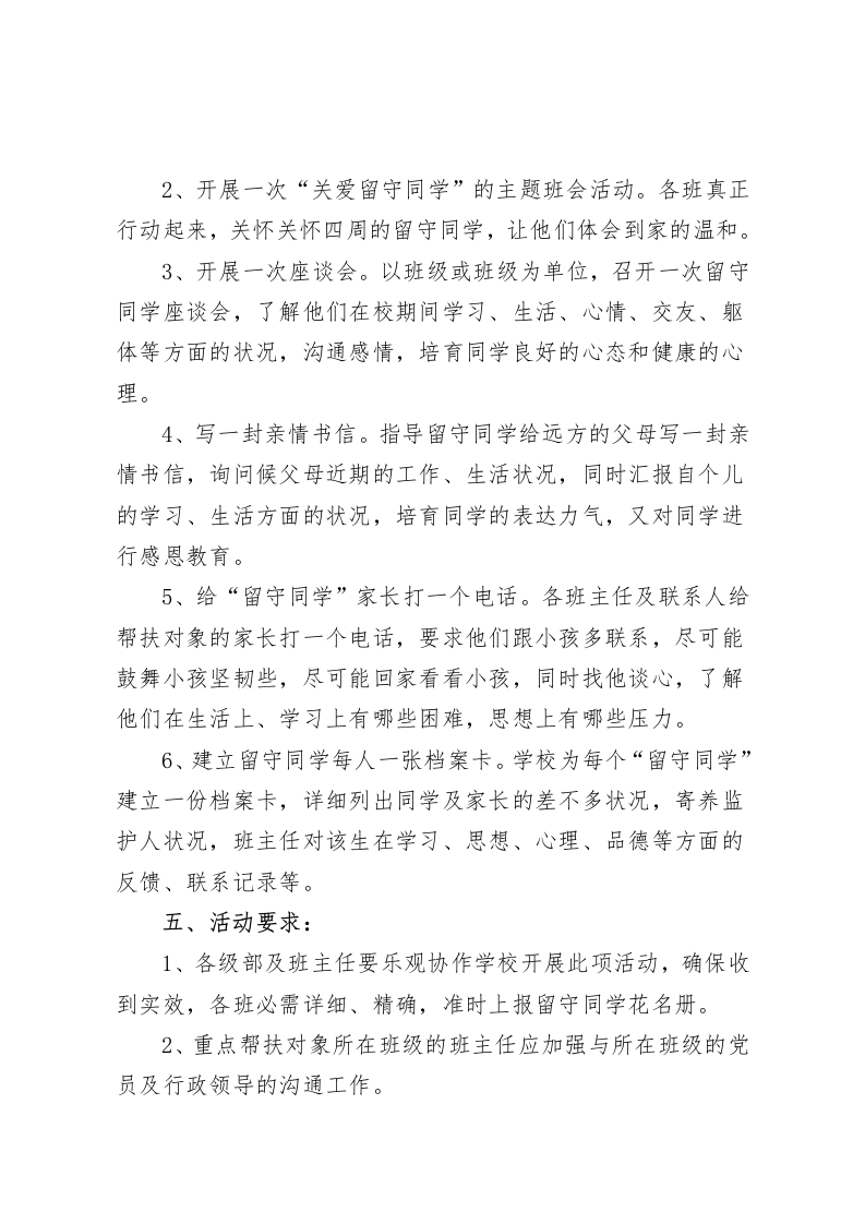 学校关爱留守儿童主题系列活动方案为爱导航,让心回家关爱留守儿童,构建和谐社会。在平安、健康、品德、学业、生活以及心理素养方面进行帮扶活动,对留守儿童进行思想上疏导,学业上辅导,言行上引导,生活上关怀,树立留守同学自强独立精神,保障留守儿童合法权益,为留受儿童营造健康、公正、和谐的成长环境。为此特制定以下活动方案。一、活动主题“为爱导航,让心回家”,携手关注留守儿童。二、组织领导组长:副组长:成员:三、活动目的为了进一步解决我校农村留守儿童实际询问题,为我校留守儿童供应爱的关怀,对农村留守儿童这一特别群体,针对“留守儿童”在确定程度上关怀解决留守儿童的生活、学习困难和情感、心理询问题,让他们得以欢快健康地生活和成长。四、活动内容1、进行一次升旗仪式。进行一次关于“关爱留守同学”为主题的国旗下讲话,号召全校师生都来关怀他们,关注他们的成长。