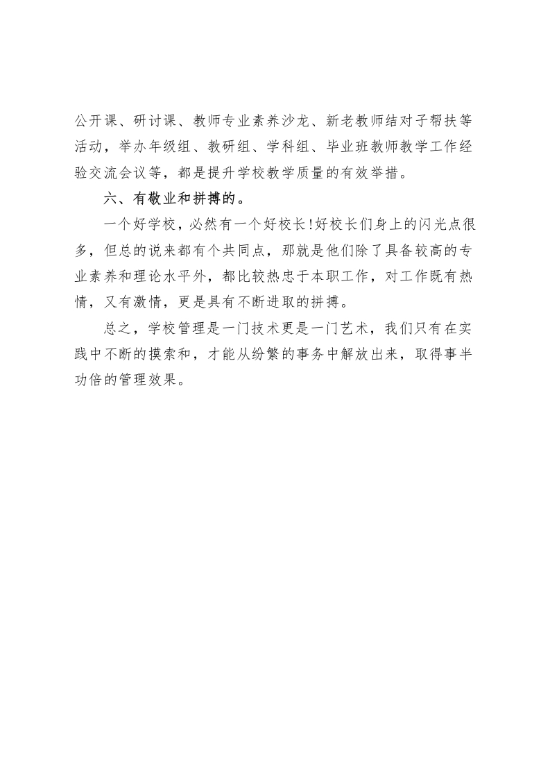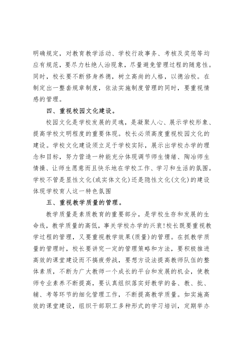 学校管理经验交流,校长发言学校管理是一门技术更是一门艺术尊敬的各位校长:大家好!当一名校长,我认为在守住安全底线,不踩纪律红线的前提下,要力争做到以下几点:一、有自己的办学理念和。“有思路才有出路,有想法才有办法”,思路决定出路,作为一校之长,要认真思考如何办好学校,要在正确的指导下,切合社会形势的要求和学校发展的客观实际,确立好学校的办学理念和目标。二、重视团队的建设,做到合理分工,大胆授权。在学校管理中,校长要对自己工作的目标正确定位,当好一个者,要站在全局的高度对学校管理工作做好总体部署和统筹安排,做好一个出色的决策人。同时,校长要在搞好协调配合的前提下对学校的具体工作进行详细的分工,对学校班子及管理人员大胆放权。在平时的管理过程中,校长要作好“参谋长”,帮助管理人员出主意、想办法,深入了解计划的执行情况,及时帮助教职工努力实施计划。三、依法治校,以德治校。要使学校管理有序和学校得以可持续发展,校长必须建立一整套规范合理的规章制度,对学校各个岗位的责、权、利作
