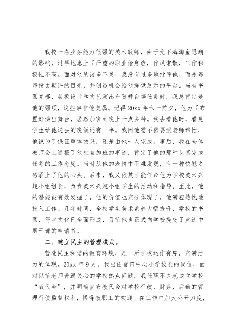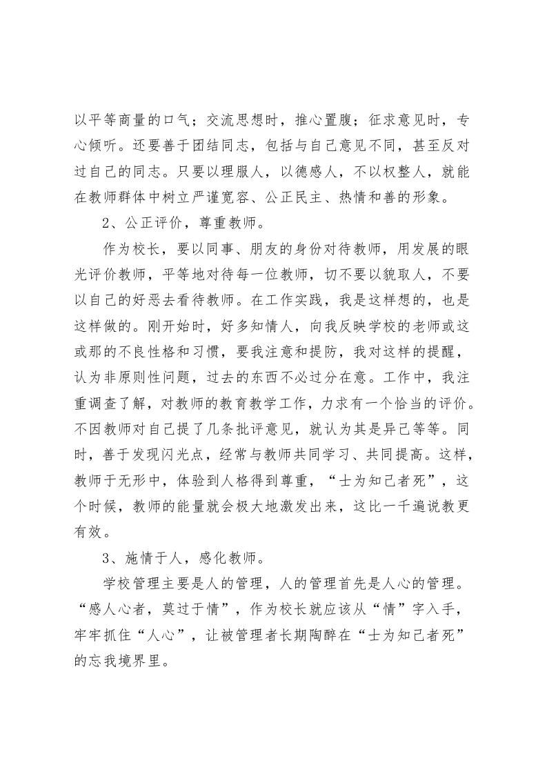 学校管理经验交流,校长就学校如何实施人性化管理谈了意见尊敬的各位领导、各位同仁:大家好!根据教育局领导的要求,让我在这里作学校管理经验交流。说实在的,面对各位行家里手,我毫无经验可言。但既然局领导作了安排,我也就勉为其难,在各位面前“班门弄斧”一回,不到之处,请不吝赐教。我向大家汇报的题目是“实施人性管理,构建和谐校园”。人性化管理是指充分关注人性要素,引导并规范人的行为。它的根本目的是在信任、尊重、激励中完善和发展人。常常伴随管理环节给人提供成长和发展机会,以满足人的正当需求。它使管理在原有基础上更具生命力,做到管而不死,活而有序,有效地调动人的自我教育、自我管理的积极性和主动性。下面我就学校如何实施人性化管理谈点自己的浅见:一、创造温馨的工作环境。创建宽松温馨的工作环境对于人的教育、感染和转变有着重大意义,能最大限度地发挥教师的潜能。1、注重沟通,凝聚教师。凝聚人心,积众人之力,依靠和相信教师,是办好学校的关键。校长是学校的管理者,在管理过程中,要做到坦诚相见,以诚待人。在同教师相处中把他们当同志和朋友。讨论工作时,