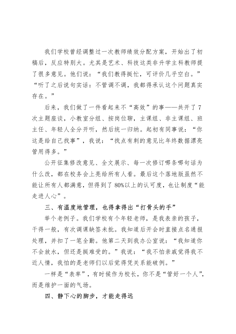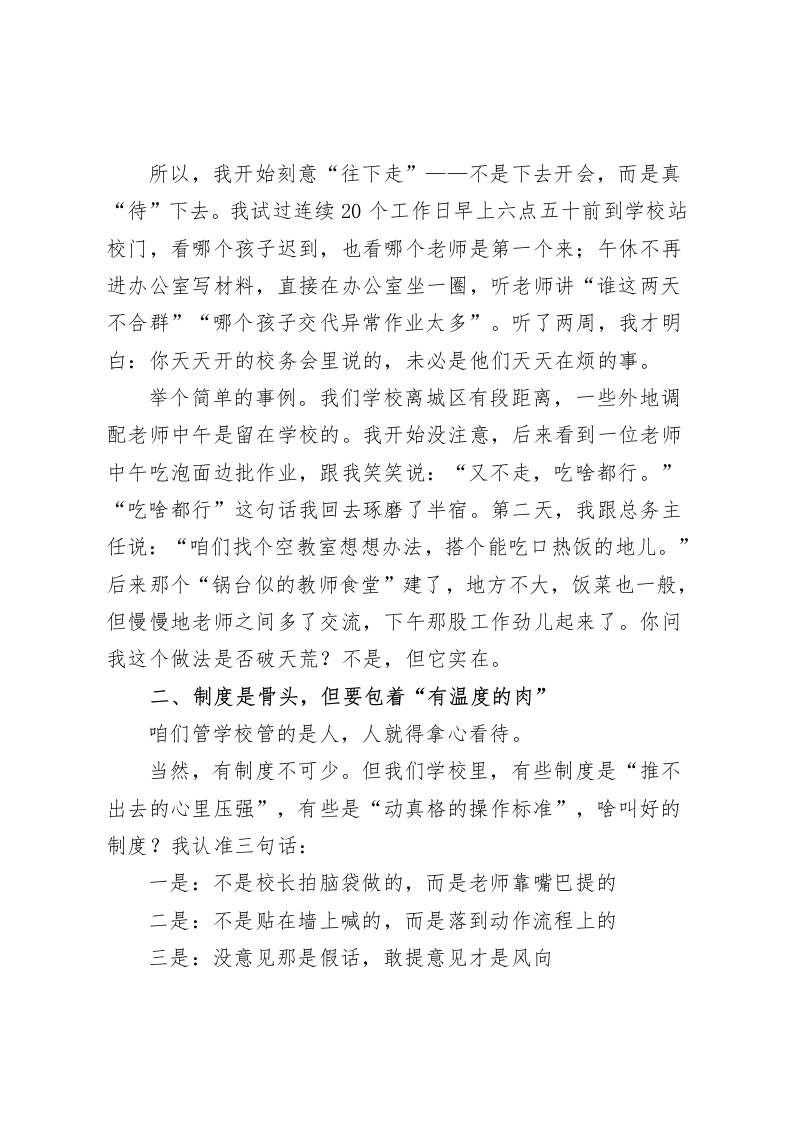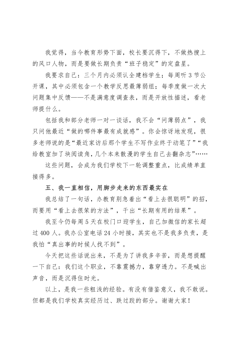 学校管理经验交流会,校长讲话:传疯了!20年校长改变了3000尊敬的各位领导、在座的校长同仁们:大家好。今天能站在发言席上,说几句我们学校在管理上的做法和体会,说实话,我有点忐忑。在座的不乏有几十年办学经验的老校长,也有创新力特别强的中青年骨干。相比之下,我就是土办法扎呵呵用了20多年,和同事们摔打出来点路数,不算先进,只能说有些感觉,是在一线一个一个试出来的。今天我就从一个常年“往校门口跑、往办公室钻”的老校长角度,讲点咱们工作里真实碰到的人和事,谈不上经验,抛砖引玉。一、越是“动不得”的学校,越要静下心来干点“笨功夫”我干过几所不同类型的基层学校,有城区的,有郊区的,也接手过“遗留问题”比较多的校点。刚当校长那几年,说给自己听也说给别人听,总是想“要大刀阔斧干一票大的”。结果头几年啊,真是拿了不少年终“好评”,可回头一看,真让教学提质、让老师服气、让孩子受益的,其实没几件。有段时间我们搞了好几套制度:绩效调整的、岗位竞聘的、作风评议的。文件一发,飞速上墙,实施两周,满墙贴纸就是没人看。有个老教师私下找我聊了十几分钟,他说了一句话:“校长你下文件的速度,总赶不上我们吃饭的现实。”我心里那下挺不是滋味的,但也正是从那天开始,我发现很多事,不能靠一个“校长中心”的视角来看。