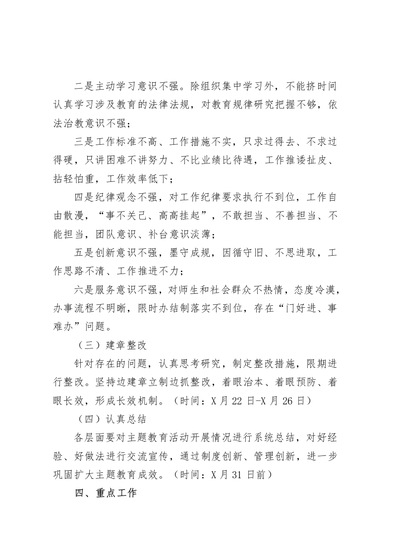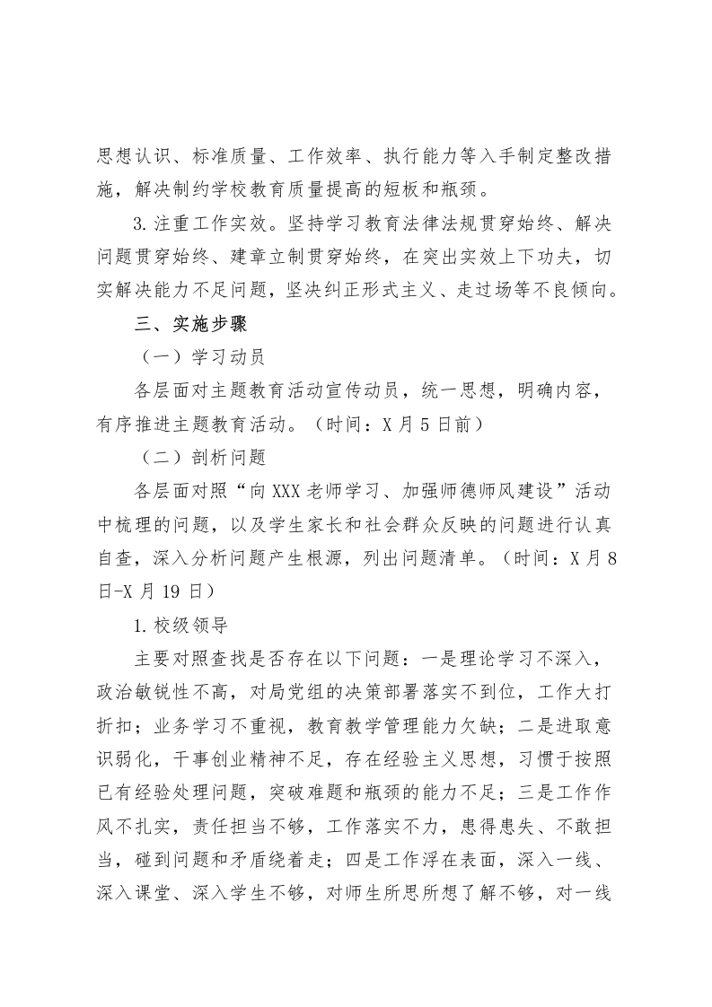 一XX学校“正作风、严校风”主题教育活动实施方案根据《XX市教育系统“正作风、严校风”主题教育活动实施方案》,结合我校教育教学实际,着力解决现行工作中存在的突出问题,使我校教育教学管理更趋规范、科学,确保202X年圆满完成学校的教育教学任务。决定从202X年X月1日开始,开展为期一个月的“正作风、严校风”主题教育活动。现制定活动方案如下。一、指导思想全面落实立德树人根本任务,以“正作风、严校风”为着力点,深入开展学习教育,建立完善规章制度,着力解决制约教育改革发展的作风不实、校风不严、学风不浓等问题,增强下沉意识、服务意识、法治意识,进一步锤炼团结、务实、高效的工作作风,营造校风严、教风正、学风浓的校园文化氛围,提高教育教学质量,打造人民满意的学校。二、工作原则1.坚持分层开展。为了增强针对性,这次主题教育将校级领导作为一个层面,年级管理作为一个层面,学生管理作为一个层面,部门处室作为一个层面,分类指导,分层开展。2.坚持问题导向。积极倡树“讲政治、讲学习、讲团结、讲担当、讲效率、讲纪律”工作标准,聚焦工作作风、学校校风、教师教风、学生学风等方面查找的突出问题,从宗旨意识、