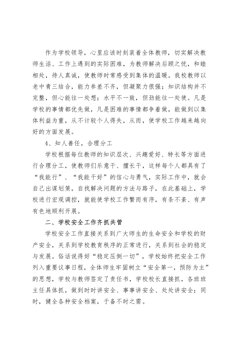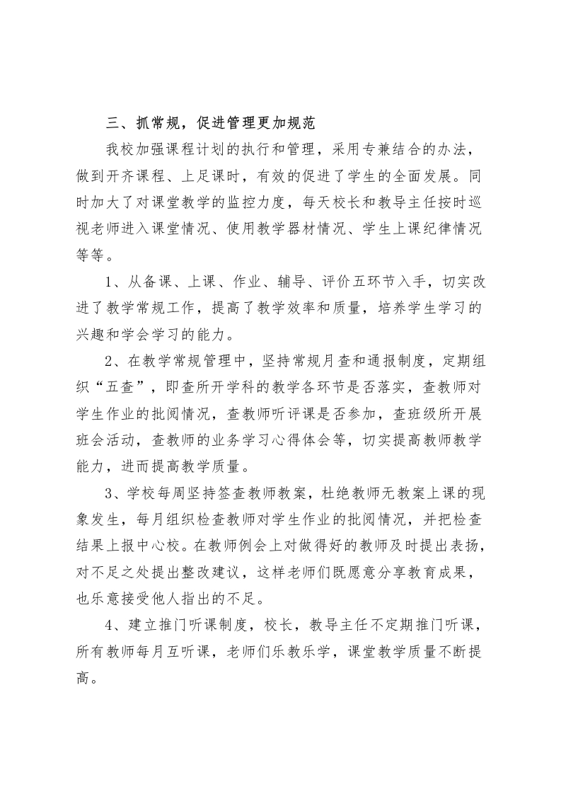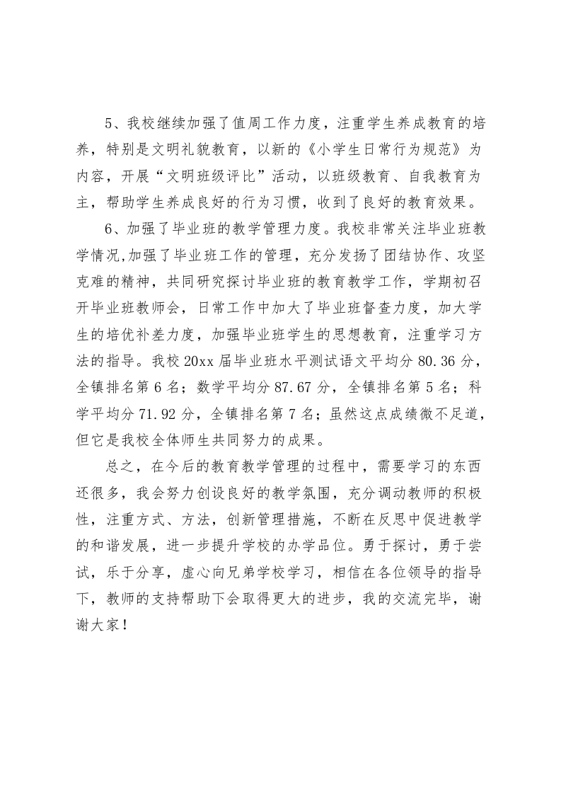 学校教育教学管理交流,校长发言努力创设良好的教学氛围,充分调动教师的积极性尊敬的各位领导、同仁:大家早上好!很荣幸,今天能站在这里和大家一起交流教育教学管理方面的问题。首先,感谢中心校领导的关心与厚爱,同时也感谢一直默默支持和帮助我的各位教师,因为有了你们的关心、支持,xx小学才有今天的成果。面对新的教育形势,怎样进一步加强教学管理、提高教育成效,是我们共同面对的课题。下面我将我校的教育教学管理方面的一些做法和体会,和大家一起探讨和交流,不当之处,敬请批评指正。一、抓管理促规范1、科学管理,以人为本学校发展,教师为根本;提升质量,管理是关键。我校以组建团结和谐的教师队伍为基础,充分调动教师的积极性,通过人文的管理,使我校的面貌发生了很大的变化。2、人人参与、民主管理在管理上实行人性化的管理。我认为好的团队不是管出来的,对学校事务,广泛争取教师的意见,在畅所欲言的基础上,制定决策,不搞独断专行,使教师敢说心里话、愿说心里话,时刻把自己当成学校的主人公,愿意为学校的发展献言献策。3、待人以成,激发潜能