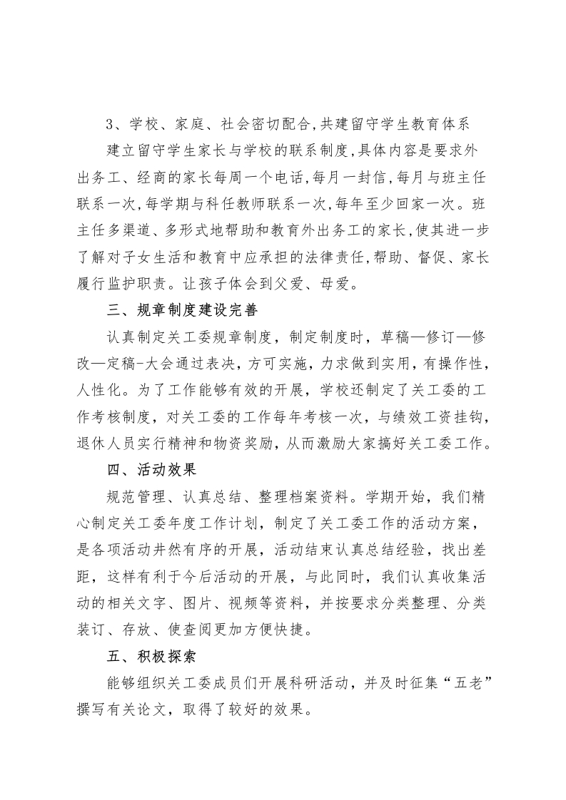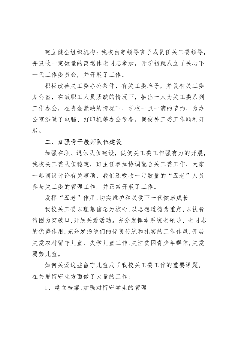 学校五好关工委自查报告踏踏实实开展好关心下一代工作,为未成年人健康发展做出一份贡献我校关心下一代工作委员会,在教育局关工委和镇关工委的指导和关怀下,以爱国主义为主旋律,以创建“五好关工委”活动为载体,贯彻落实《公民道德建设实施纲要》及《中共中央国务院关于进一步加强和改进未成年人思想道德建设的若干意见》,发挥教育经验的优势,积极开展弘扬中华民族优秀传统为主线的爱国主义、集体主义和社会主义教育宣传活动。踏踏实实开展好关心下一代工作,为未成年人健康发展做出一份贡献。具体做法如下:一、加强领导,重视小组自身建设我们认真做好三项工作,即加强领导工作、健全组织机构、改善办公条件。加强领导工作方面,我校关工委每学年开始我们认真学习上级有关精神,制定年度关工委工作计划,并按计划认真落实各项工作,学期末认真写好工作总结,把关工委工作纳入学校全面工作计划之列,当成一项重要的工作来抓,学期末学校认真做好总结。把关工委工作纳入教育行政议事日程、定期不定期的研究讨论关工委的有关工作,使关工委工作有序的开展,并落到实处。